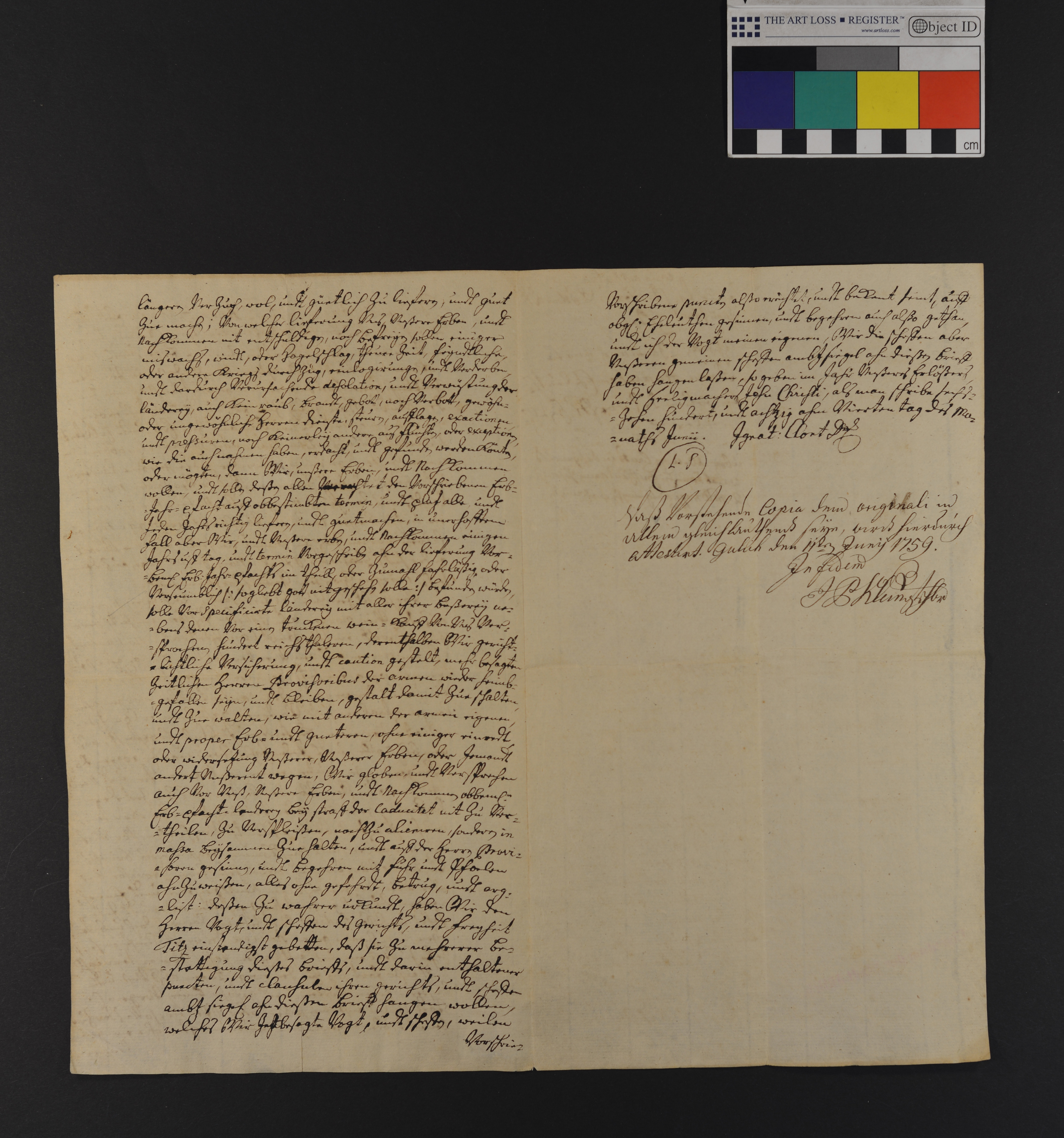 Gordt Baumann und seine Gattin Anna Hamecher, im Dorf Hasselsweiler wohnhaft, versprechen für die ihnen von den Provis. des h. Geisthauses zu Jülich aus gen. im Hasselsweiler Feld gelegenen überlassenen Liegenschaften (weitläuf. Aufzählung) eine Jahresrente von 2 Malter Roggen Rödinger Mass zu liefern und stellen als Caution 100 Rthl. Siegler: Schöffenger. zu Titz. Nachschr. vom 11. Juni 1759 bestätigt die Übereinstimmung von Orig. u. Cop. |