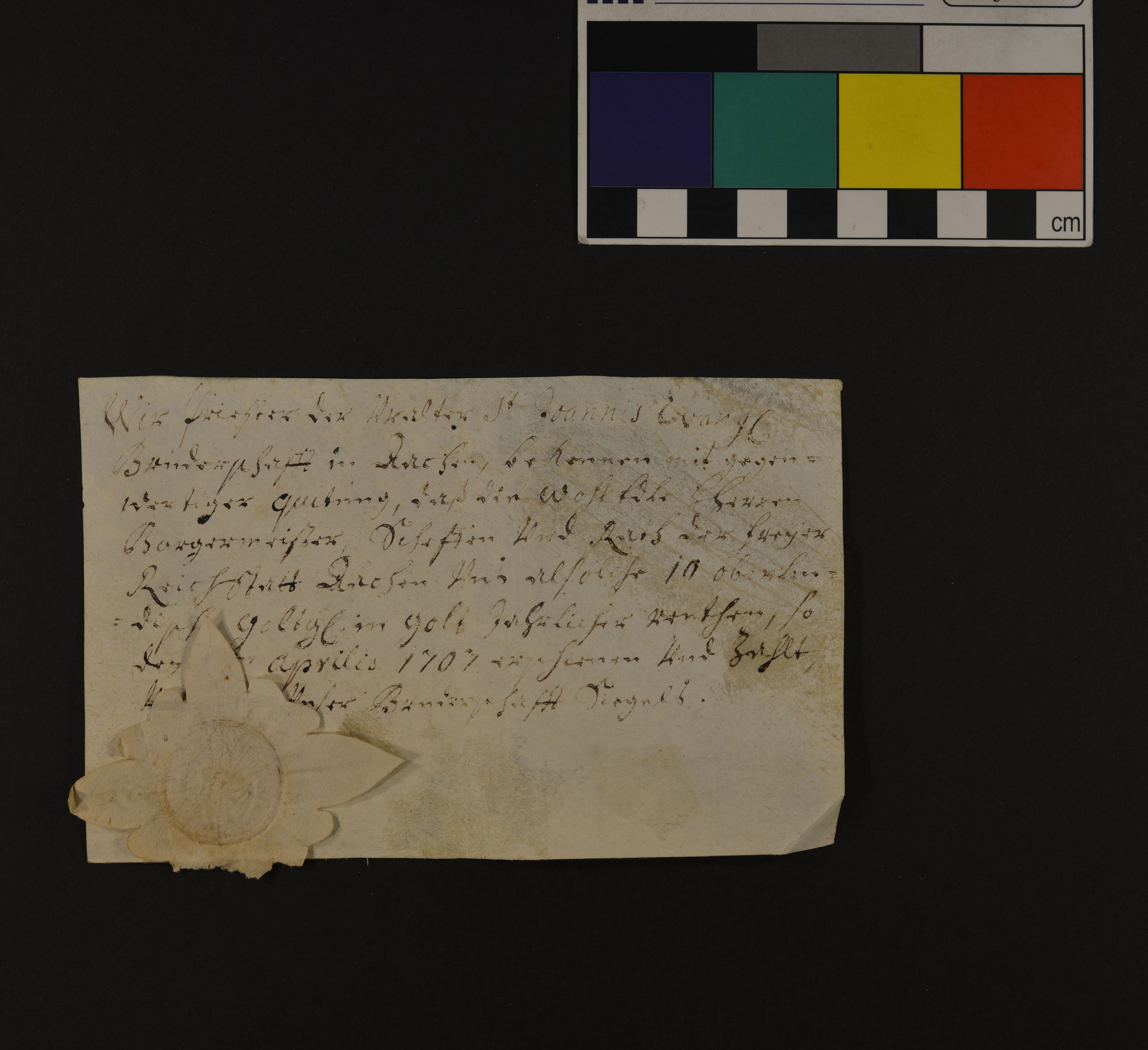 | Der Priester der St. Johannis Evang. Bruderschaft zu Aachen quittiert der Stadt Aachen über Zahlung von 10 oberländ. Goldgulden Jahresrente. |