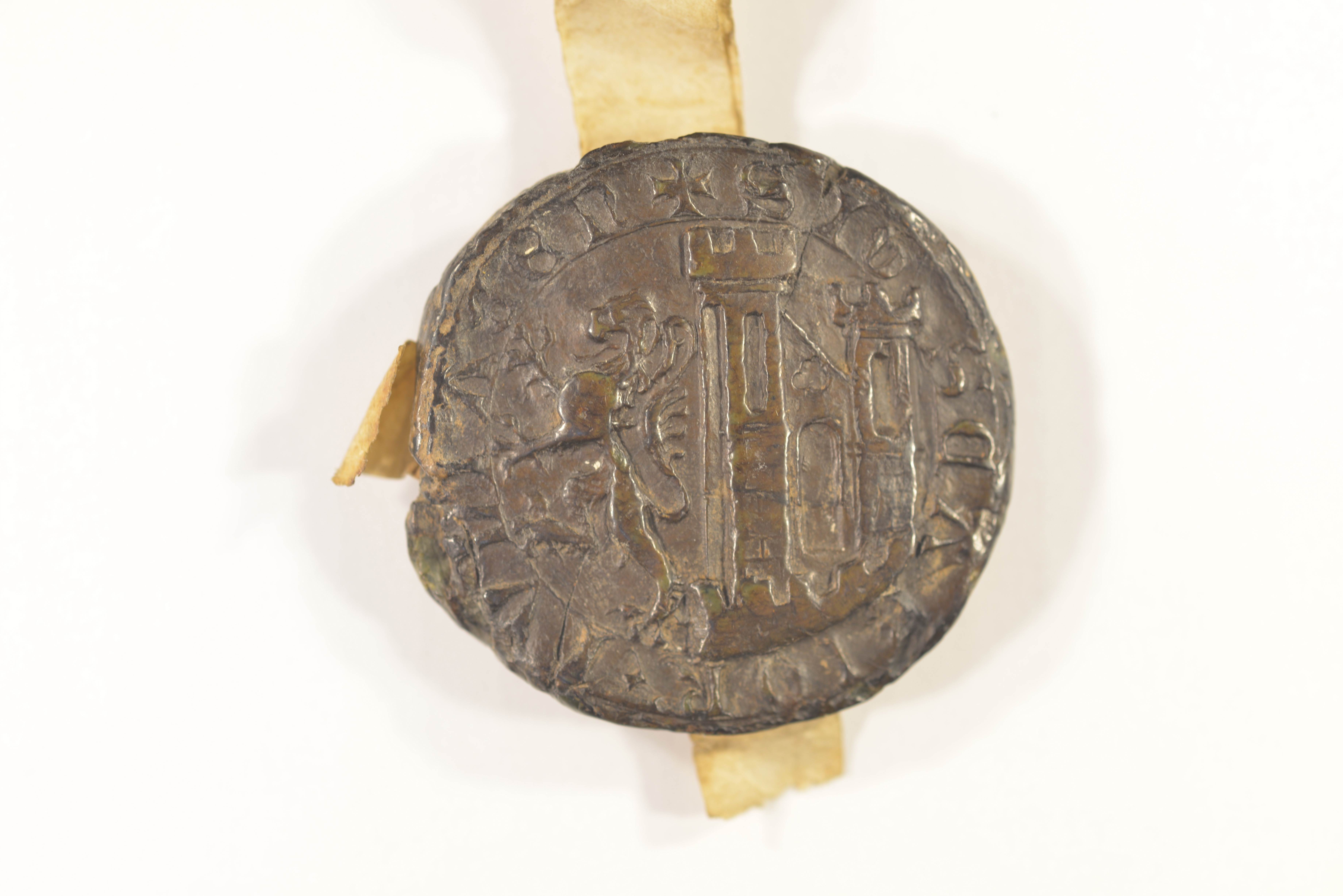 Siegelkommentar: Schöffensiegel von Jülich, rechts nach rechts steigender Löwe, links Stadtmauer mit zwei Türmen