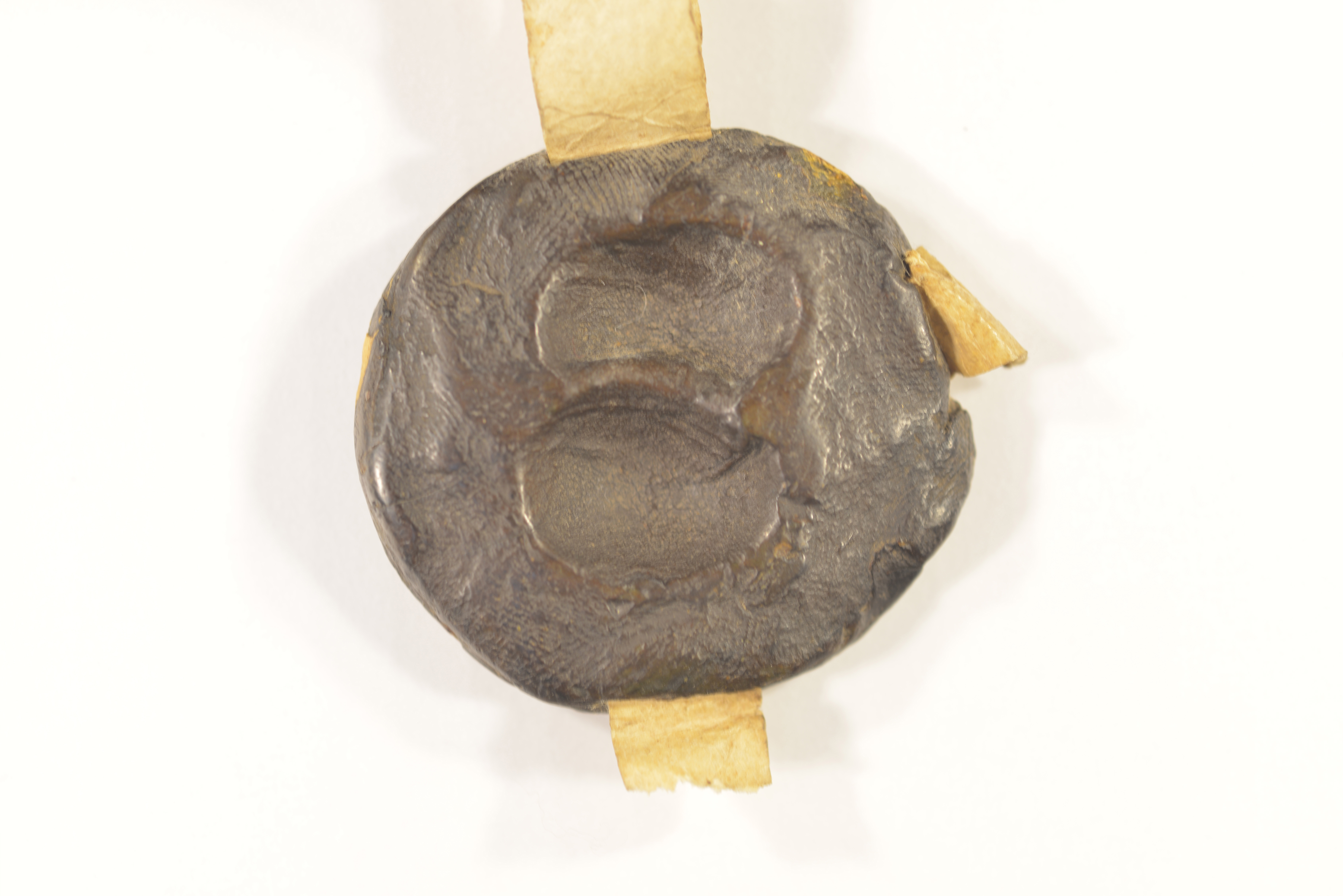 Siegelbeschreibung: Schöffen von Jülich, Rundsiegel an Siegelpressel, Plica, gebrochen, Fragment erhalten, restauriert