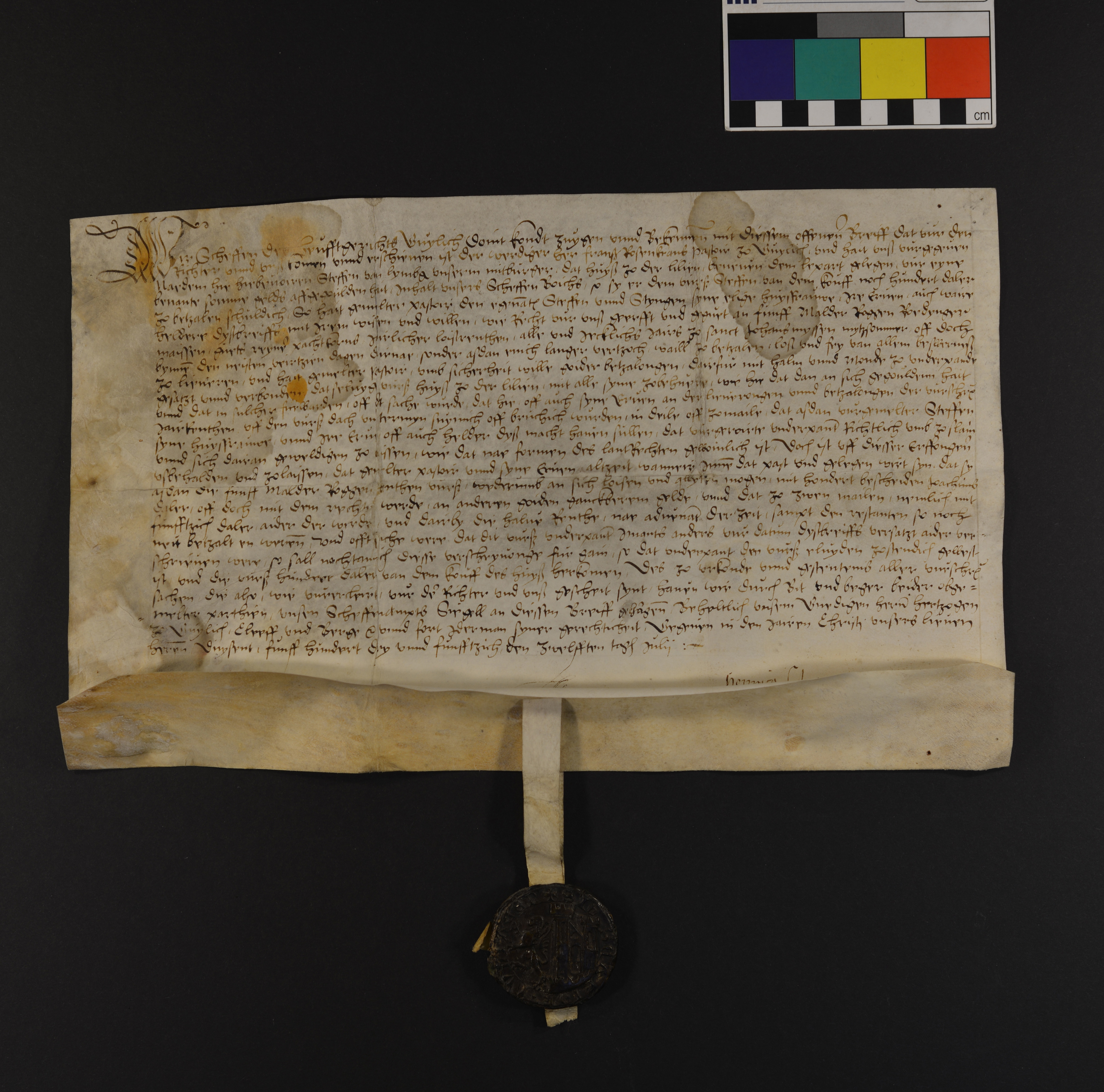 Formalbeschreibung: Höhe: 20,8 cm, Breite: 35,8 cm, Ausfertigung, Pergament, Manuskript, recto und verso beschriftet, 25 Zeilen