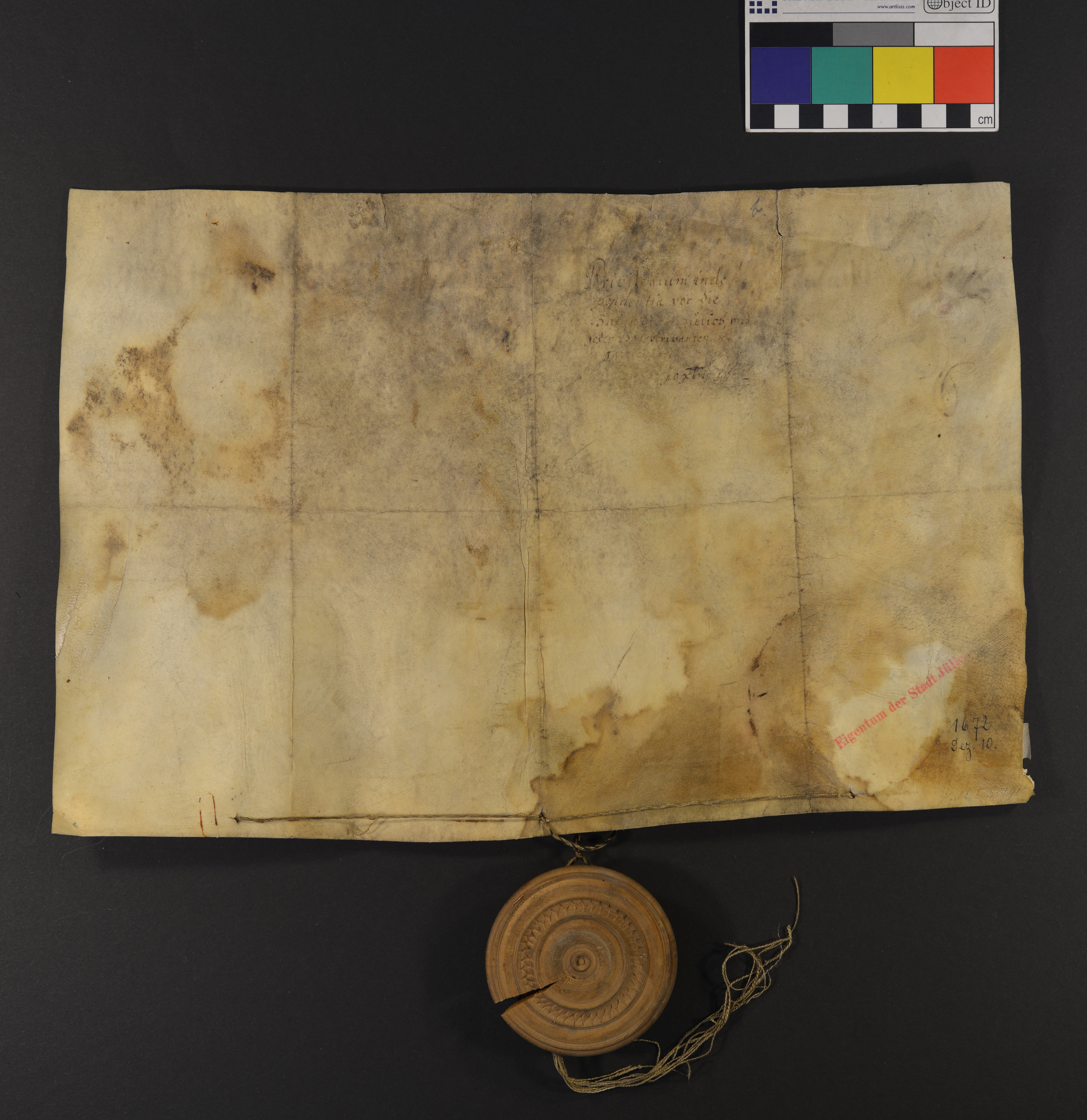 | Höhe: 25 cm, Breite: 39,5 cm, Ausfertigung, Pergament, Manuskript, recto und verso beschriftet, 19 Zeilen |