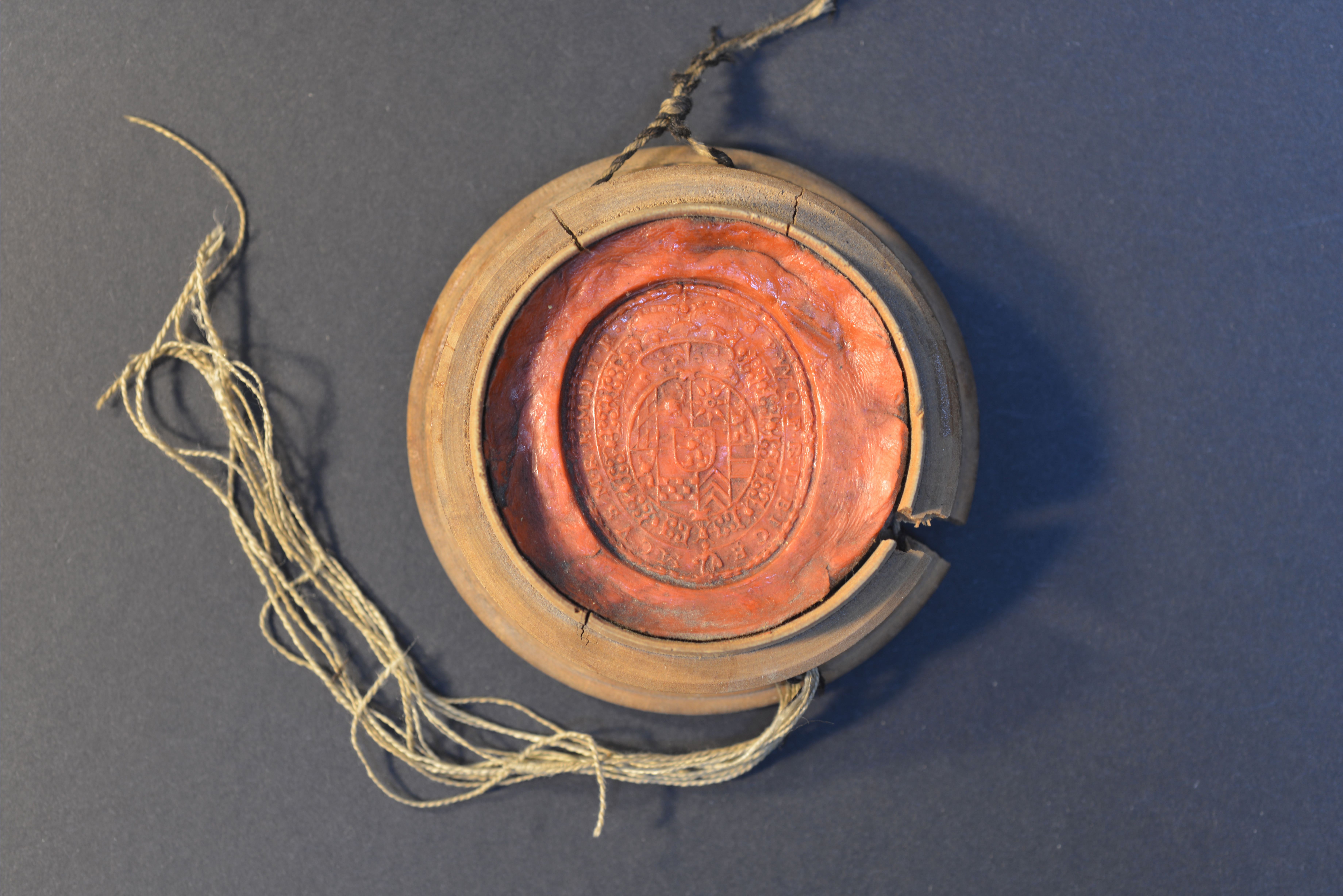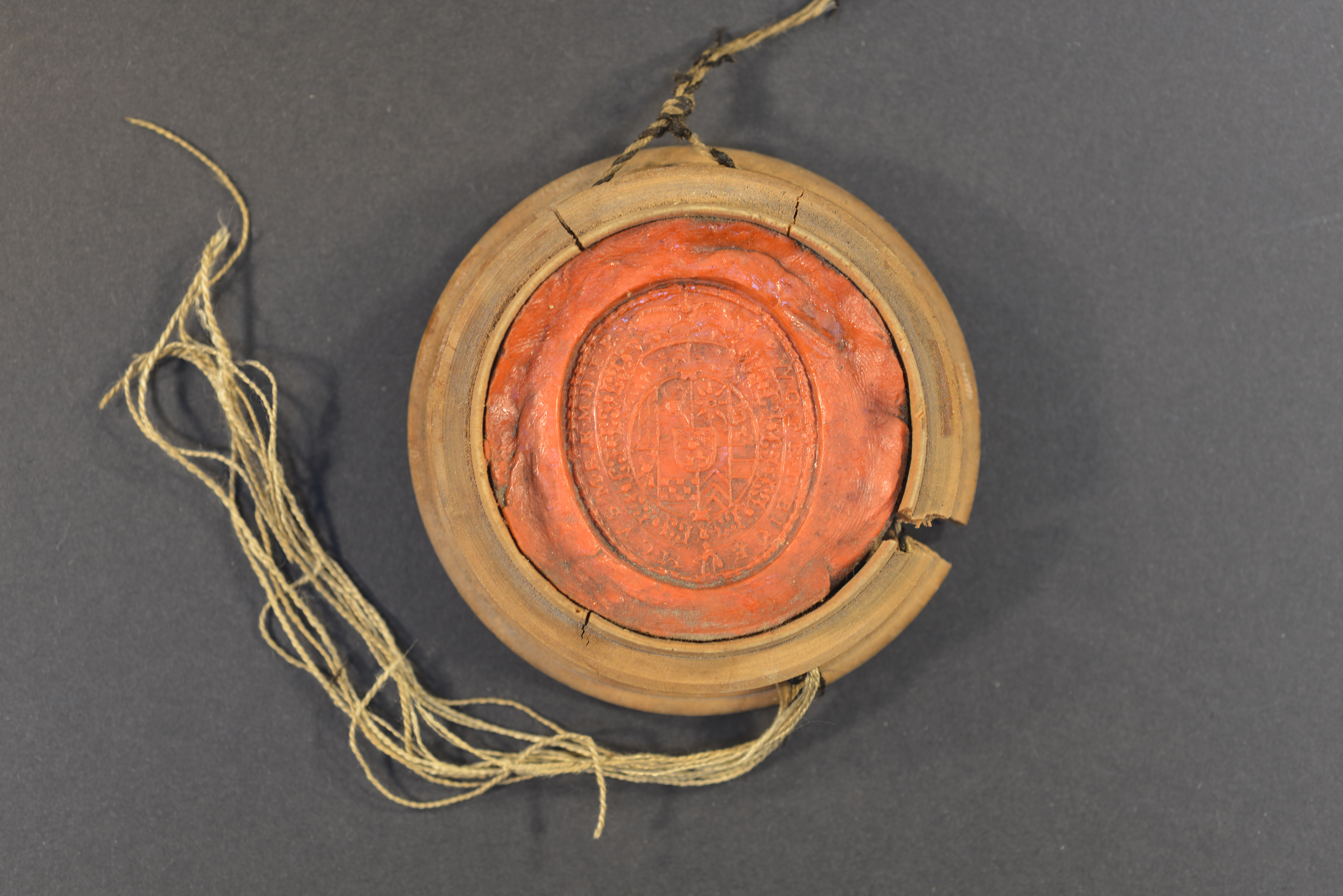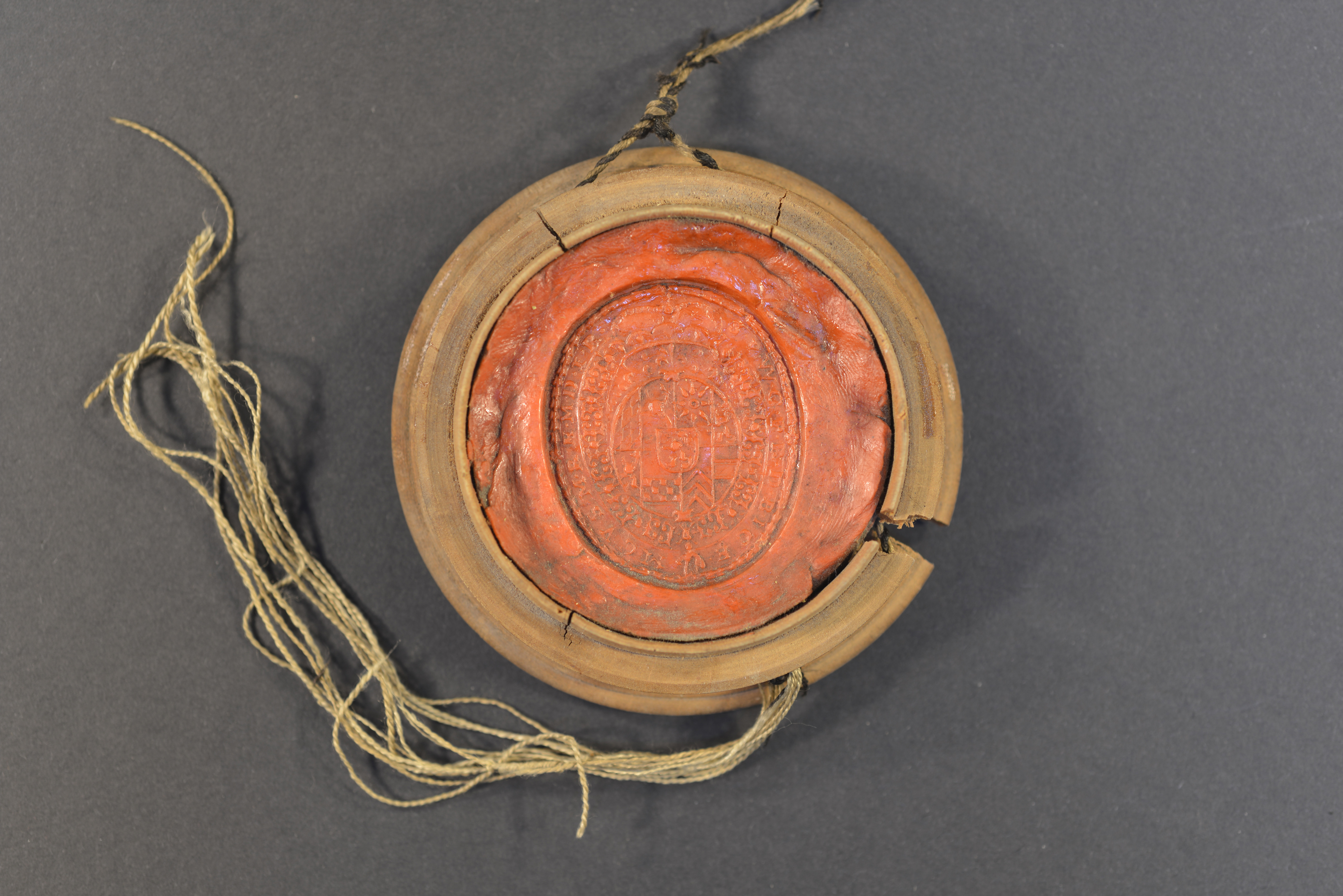 | Pfalzgraf Philipp Wilhelm bei Rhein, Rotes Rundsiegel (Durchmesser: 5,4 cm) in Holzschale (Durchmesser: 7,5 cm). Ovales Stempel im Siegel (Höhe: 4 cm, Breite 3,4 cm) |