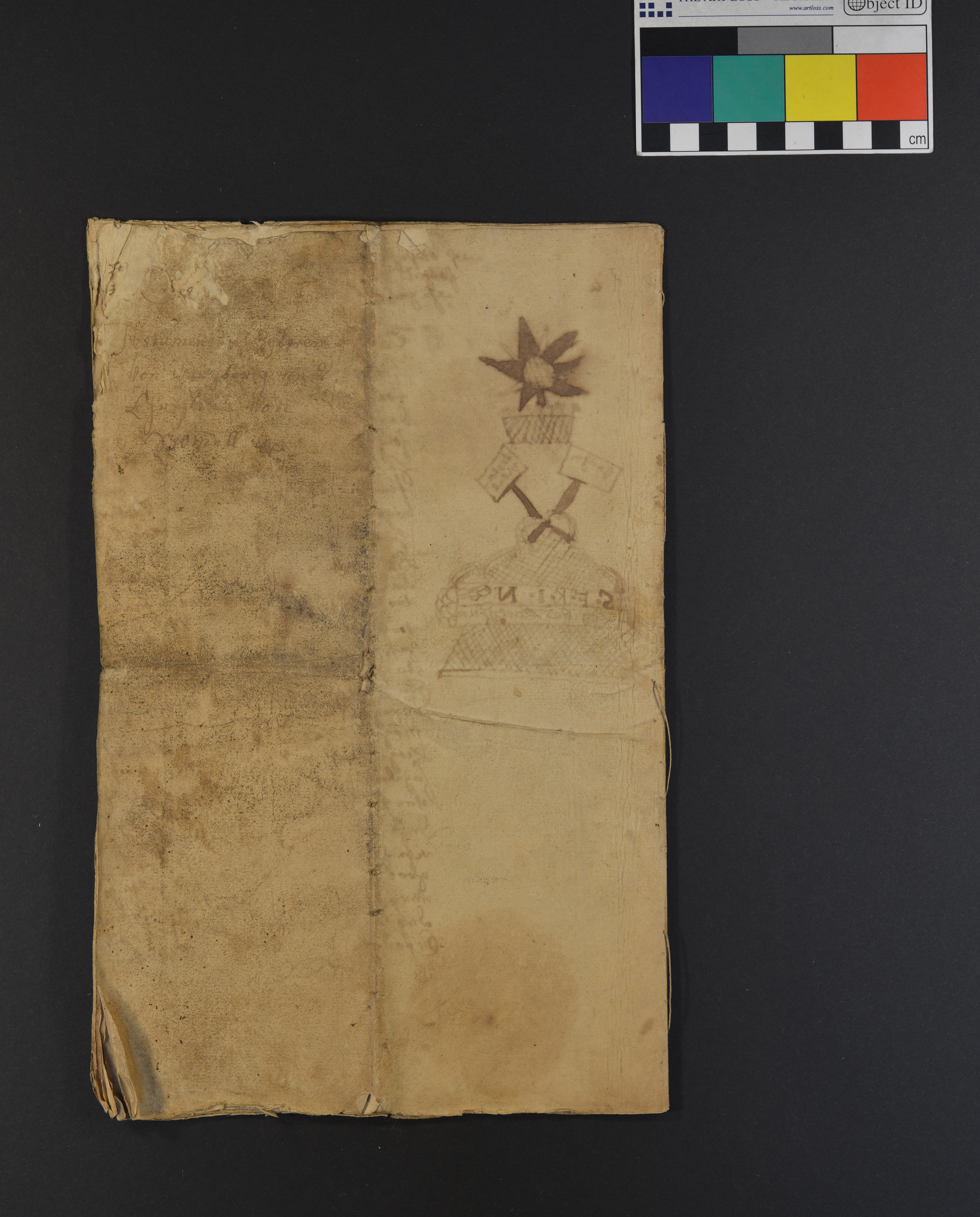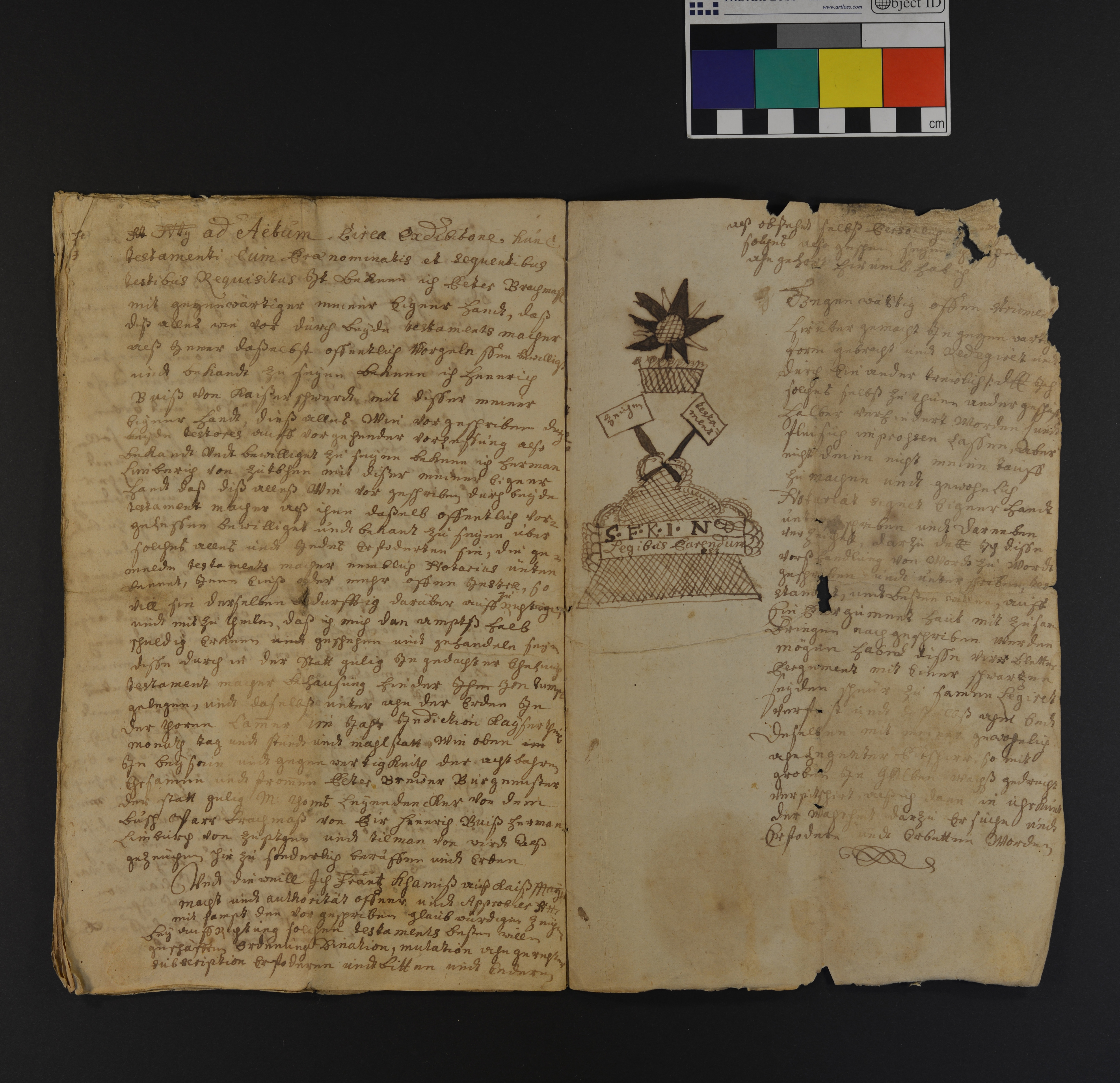 | Inschrift Notariatsinstrument: Zeichen, Urkunde, Legibus Parendum est |