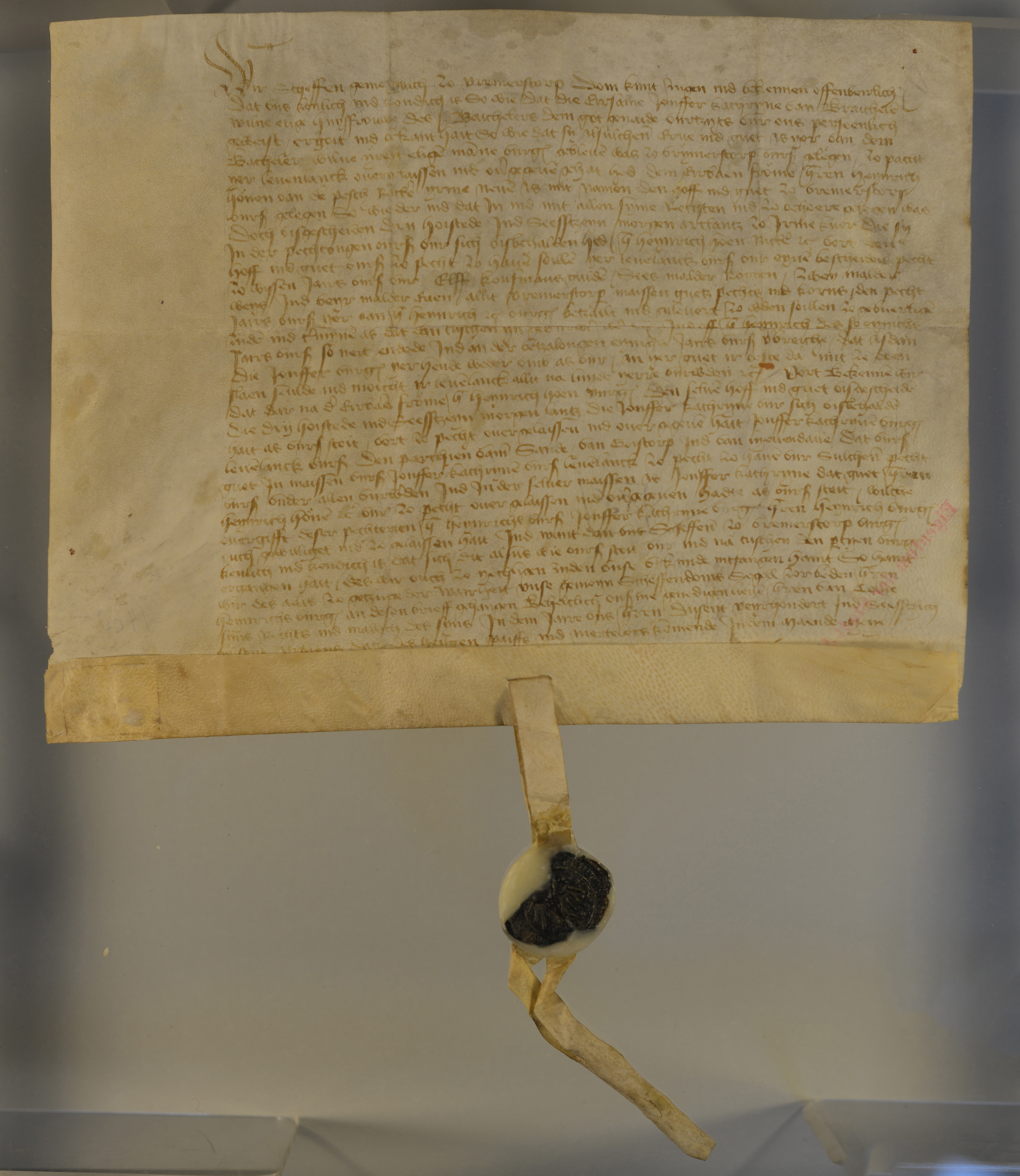 Regest: Wwe. Kathryne van Braichelen überträgt vor dem Gericht zu Vremerstorp ihrem Neffen, dem Ritter Heynrich Hoen van den Pesch ihren Hof zu Vremerstorp ausgenommen "drii hoestede ind 16 morgen art landz" gegen Abgabe einer jährlichen Pacht von 11 Kaufmannsgulden, 6 Malter Roggen, 2 Malter Weizen.