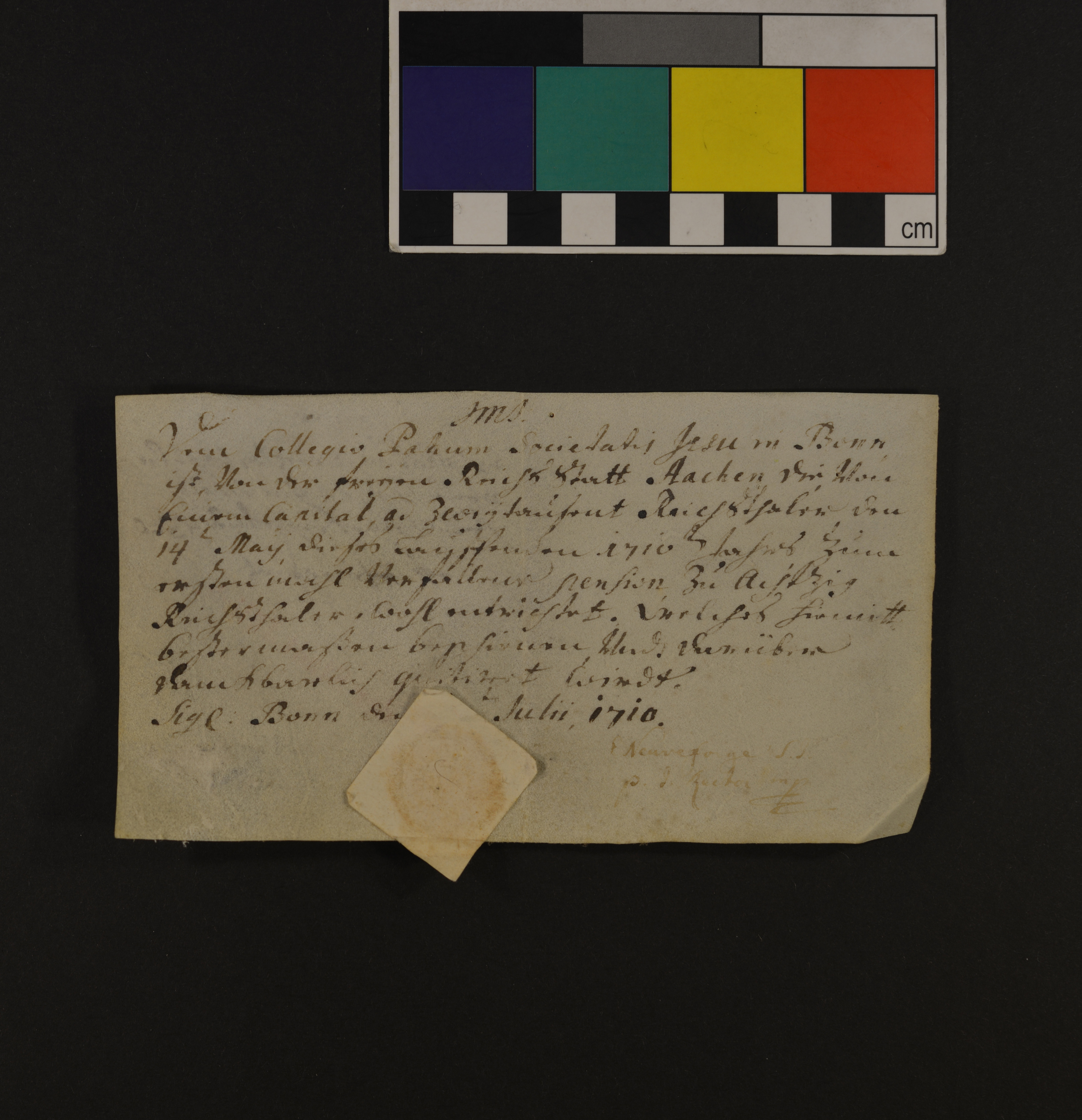 Siegelbeschreibung: Gesellschaft der Jesuiten zu Bonn, Aufgedrucktes Rundsiegel mit rhombischen Schutzpapier, Durchmesser: 1,7 cm