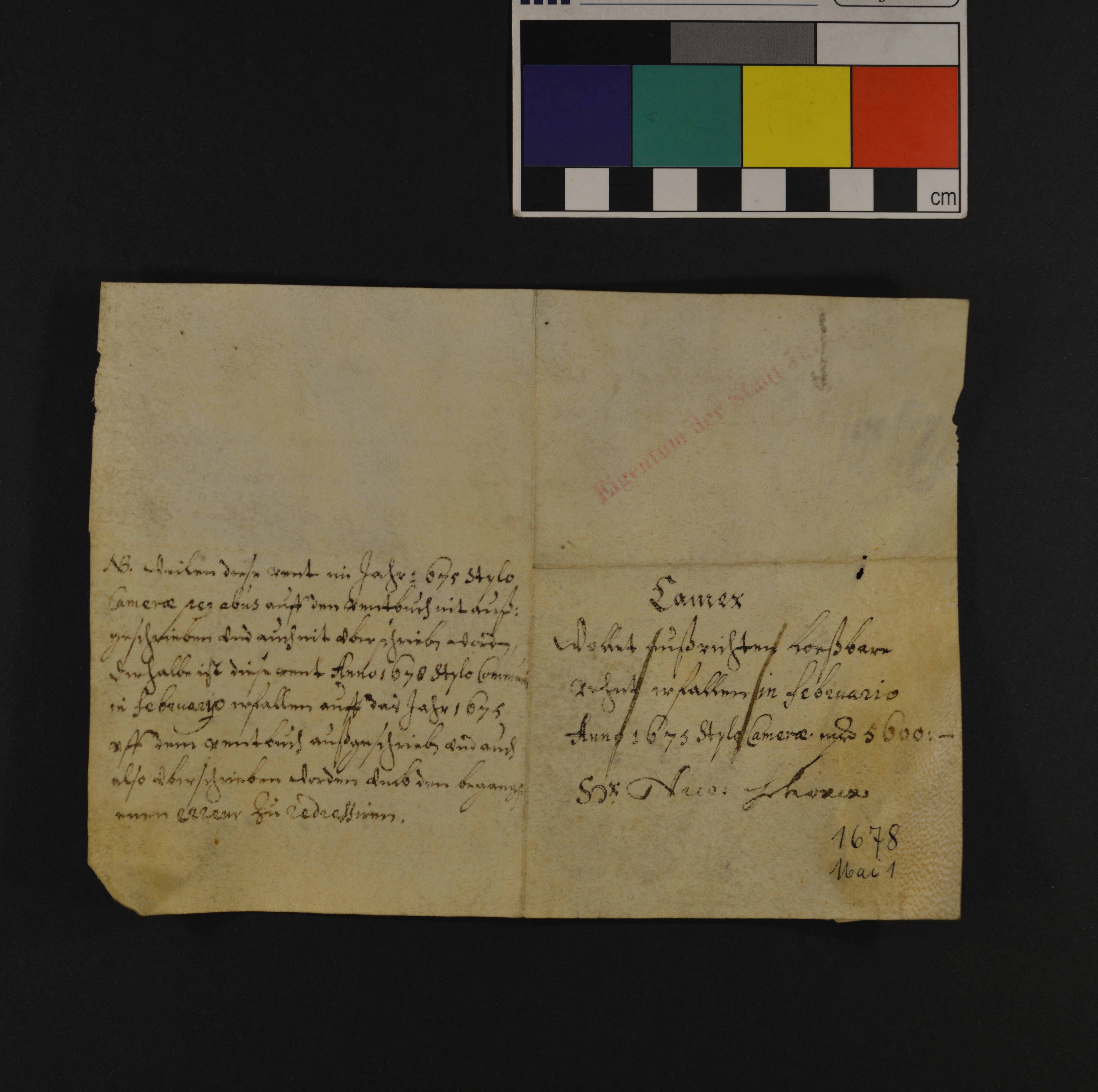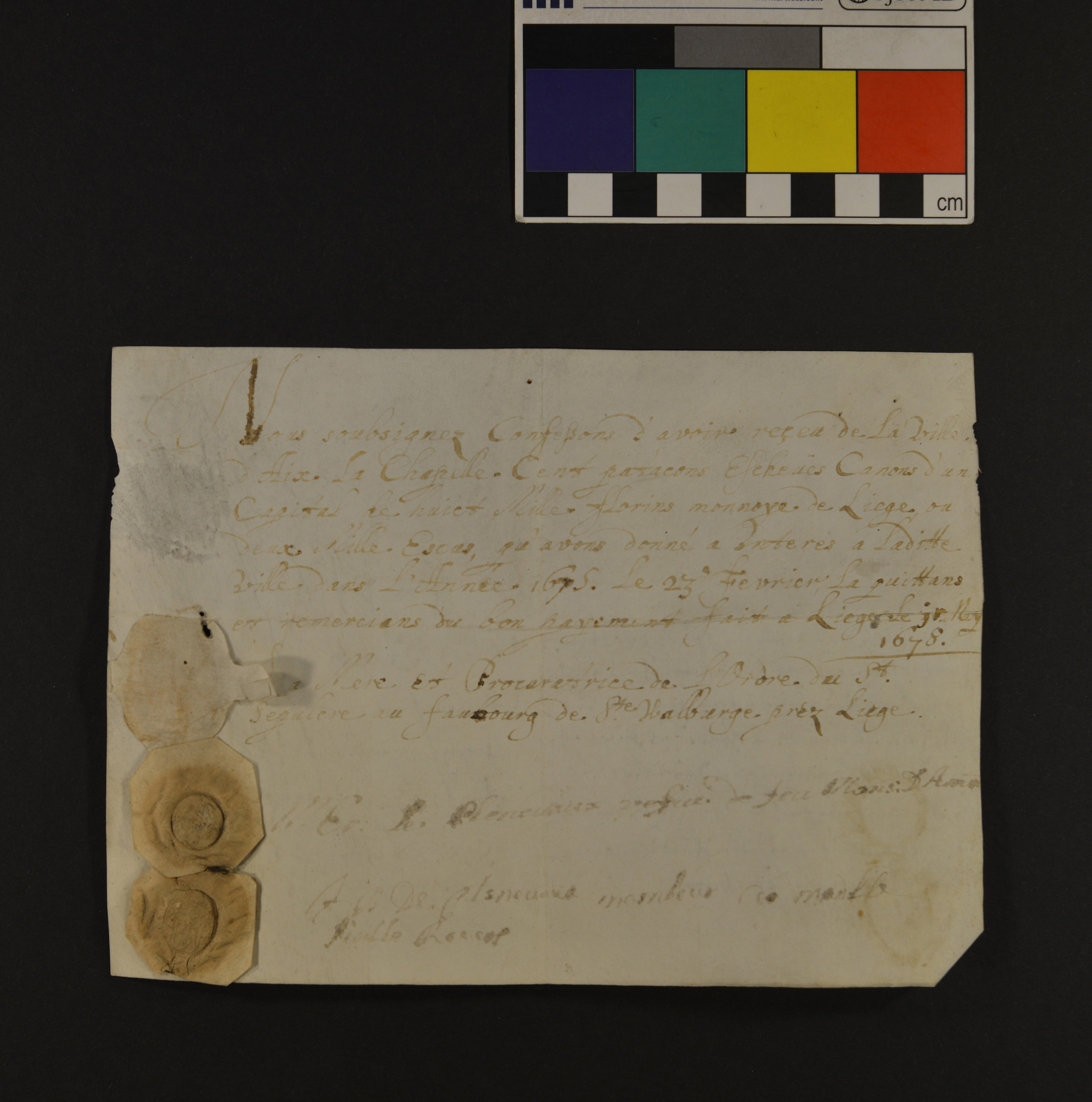 | Die Oberin des Ordens vom hl. Grabe bei Lüttich quittiert der Stadt Aachen über Zahlung einer Rente von 100 Patagon (flandr. Münze = 1 1/3 Taler) als Zinsen von einem der Stadt am 23. Feb. 1675 geliehenen Kapital von 8000 Lütt. Florin oder 2000 Taler. |