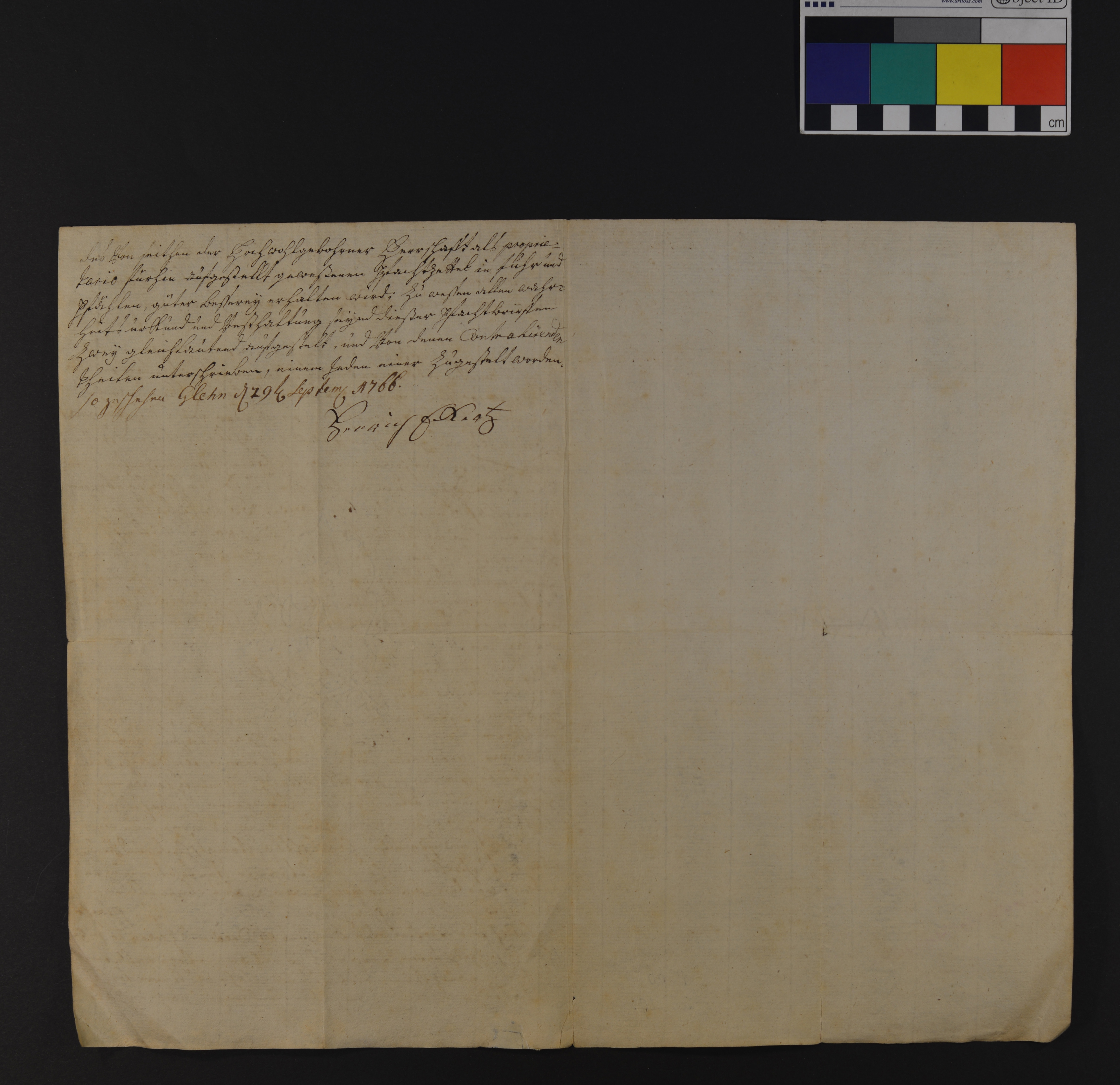 | Höhe: 31 cm, Breite: 38 cm, Ausfertigung, Papier mit Wasserzeichen, Manuskript, recto (34 Zeilen) und verso (7 Zeilen) beschriftet |
