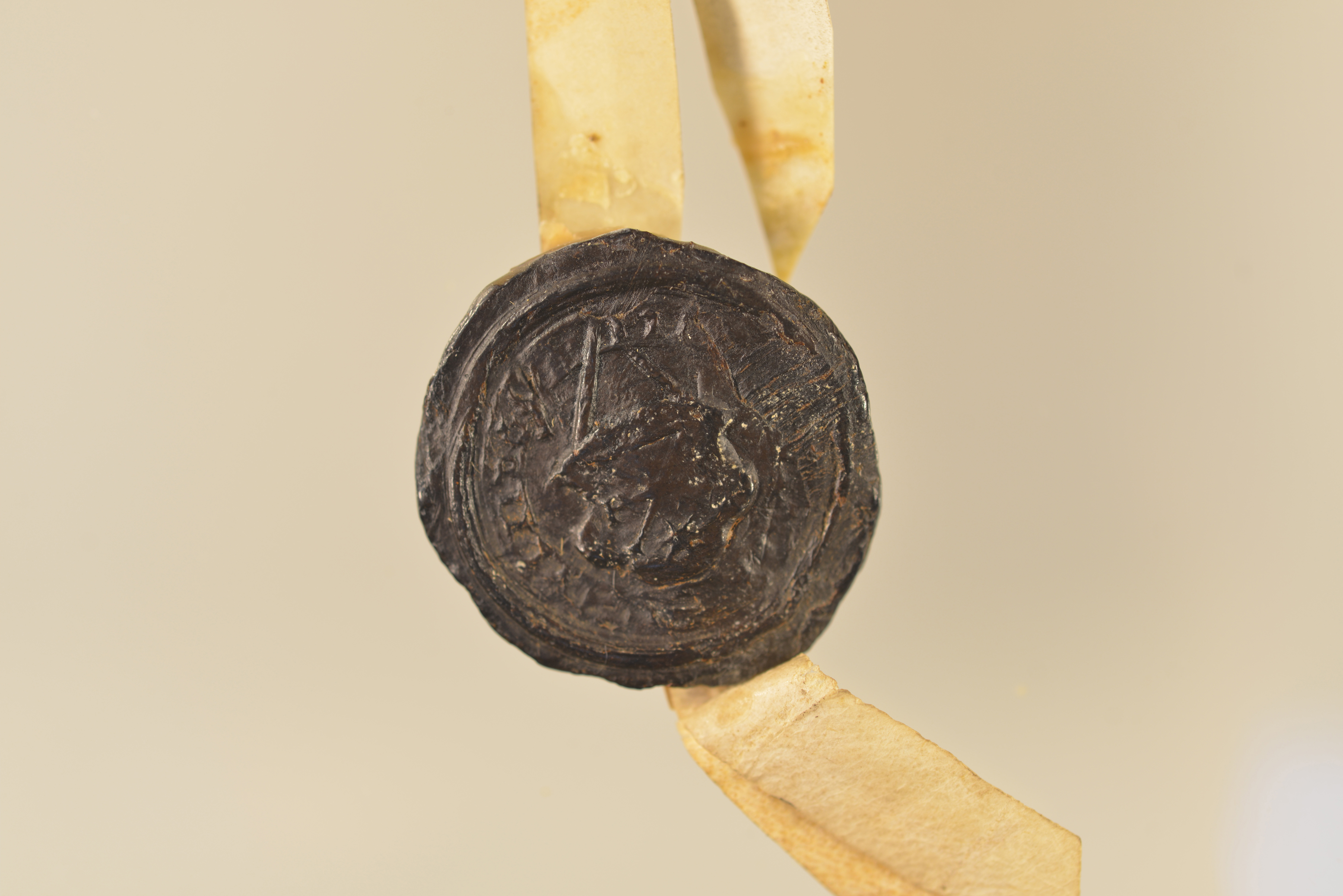 Schultheiß Peter Römer, Rundsiegel an Siegelpressel, Plica, Durchmesser: 3 cm, Siegeleinschnitt für ein weiteres Siegel, Gut erhalten, Schöffensiegel fehlt Schöffen von Jülich |