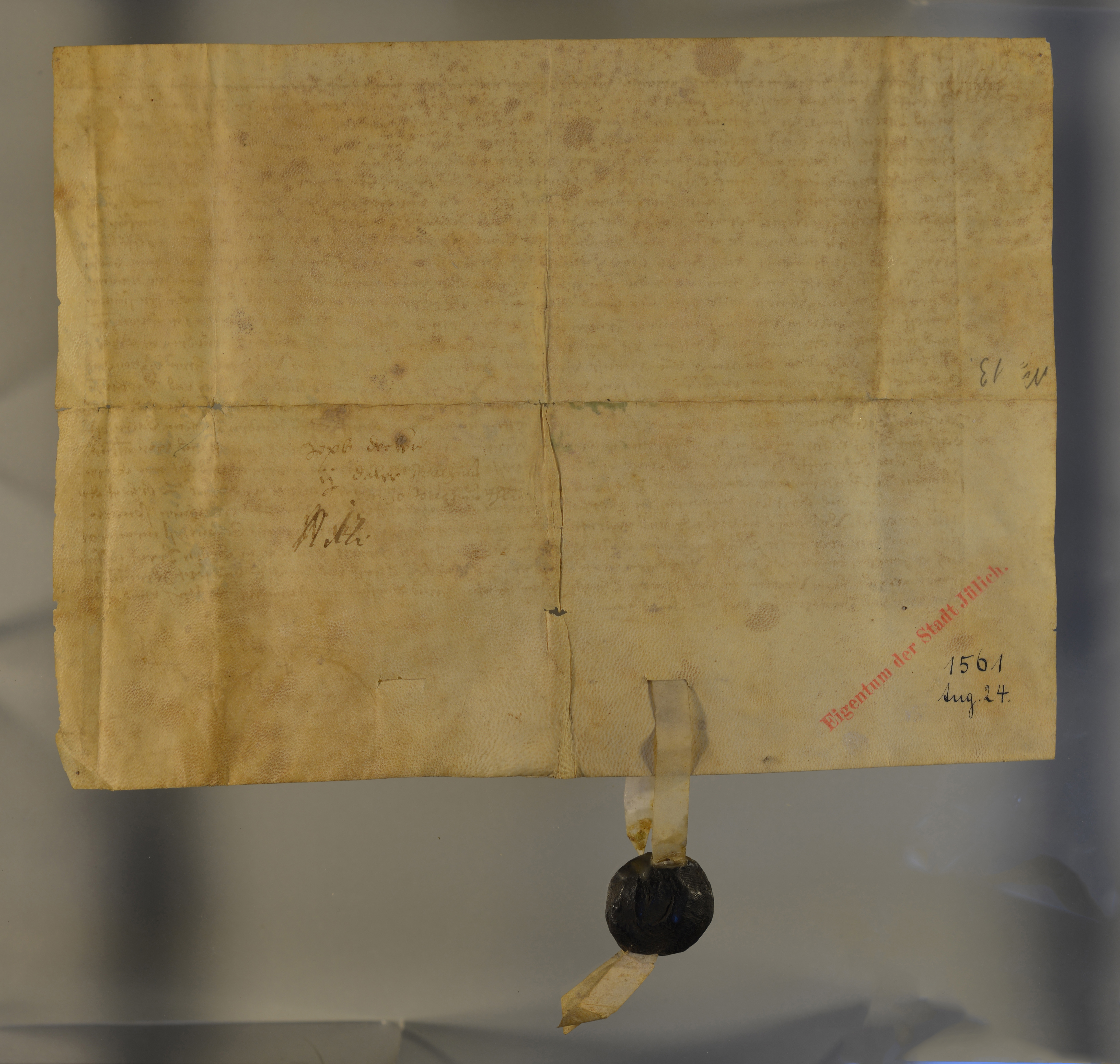 | Die Eheleute Jakob Strohdecker van Wolfshoven und Barbara verkaufen der geistl. Schwester Anna von Sevenich und ihren Bewohnern der neuen Schule zu Jülich eine erbliche Jahresrente von 1 1/2 Joachims-Taler mit Rückkaufsrecht. |