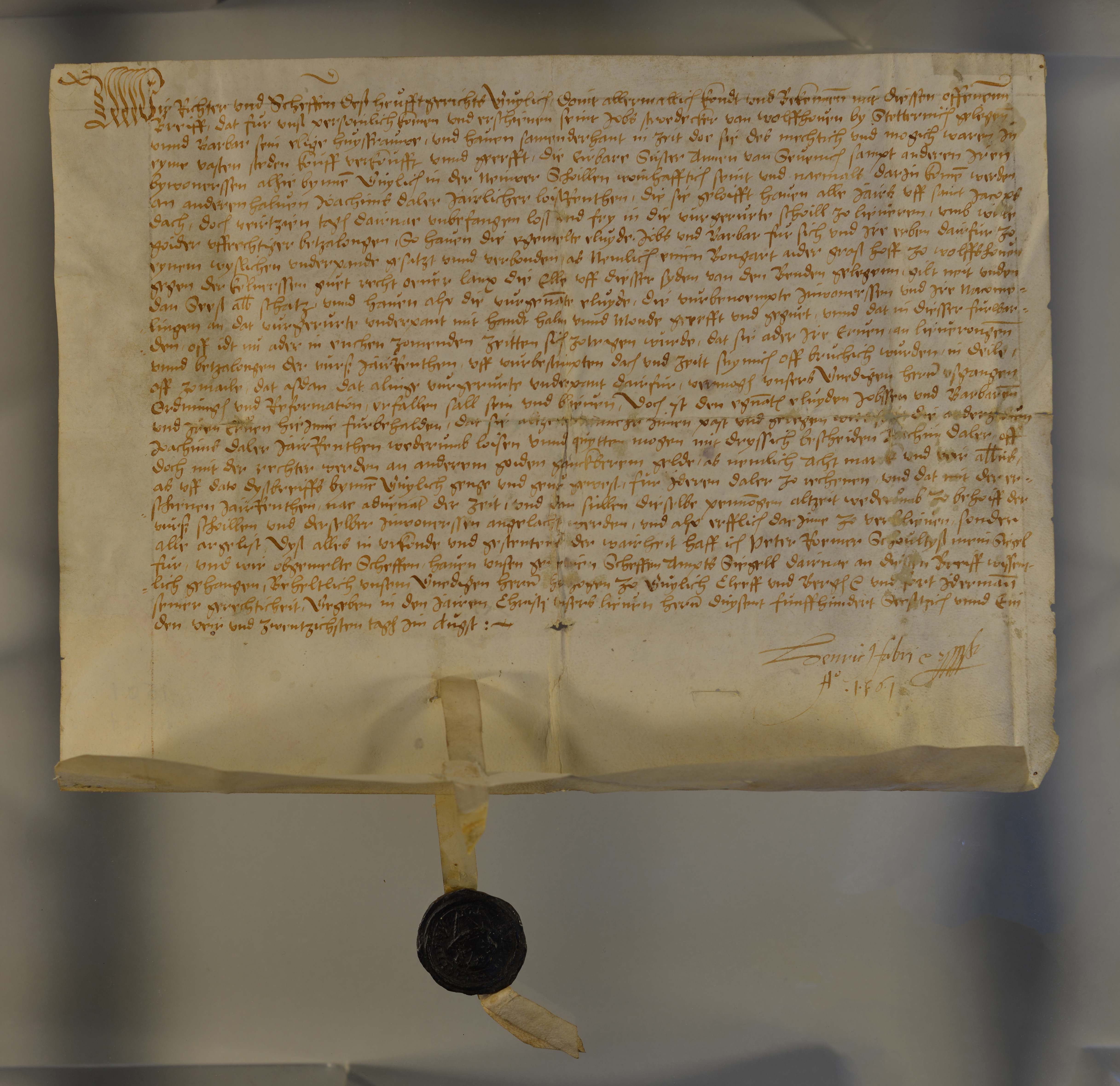 | Jobs Stroedyker van Wolffhouen, bei Stetternich gelegen, und seine Gattin Barbara verkaufen vor dem Gericht zu Guylich (Jülich) (Richter: Peter Roemer) der Schwester Anna von Seuenich (Sevenich) und ihren ”bywonerssen in der neuwer Schoillen" zu Guylich eine erbl. Jahresrente von 1 1/2 Joachims-Taler mit Rückkaufsrecht gegen 30 Joachims-Taler, zu 8 Mark 4 Albus den Taler gerechnet, und setzen zum Pfande einen ’'bongart an der grost hoff zu Wolffshouen gegen der Kelnerssen guet recht oeuer lang die Elle uff diesser syden van den Benden gelegenn”. |
