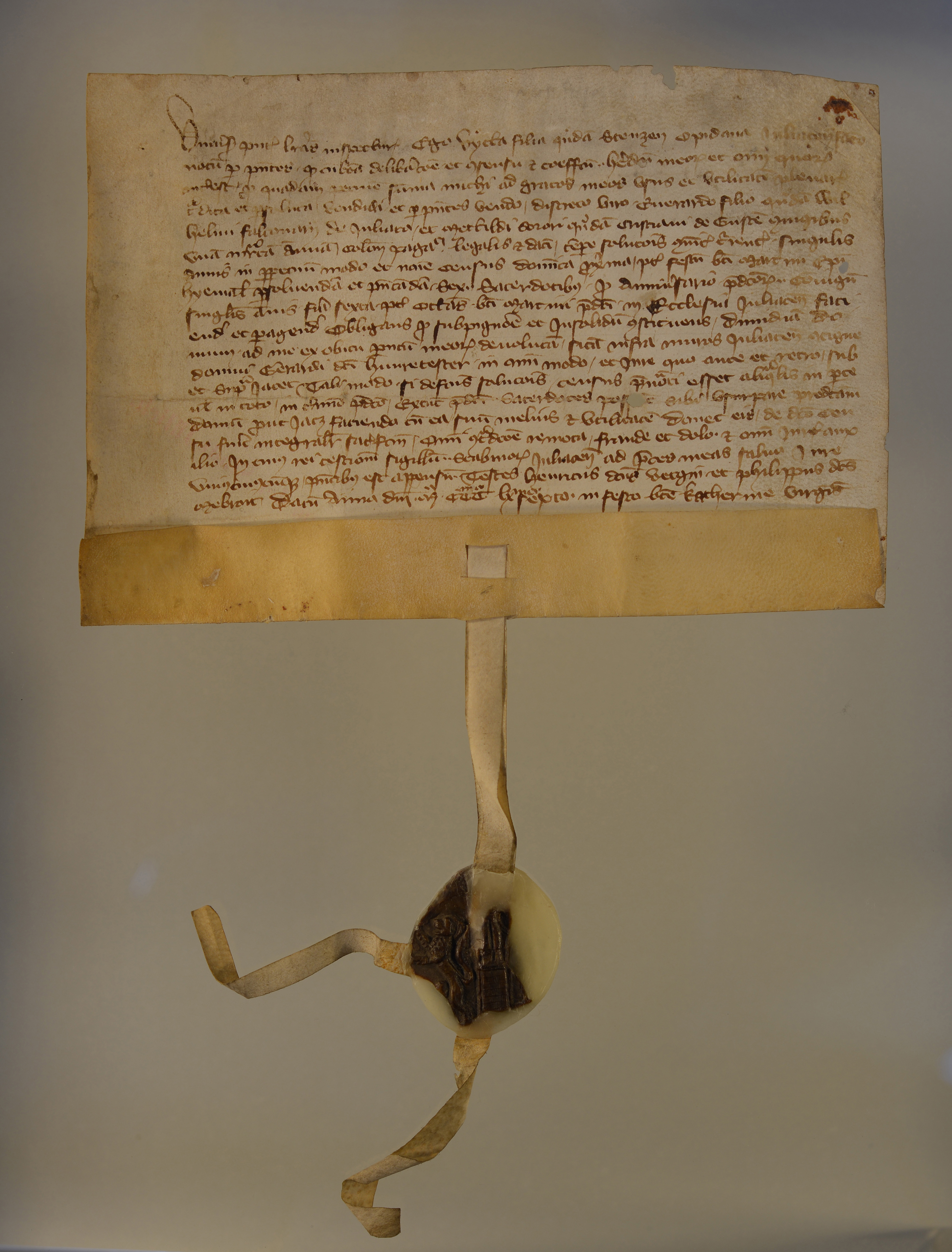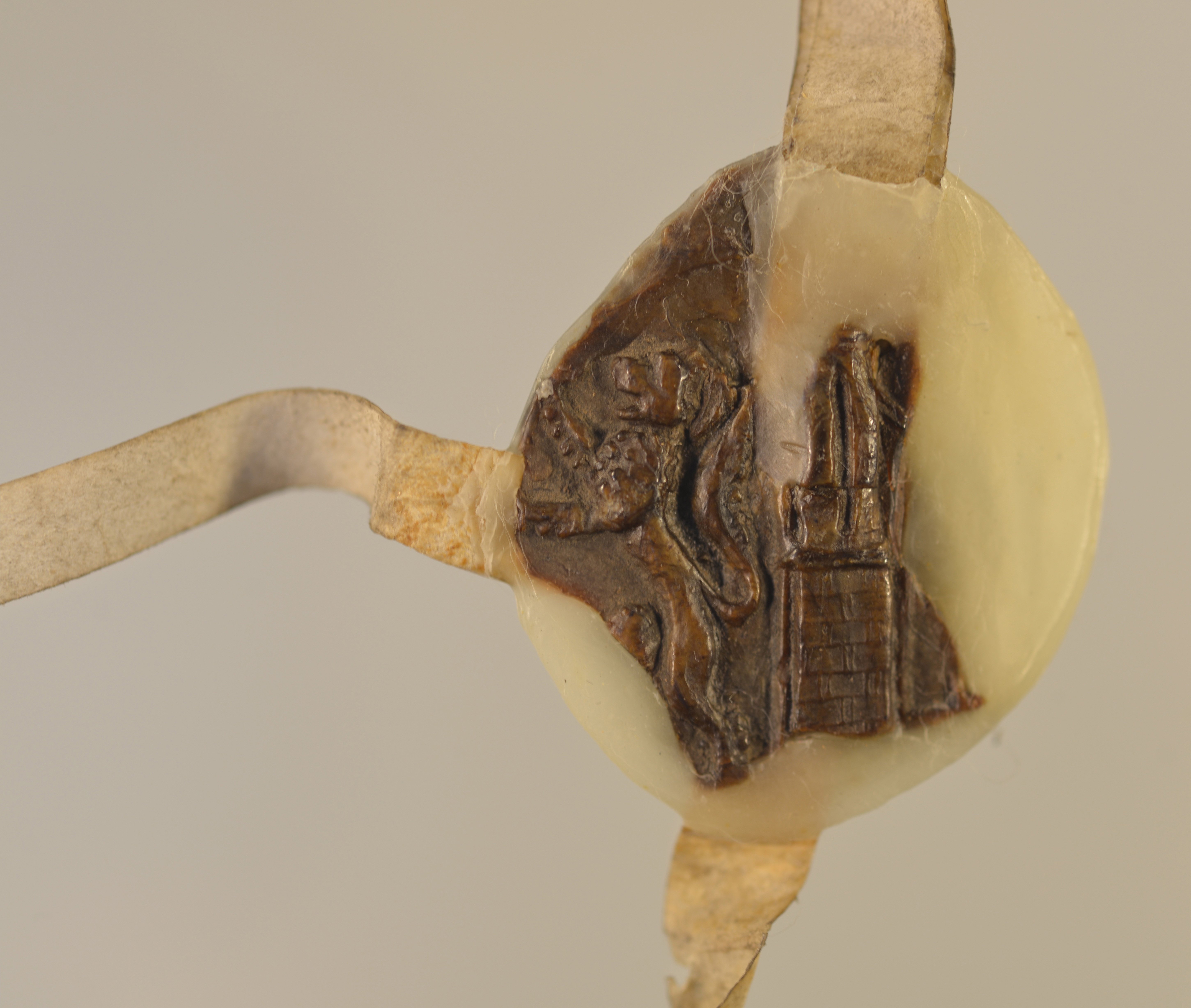 | Schöffen von Jülich, Rundsiegel an Siegelpressel, Plica, gebrochen, Fragment erhalten, mit Wachs fixiert |