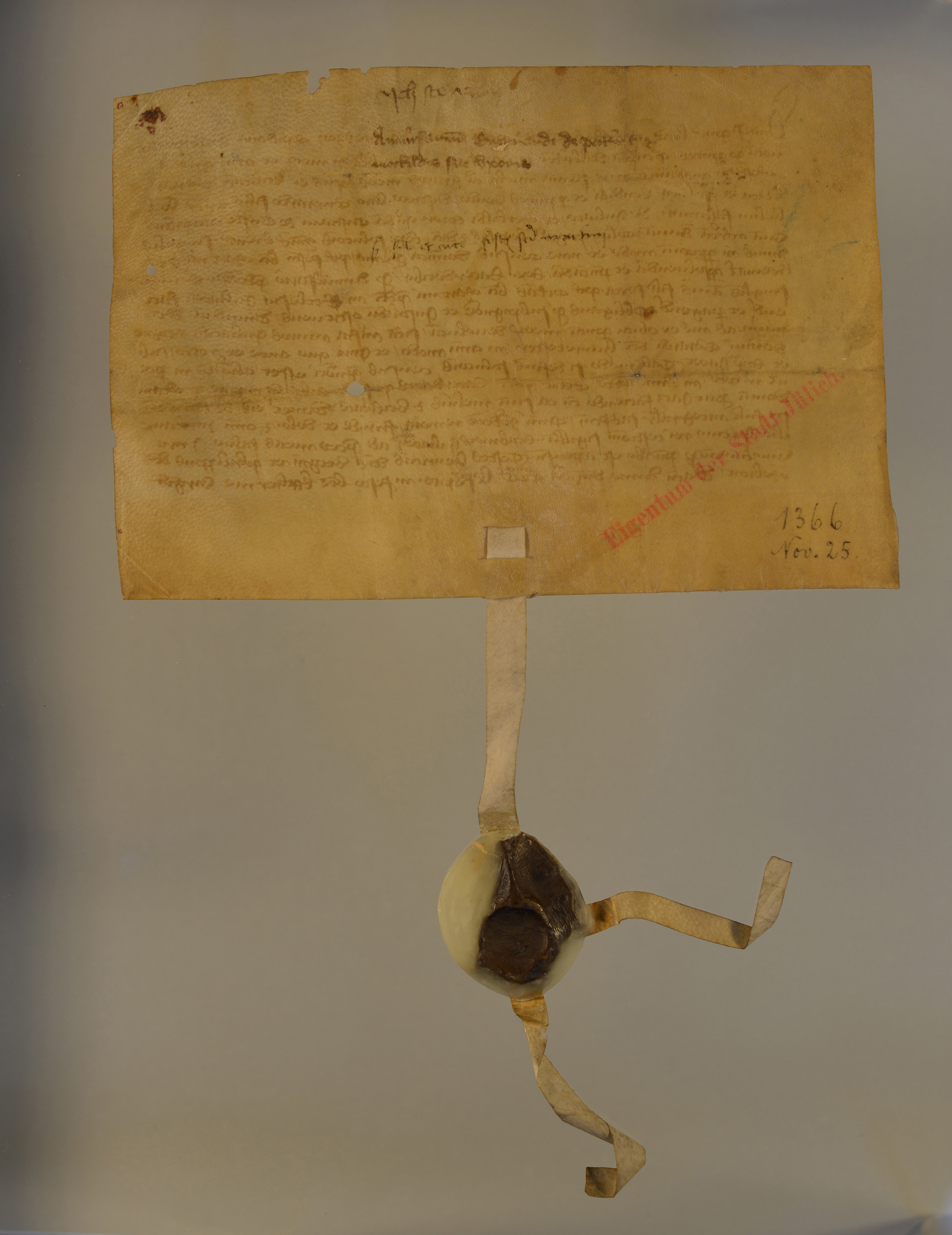 1366 Nov. 25 (in festo beate Katharine virginis.) Vytha, Tochter der verstorbenen Stenzen aus Jülich, verkauft vor dem Gericht zu Jülich Everhard, Sohn des verstorb. Wilhelm Falconarius von Jülich und der Methildis, Schwester des verstorb. Christian von Gusten, einen Erbzins von 1 kölnischen Mark. Zeugen: Henricus Vetgin u. Philippus Webroit. Or. Pg. mit anh. sehr beschäd. Schöff.-Sieg. v. Jülich. |
