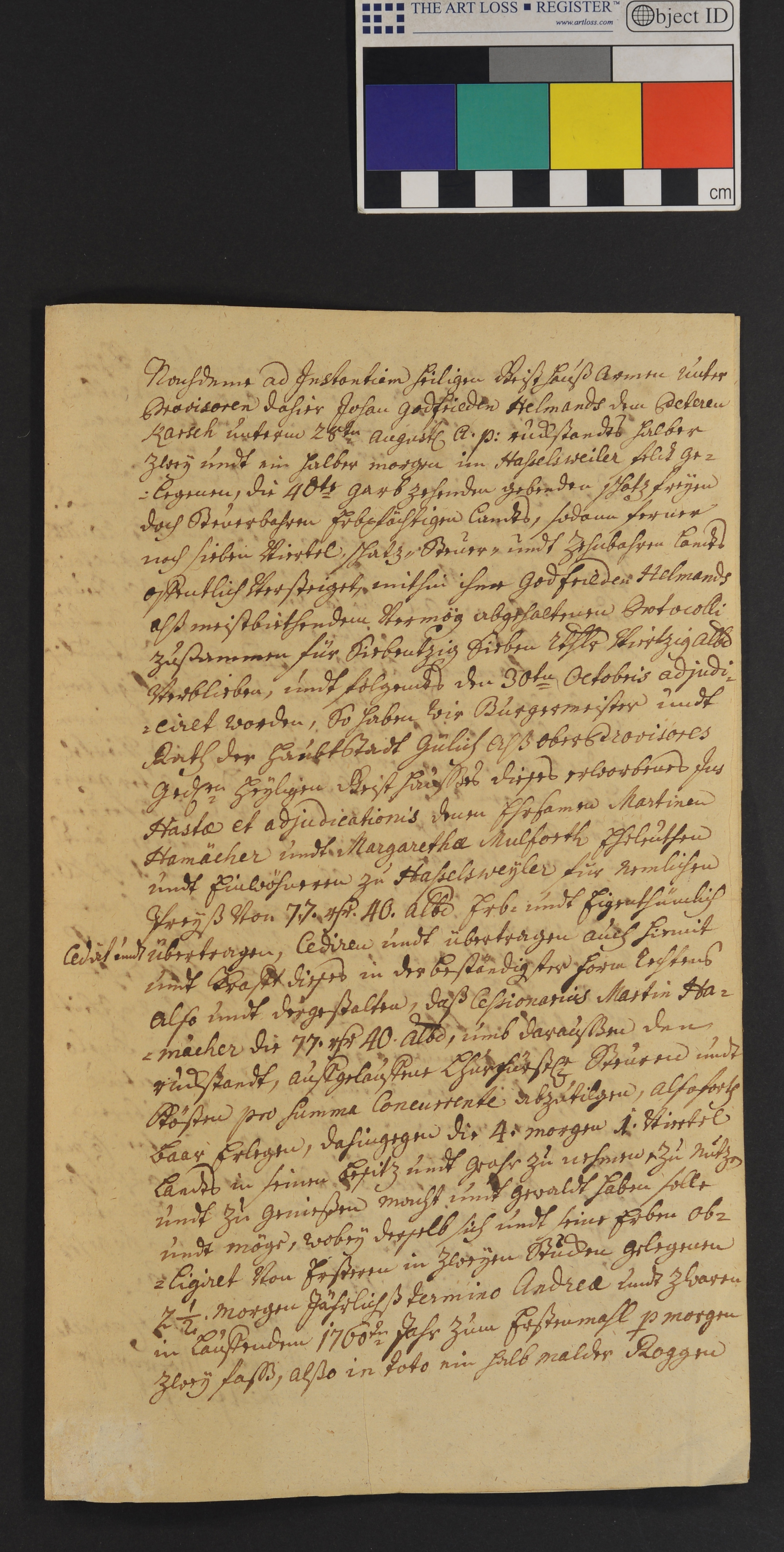 Bürgermeister und Rat der Stadt Jülich als oberste Provisoren des h. Geisthauses cedieren Martinus Hamächer und seiner Gattin Margaretha Mülforth das ius hastae et adiudicationis auf 2 1/2 Morgen Landes im Hasselsweiler Feld gelegen und 7 Viertel Landes gegen Zahlung von 77 Reichstaler 40 Albus zur Abtragung der aufgelaufenen kurfürstl. Steuern und der weiteren Verpflichtung von den gen. 2 1/2 Morgen eine jährl. Pacht von 1/2 Malter Roggen dem h. Geisthaus zu liefern, zur Verzinsung einer darauf lastenden Summe von 25 Rth. 1 Rth. 20 Albus (5%) und die laufenden kurfürstl. Steuern und sonstigen Lasten zu zahlen. Cop.Pg. (von Mart. Hamecher eigenh. abgeschrieben und von ihm und seiner Gattin unterzeichnet.) |
