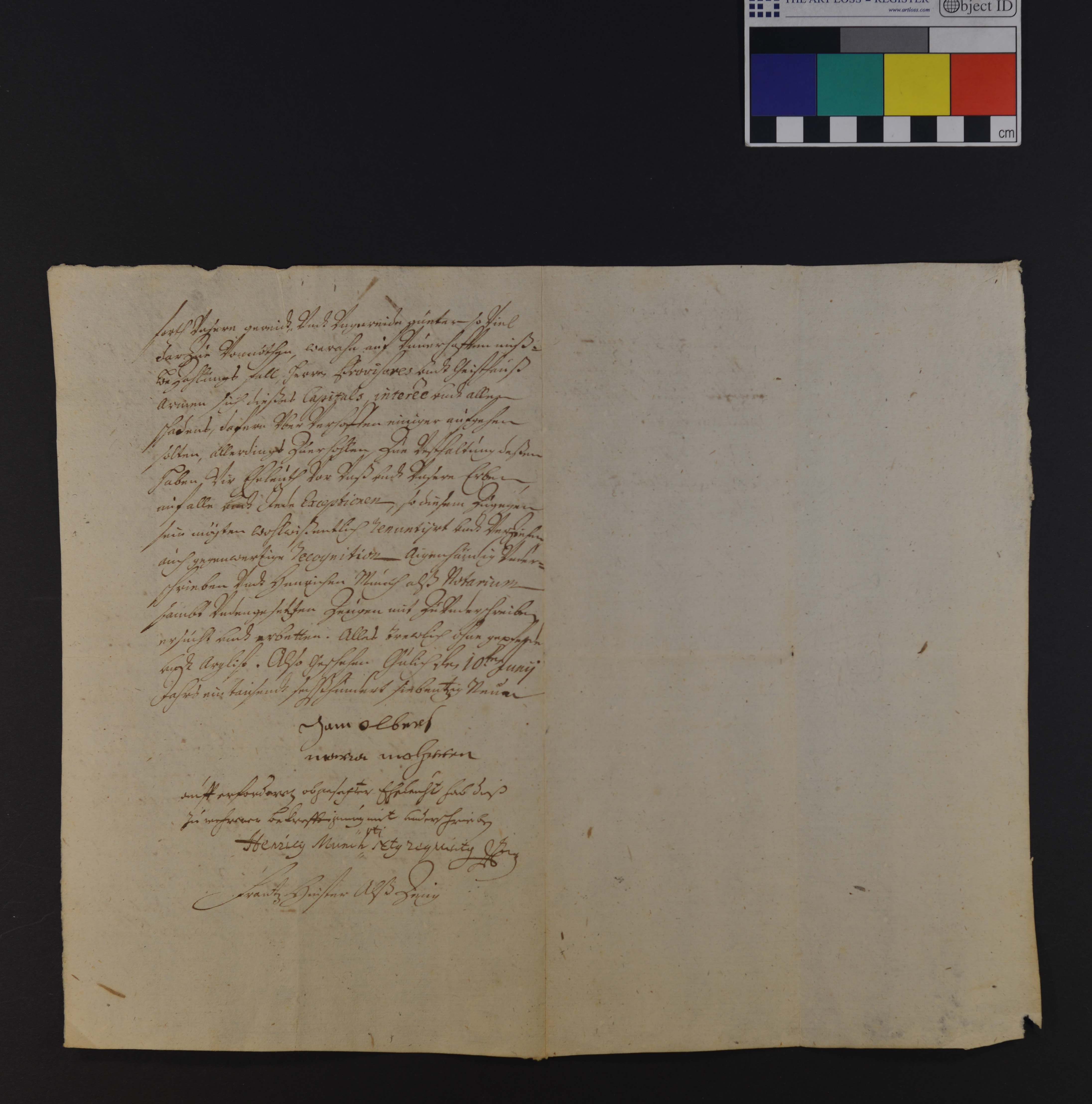 | Höhe: 29 cm, Breite: 36,5 cm, Ausfertigung, Papier mit Wasserzeichen, Manuskript, recto (23 Zeilen) und verso (15 Zeilen) beschriftet |