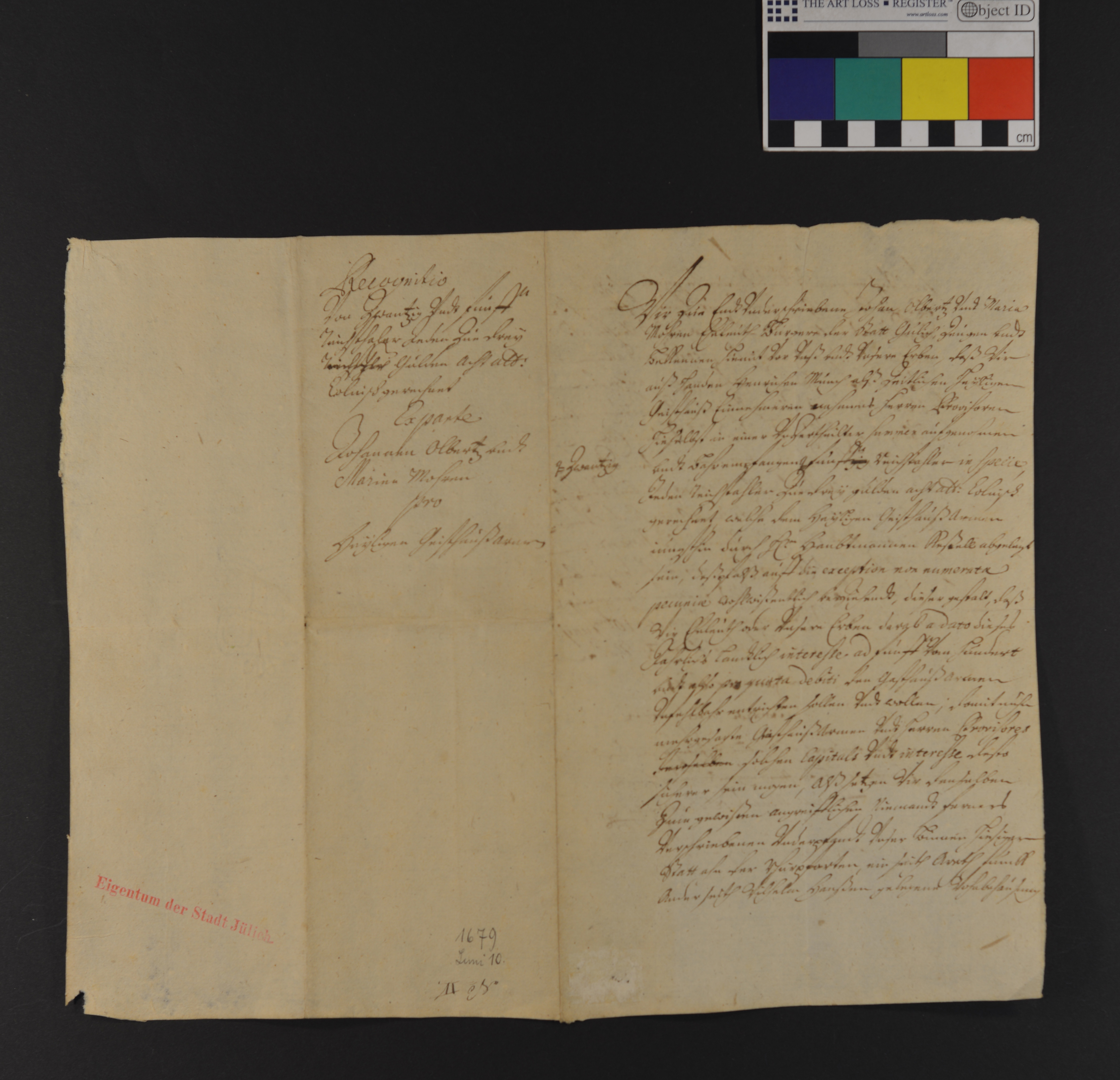 | Die Eheleute Johan Olbertz und Maria Mohren, Bürger der Stadt Gulich (Jülich), verpflichten sich, dass von Henrich Munch, Einnehmer und Proviser des h. Geisthauses zu Gulich, entliehenen Capitals von 50 Rth., den Rth. zu 3 Gulden 8 Albus cöln. Währung gerechnet, das vom Hauptmann Kessel abgelegt worden, mit 5% zu verzinsen, und setzen zum Unterpfand ihr in Jülich an der Rurpforte "ein seith Arnth Funck ander seith Wilhelm Hanssen" gelegenes Haus. NB: Die Zahl 50 ist auf dem Rande und in der Urkunde in 25 verändert. Die Inhaltsang. auf der Rucks. nennt auch 25 Rth |