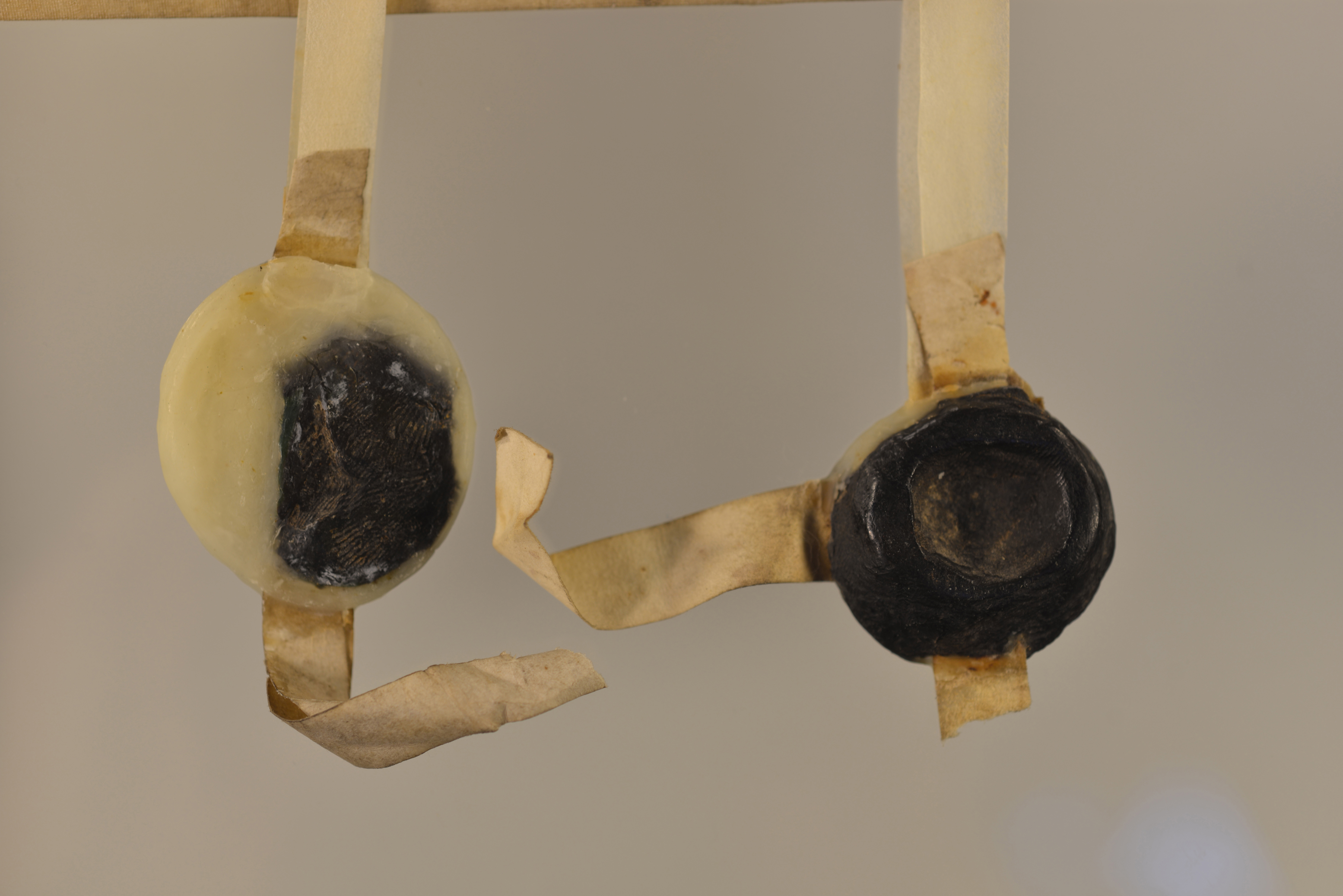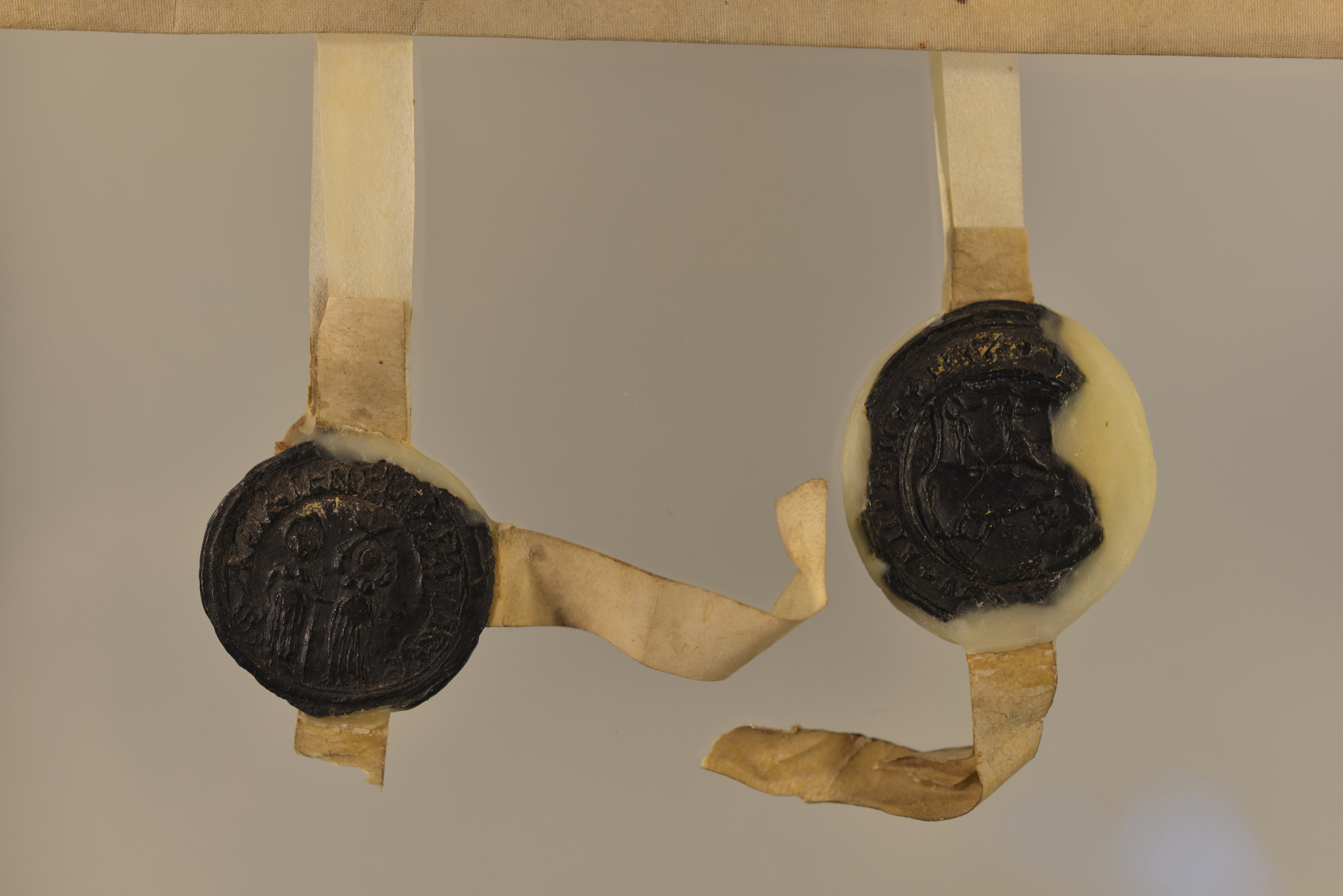 Schultheiß Kaspar Sengel, Zwei Rundsiegel an Siegelpressel, Plica, Durchmesser: 3,4 cm (Kaspar Sengel). 4 cm (Schöffensiegel von Jülich) Schöffen von Jülich |