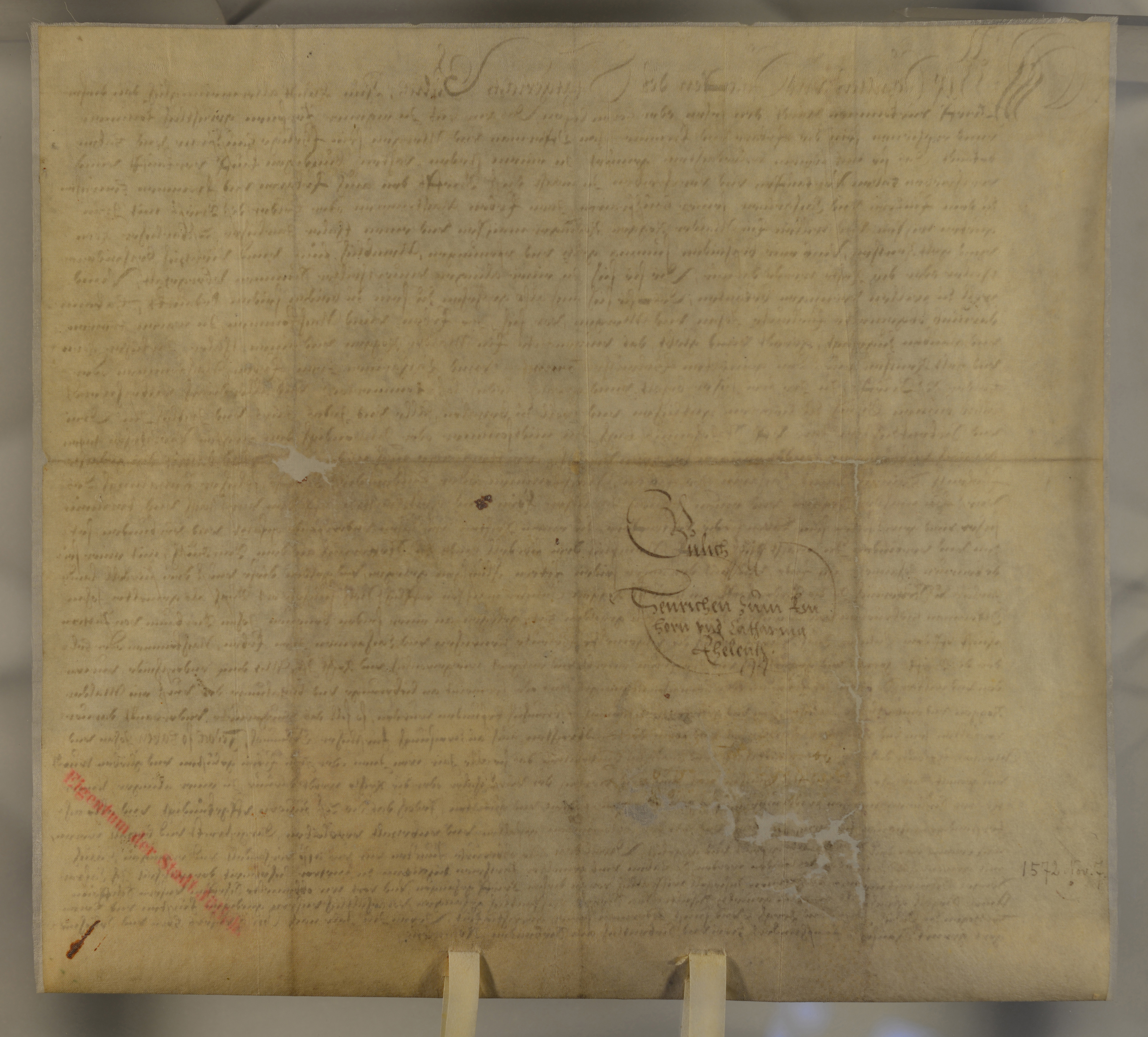| Höhe: 29 cm, Breite: 31 cm, Ausfertigung, Pergament, Manuskript, recto und verso beschriftet, 39 Zeilen |