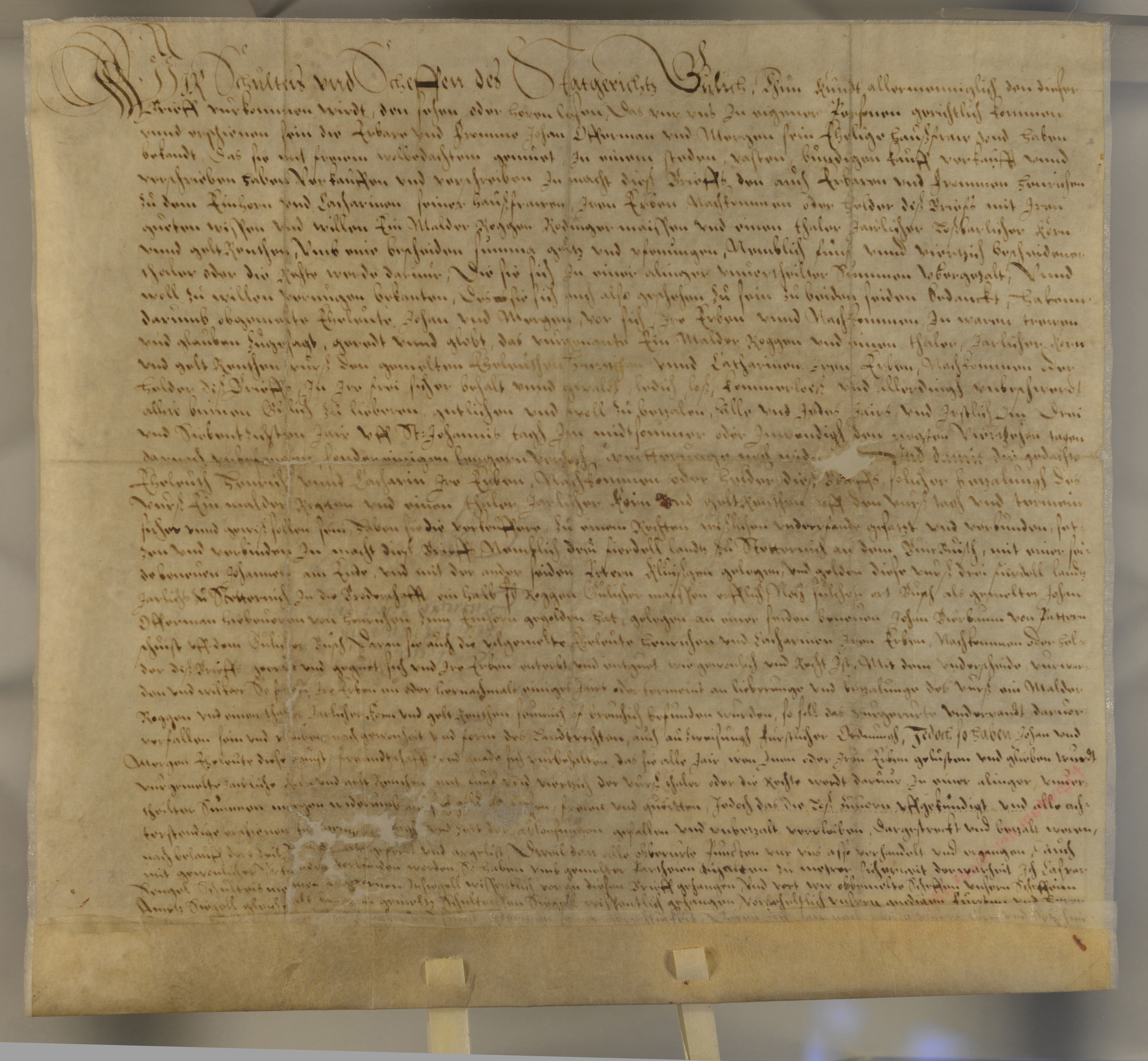 | Die Eheleute Johan und Mergen Offermann verkaufen vor dem Gericht zu Gulich (Jülich) (Schultheiss: Caspar Sengel) für 45 Taler den Eheleuten Henrich und Catharina Einhorn eine lösbare Jahresrente von 1 Malter Roggen Roedinger Maß und 1 Taler gegen Rückkaufsrecht und setzen zu Pfand “drei fierdell landtz zo Stetternich an dem Buisbusch, mit einer seide beneuen Johannen am Ende, vnd mit der ander seiden Petern Kluissgen gelegen, vnd gelden diese vurs. drei fierdell landts jahrlichs zu Stetternich in die Broderschafft ein halb roggen Gulicher maissen erfflich, noch sulchen ort busch als gemelter Johan Offermann ... von Henrichen zum Einhorn gegolden hat, gelegen an einer seiden beneuen Johan Bierbaum von Pattern schuist vff dem Gulicher busch. |