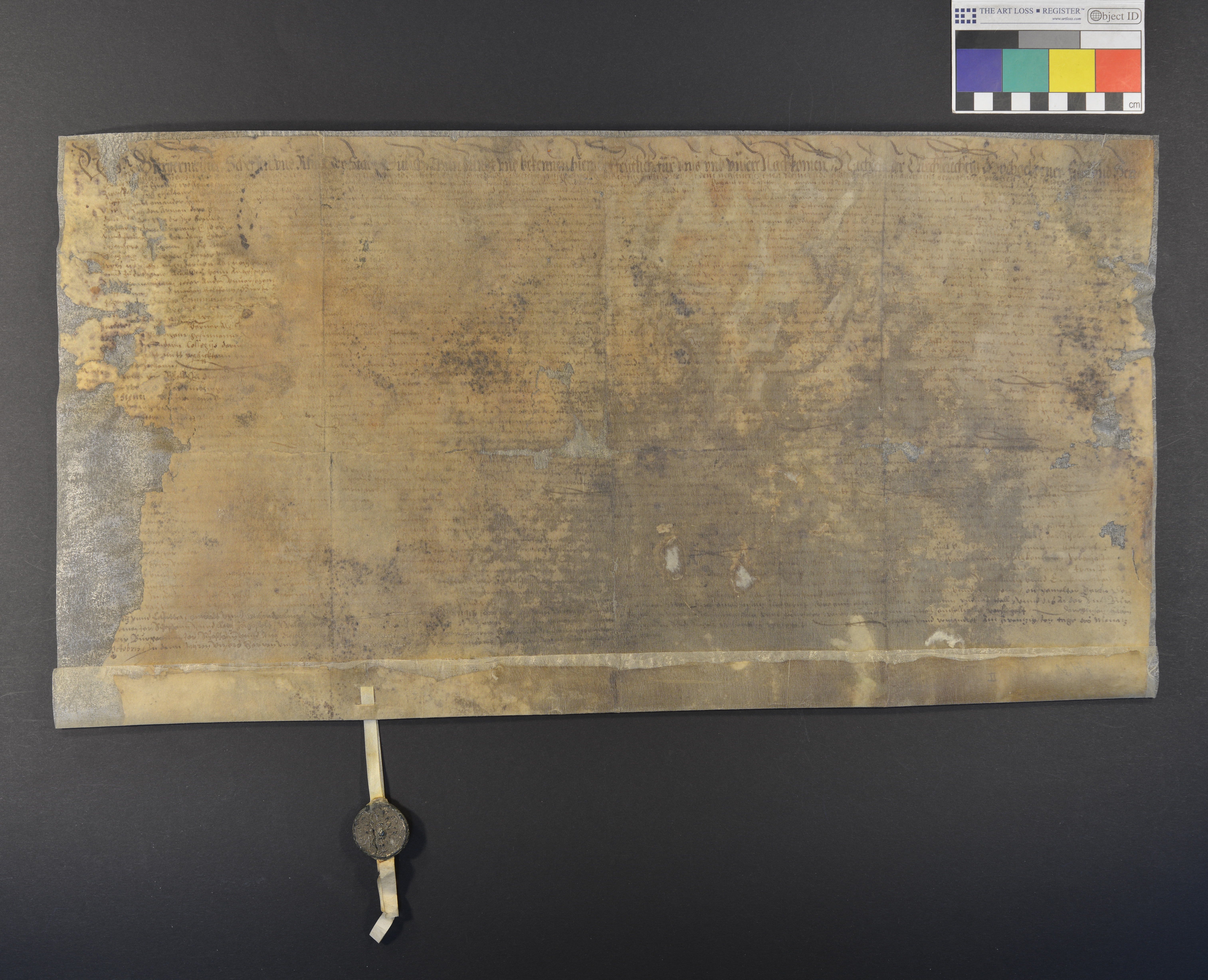 | Höhe: 31,5 cm, Breite: 58,5 cm, Ausfertigung, Pergament, Manuskript, recto und verso beschriftet, 50 Zeilen |