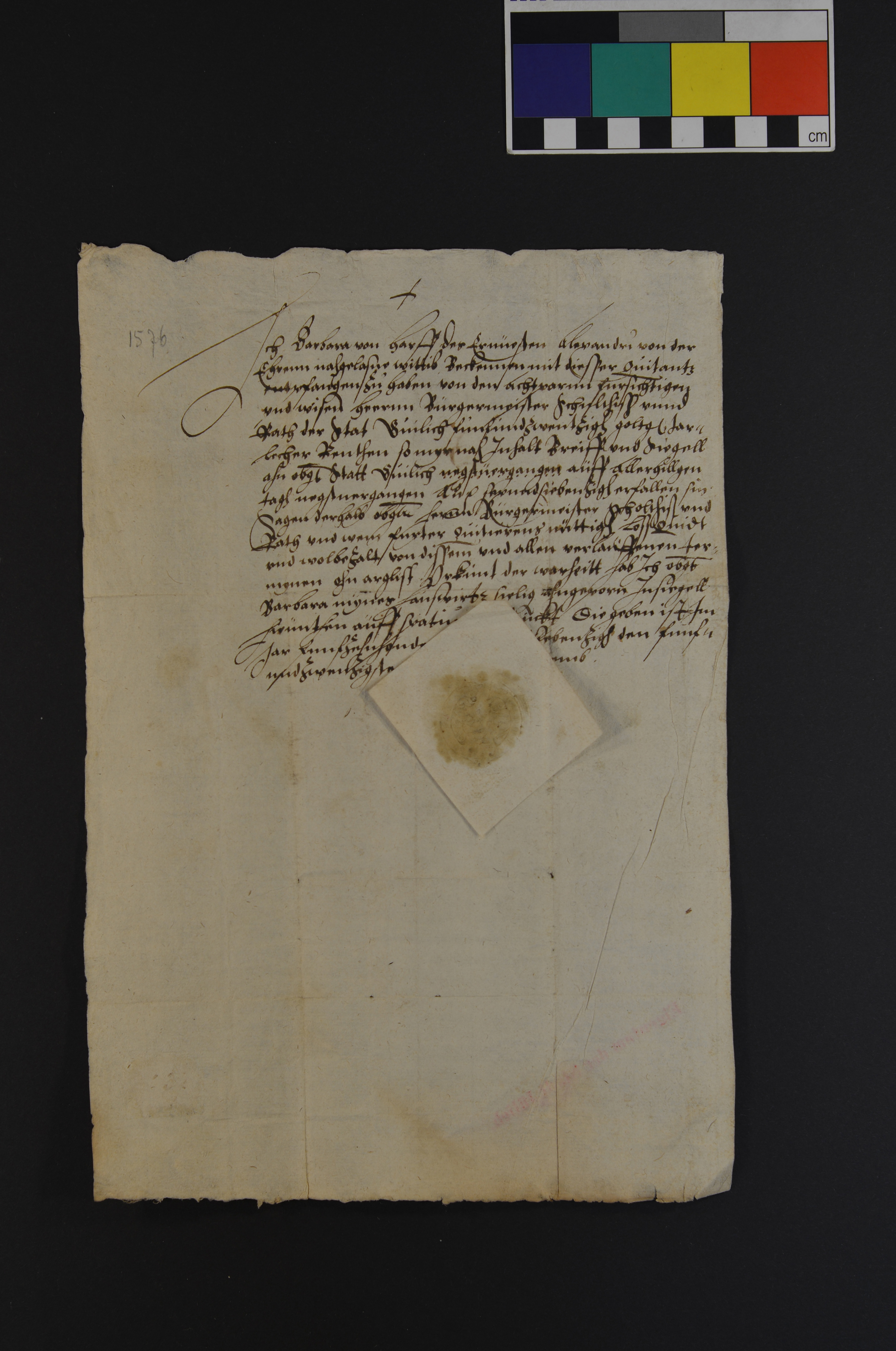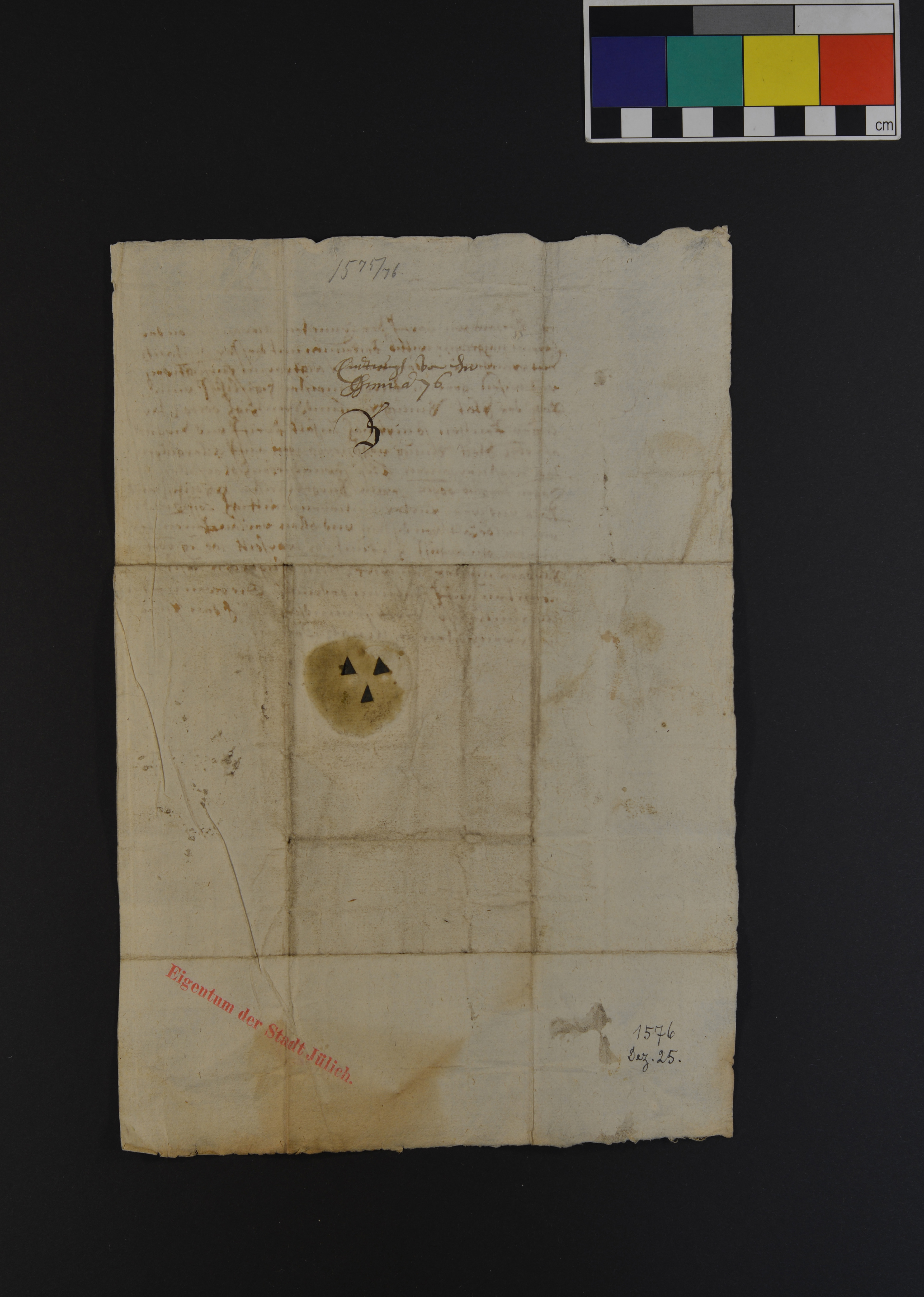 | Barbara von Harff, Wwe. des verstorb. Alexander von der Ehren quittiert der Stadt Guilich (Jülich) über Zahlung von 25 Goldgulden Jahresrente. |