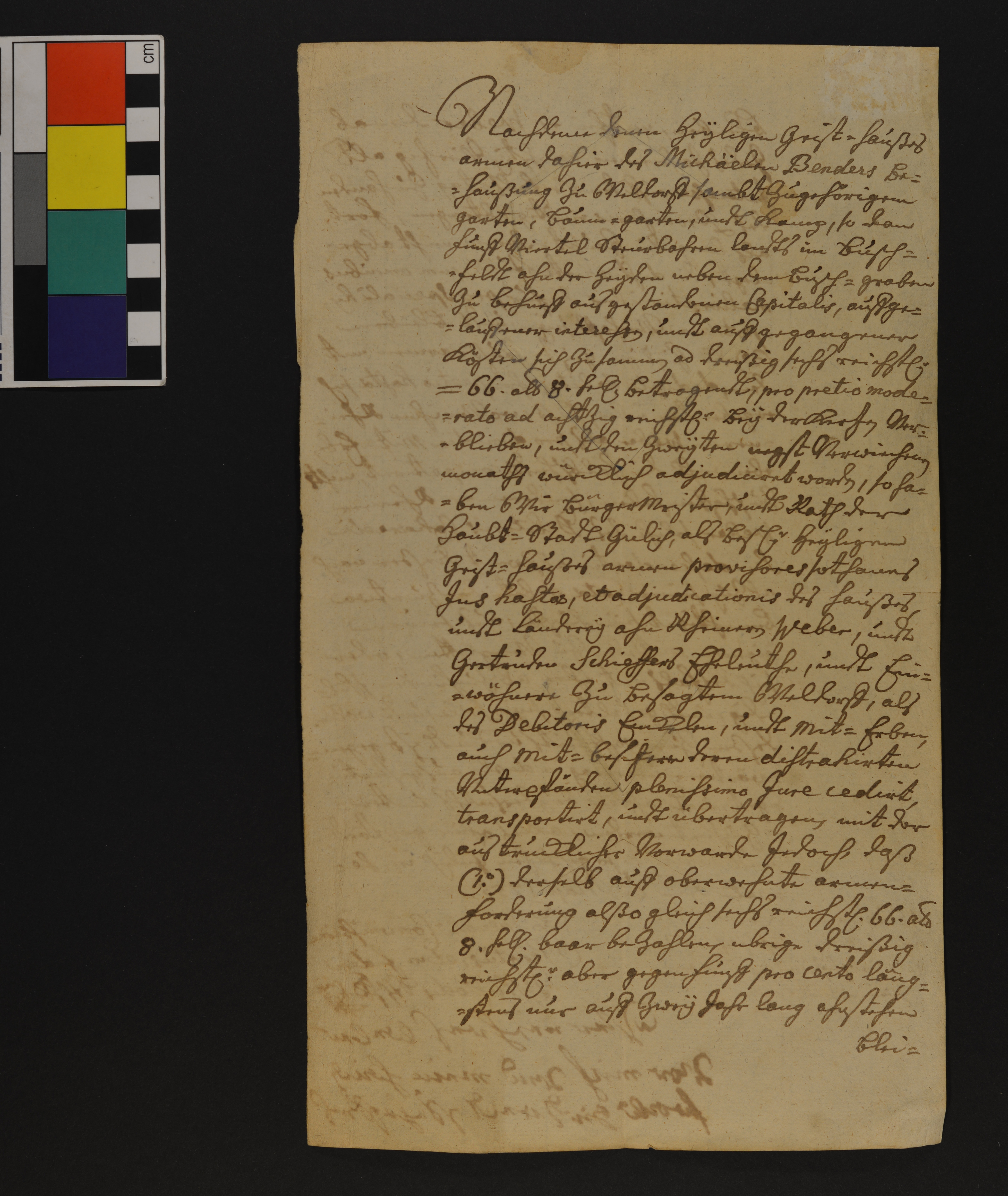 Formalbeschreibung: Höhe: 32 cm, Breite: 18,5 cm, Ausfertigung, Papier mit Wasserzeichen, Manuskript, recto (30 Zeilen) und verso (27 Zeilen) beschriftet
