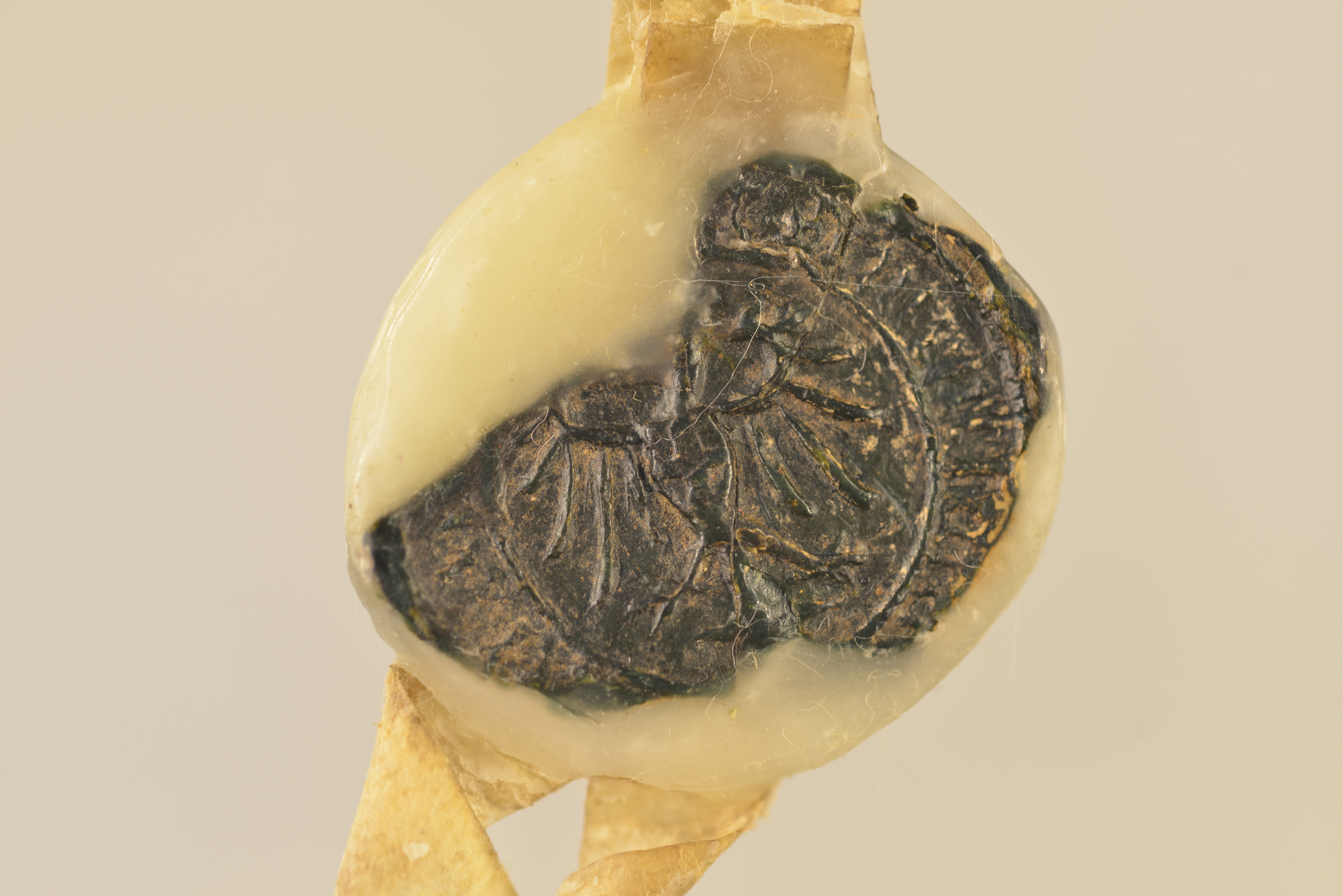 | Schöffen von Frimmersdorf, Rundsiegel an Siegelpressel, Plica, Durchmesser: 3,3 cm, gebrochen, Fragment erhalten, restauriert |