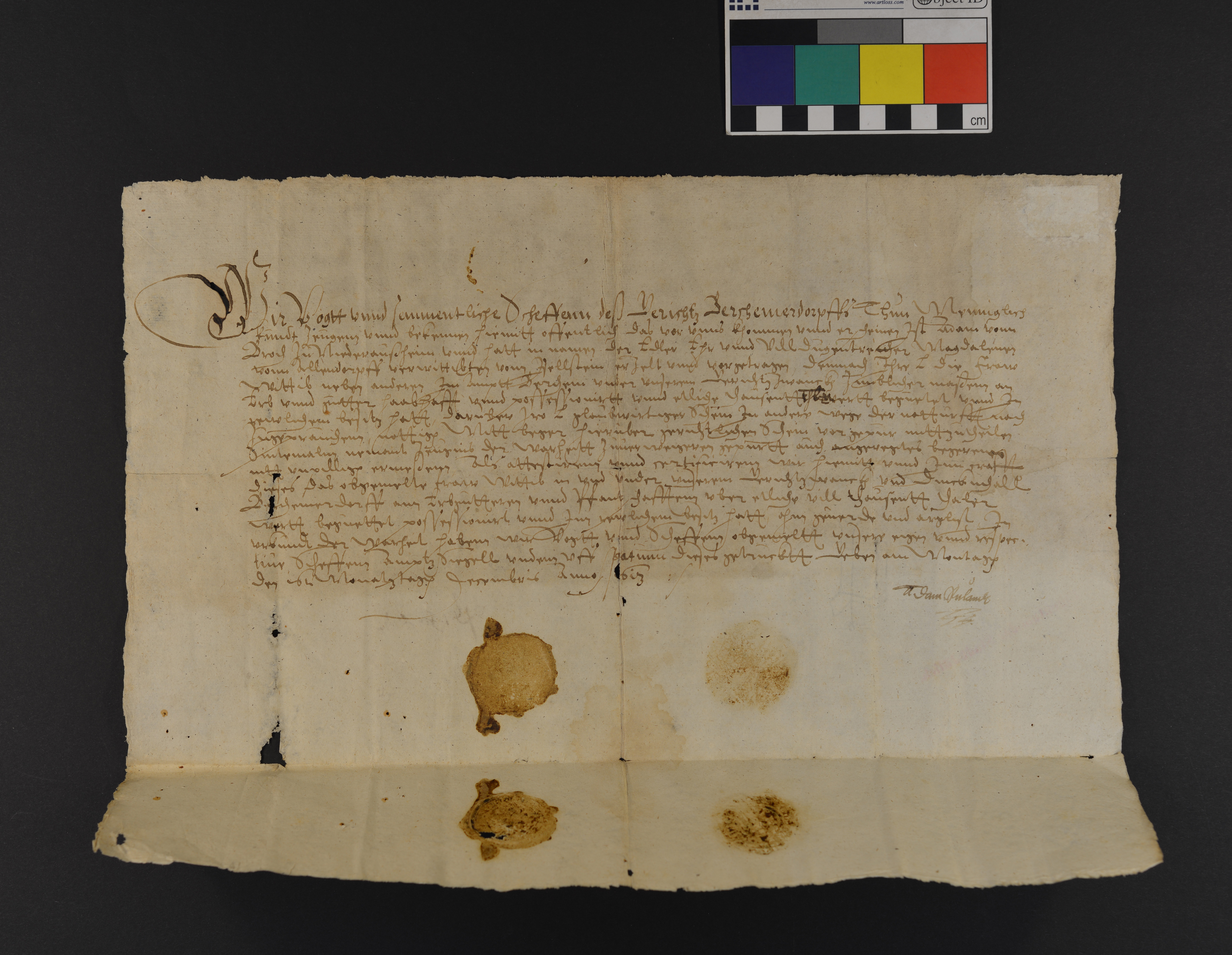 Kopfregest: Vogt und Schöffen des Gerichts zu Bergheimerdorf bestätigen auf Antrag des Adam von Broich zu Niederaußem, dass Magdalene von Allendorf Güter und eine Summe von einigen 1000 Talern besitzt.