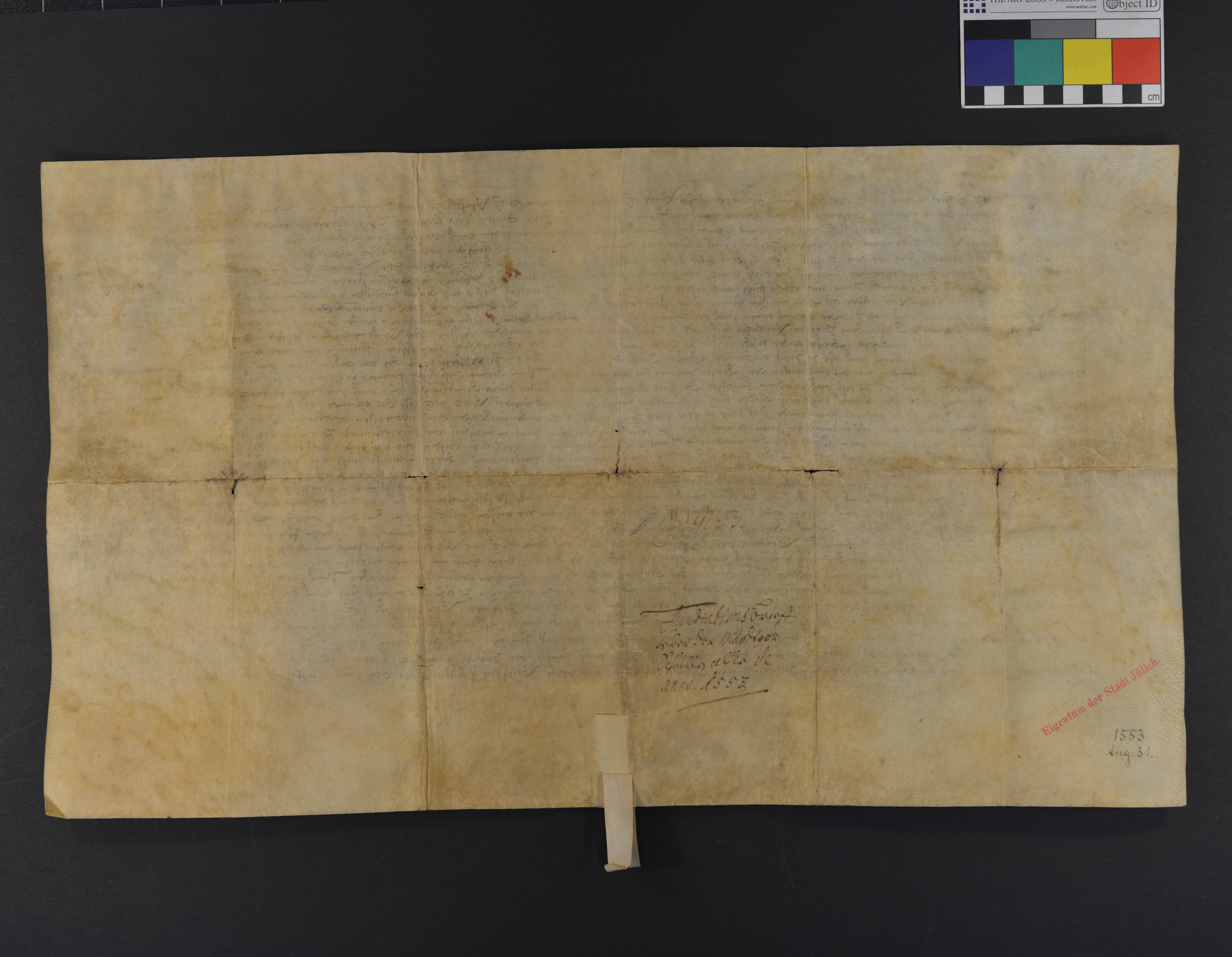| Höhe: 8 cm, Breite: 15 cm, Ausfertigung, Pergament, Manuskript, recto und verso beschriftet, 9 Zeilen |