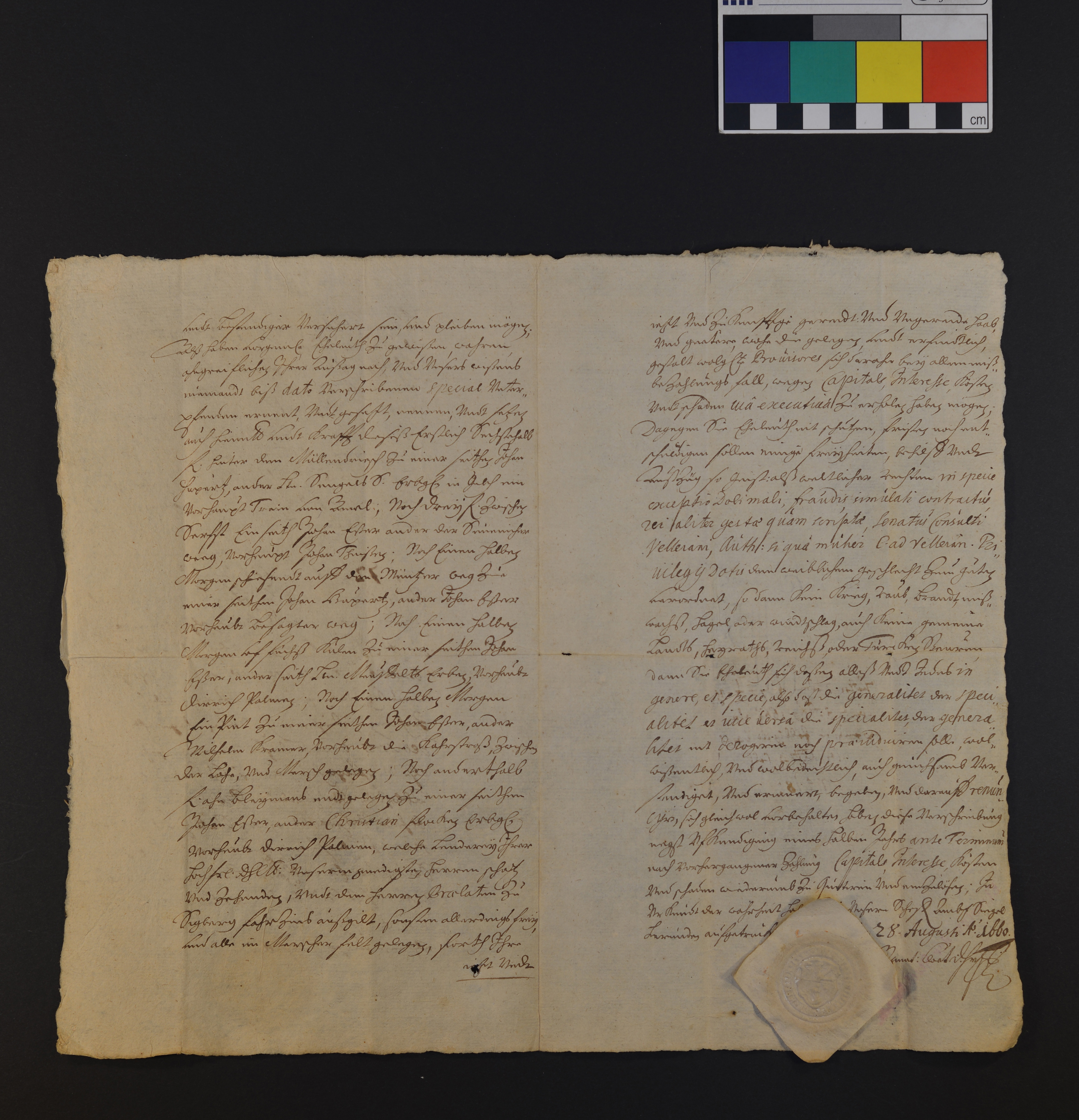 | Höhe: 29,5 cm, Breite: 36,5 cm, Ausfertigung, Papier mit Wasserzeichen, Manuskript, recto (27 Zeilen) und verso (links 27 zeilen, rechts 27 Zeilen) beschriftet |