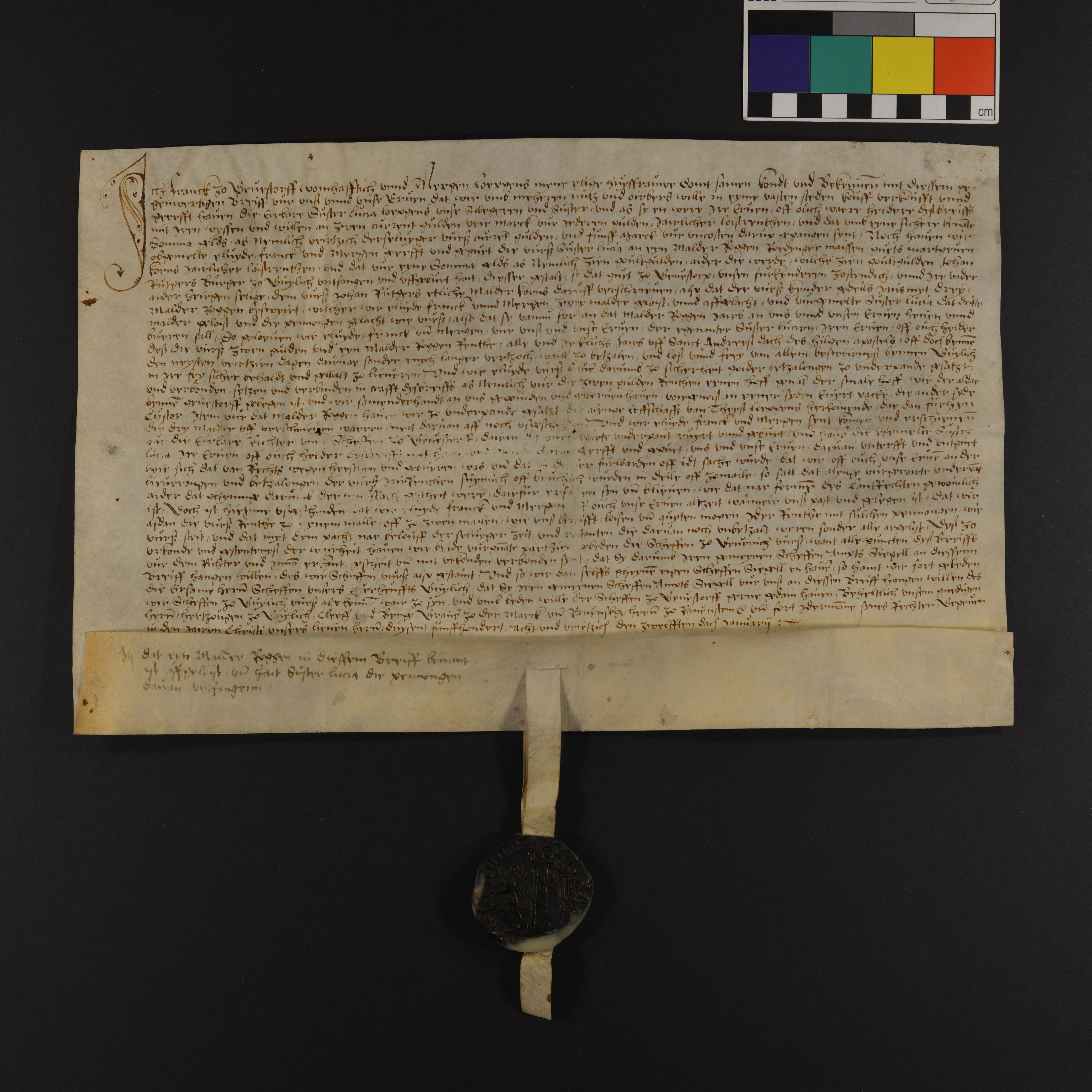 Regest: Franck zu Geuestorff und seine Gattin Mergen Loepgens verkaufen vor dem Gericht zu Geuestorff (Garsdorf(Bedburg)) für 40 Gulden, den Gulden zu 4 Mark gerechnet, und 5 Mark zur Bestreitung der Unkosten ihrer Schwägerin & Schwester Lucia Loepgens eine erbl. Jahresrente von 2 Gulden und eine von 1Malter Roggen Roedynger Mass aus ihrem Gute zu Geuestorp für 10 Goldgulden, welche Johan Rutgers, Bürger zu Guylich (Jülich) empfangen hat, und setzen zum Pfand den "schmalen" hof zu Geuestorp "an eyner syden Euert Packe, die ander syde Custor", ferner die von Theyst Loepgens herstammende Erbschaft.