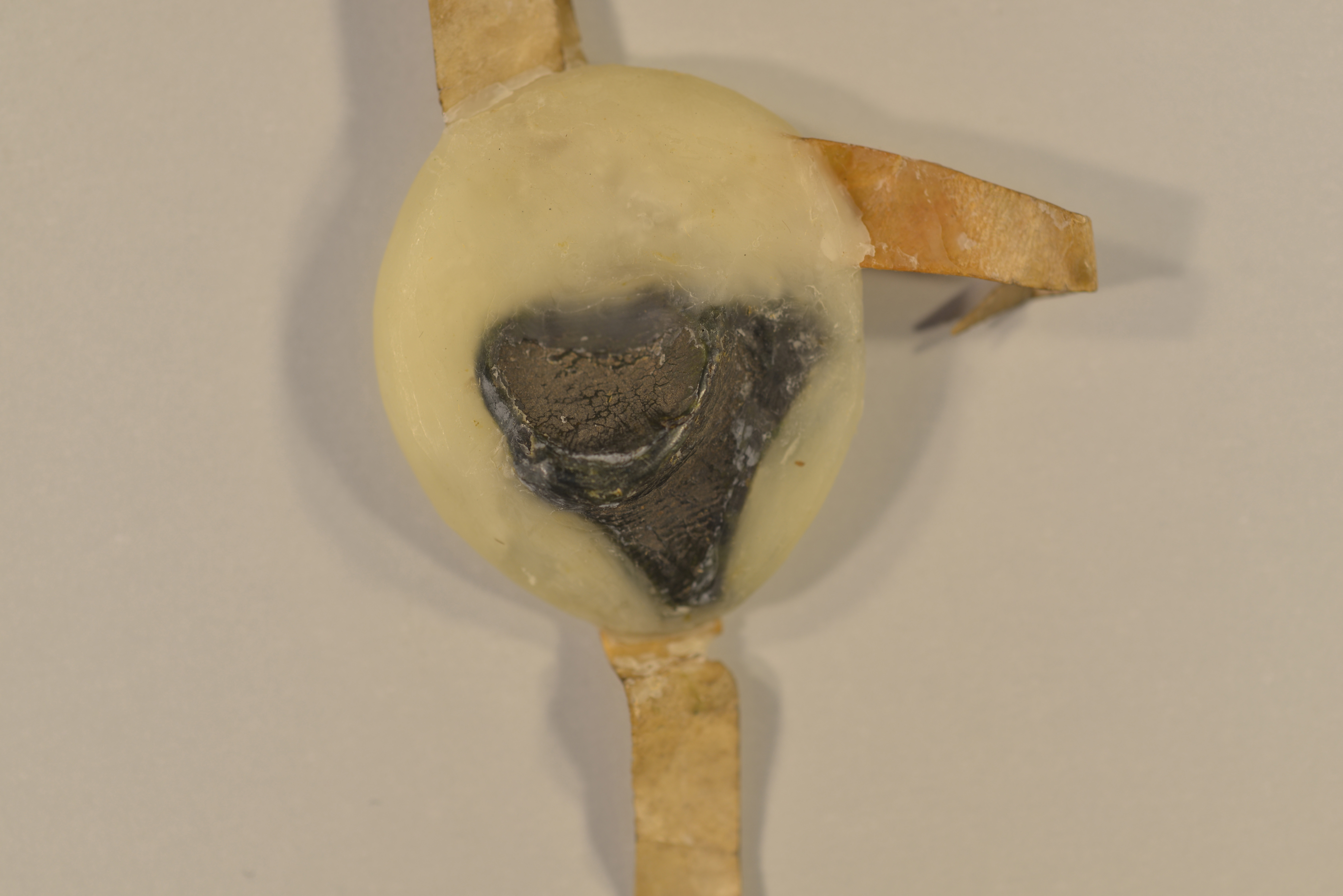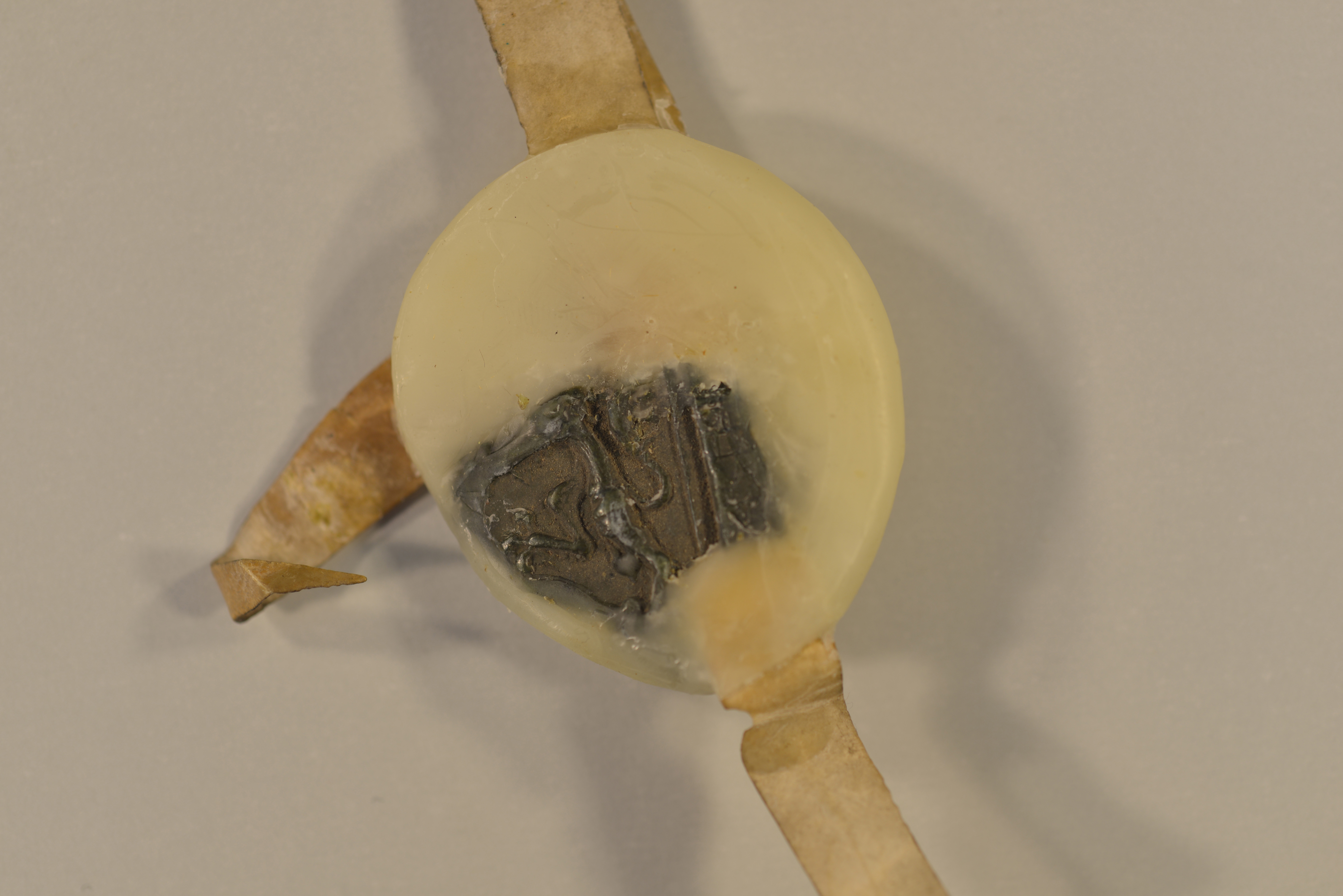 | Schöffen von Koslar, Rundsiegel an Siegelpressel, Plica, gebrochen, Fragment erhalten, mit Wachs fixiert |