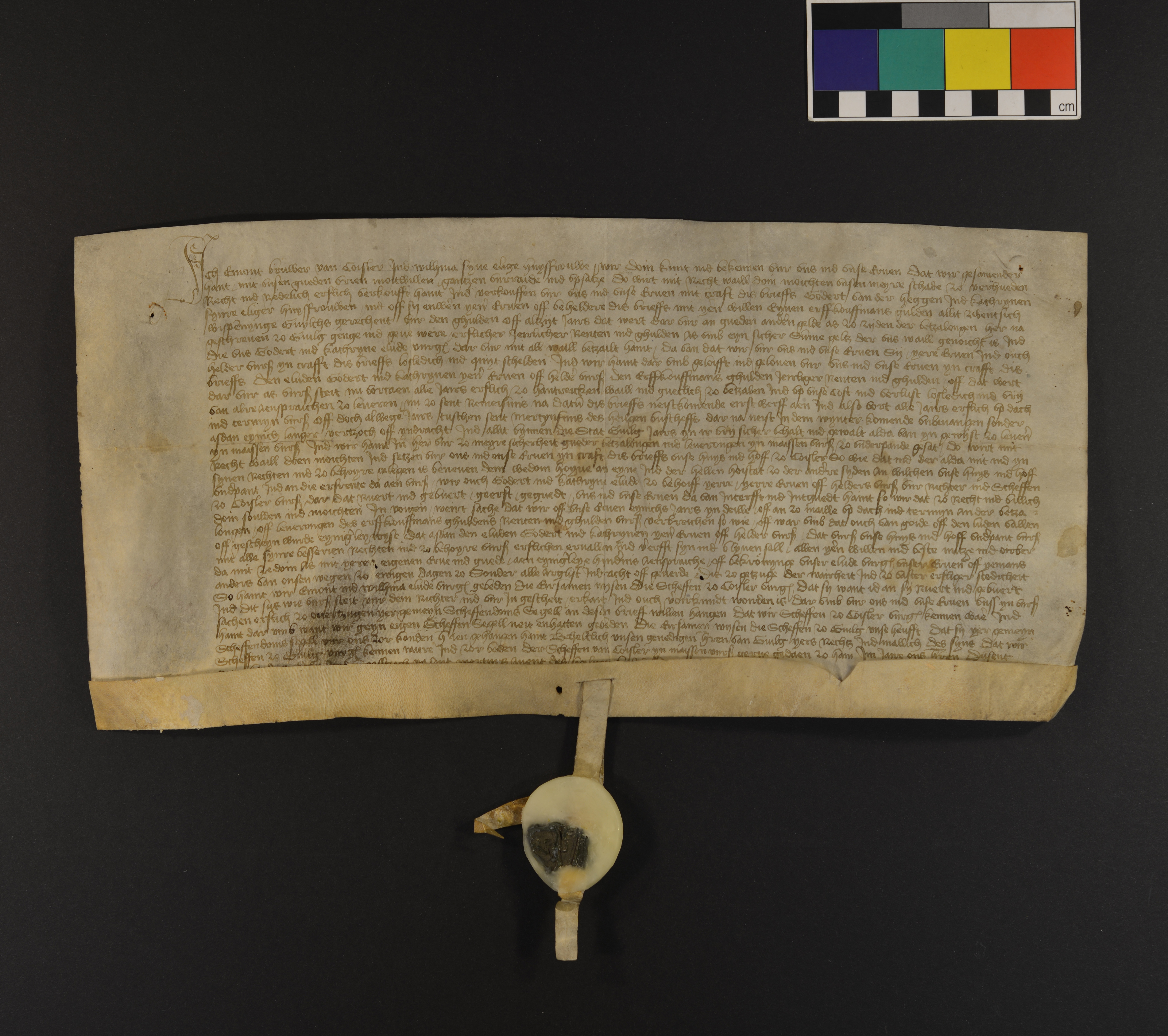 Emont Bruwer von Coisler und seine Gattin Wilhma verkaufen vor den Schöffen zu Coisler Godert van der Heggen und seiner Gattin Kathryne eine Jahresrente von 1 Gulden zu 20 Jüli- cher Weißpfennigen für eine Summe Geldes und setzen zum Pfand ihr Haus & Hof zu Coisler, gelegen ”beneuen dem wedom hoyne an eyne ind der hellen hoistat zo der andre syden”. Or. Pg. m. anh. Schöff.-Siegel (sehr verletzt) von Jülich (da die Schöffen v. Coislar (Koslar) kein eignes Sieg, haben). |