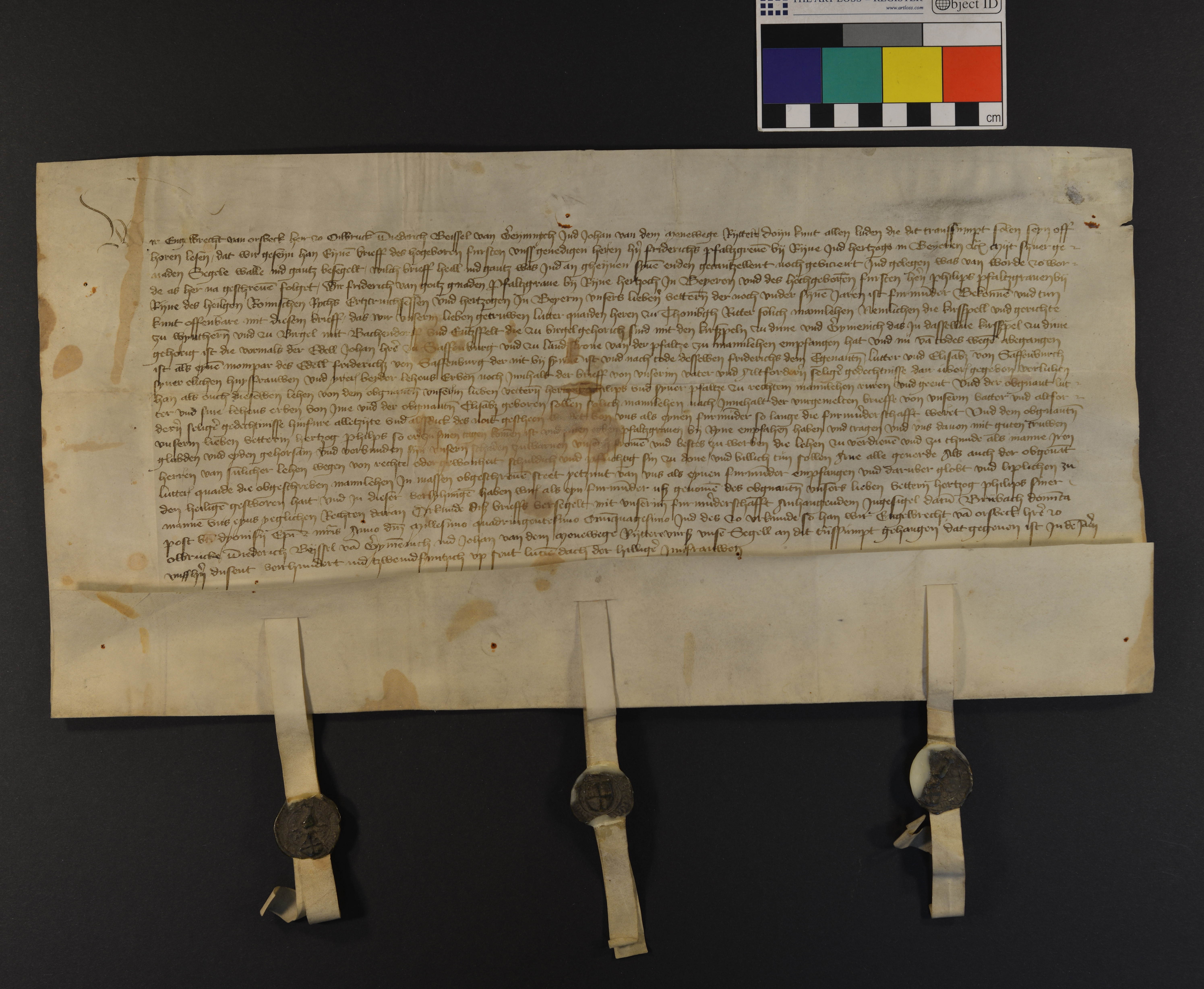 | Engelbrecht van Orsbeck, Dietrich Beissel van Gymnich und Johann van dem Menewege transsumieren eine Urkunde des Pfalzgrafen Friedrich bei Rhein über die Belehnung verschiedener Lehen an Lutter Quaiden. |