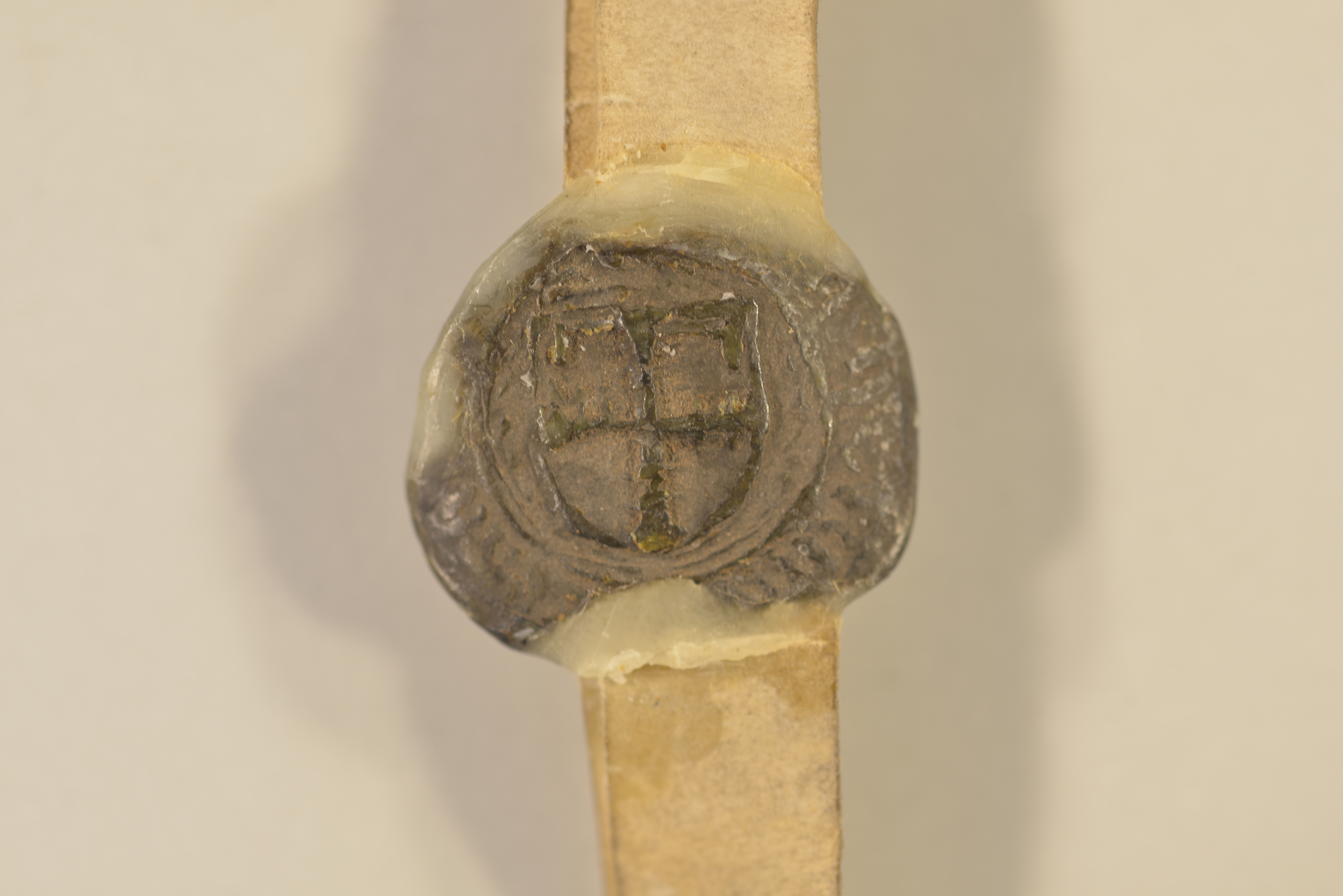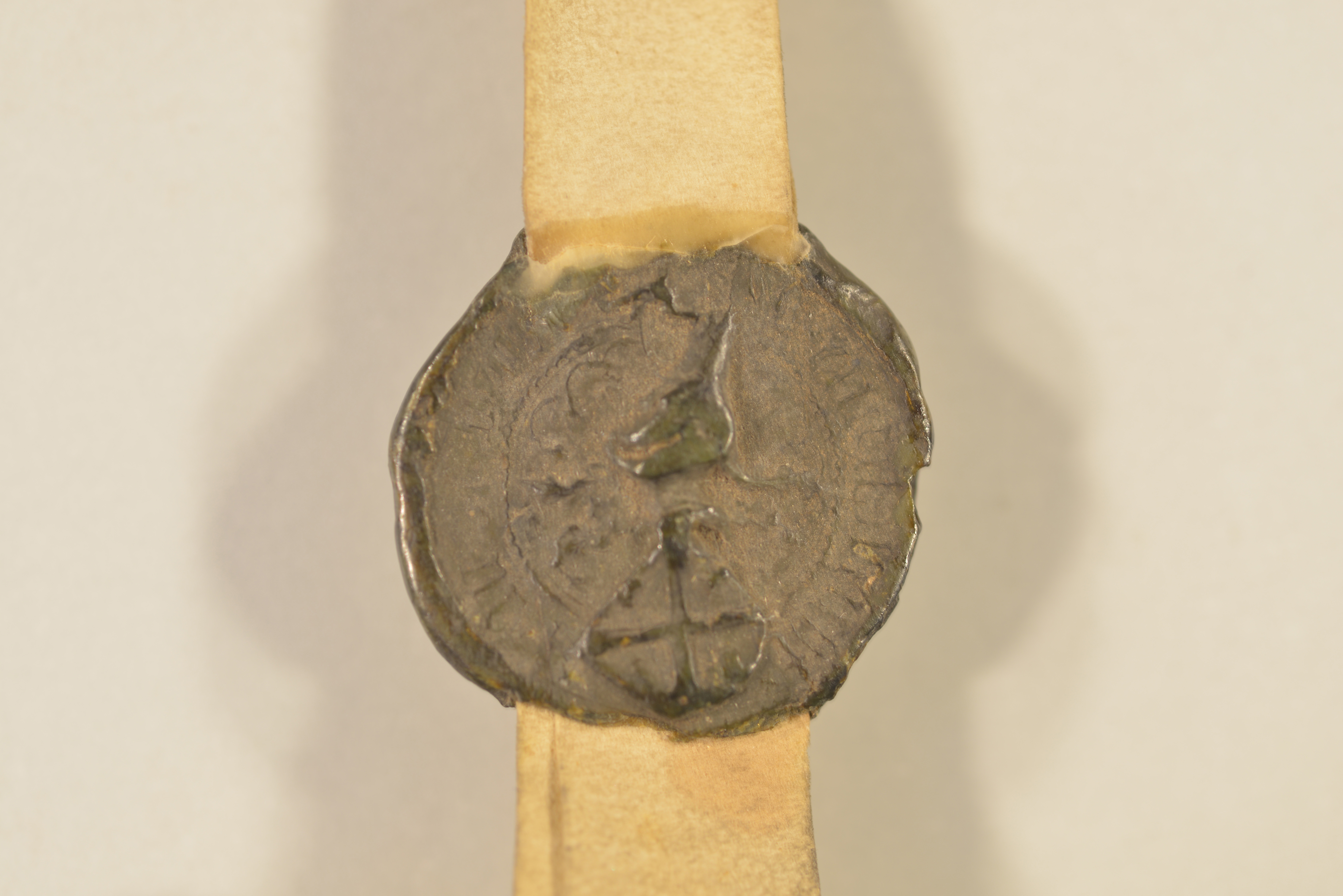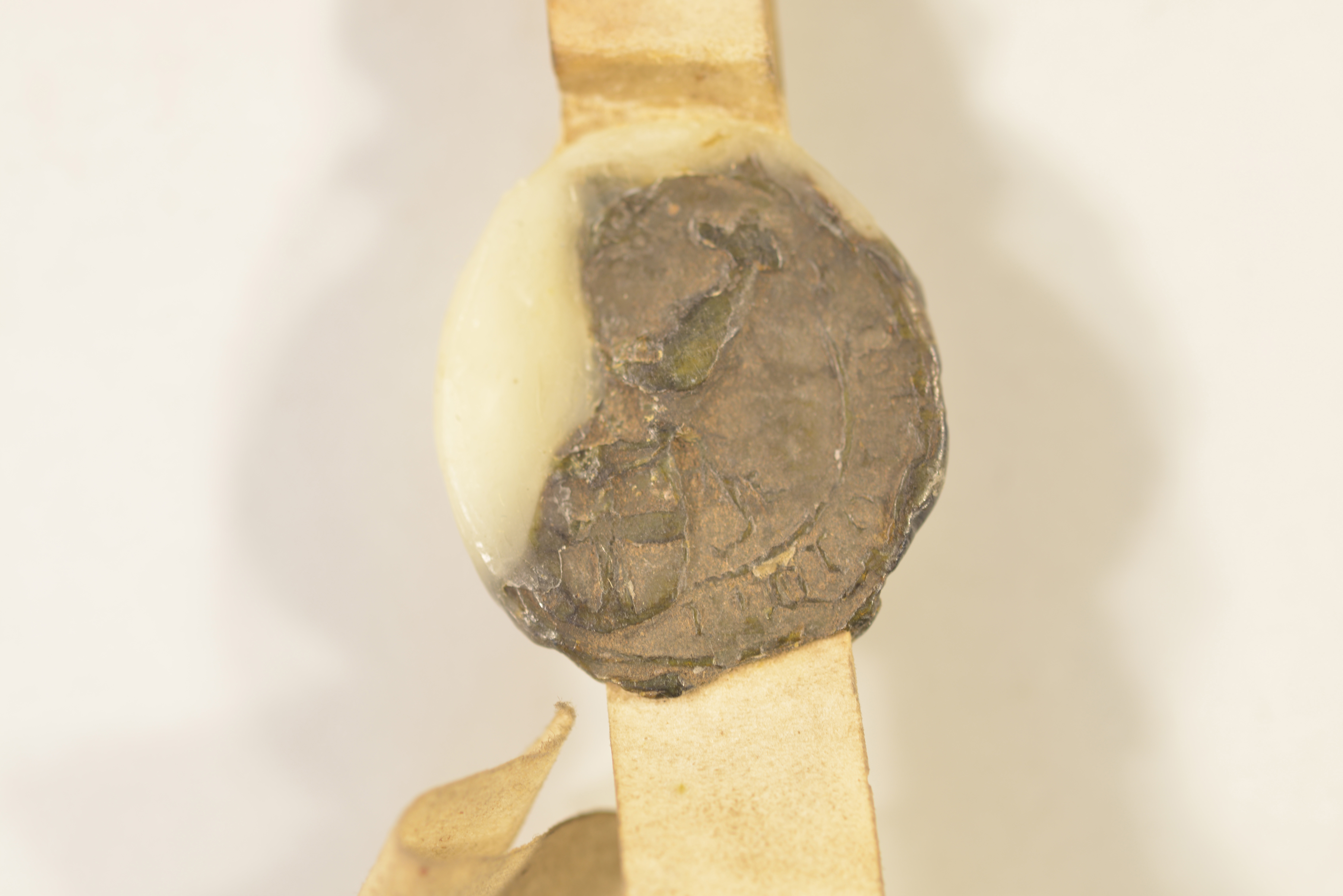 Engelbrecht van Orsbeck, Ovalsiegel an Siegelpressel, Plica, Durchmesser: 2,8/2,6/2,8 cm, schwarzes Wachs, gebrochen, Fragment erhalten, restauriert Dietrich Beissel van Gymnich Johann van dem Menewege |