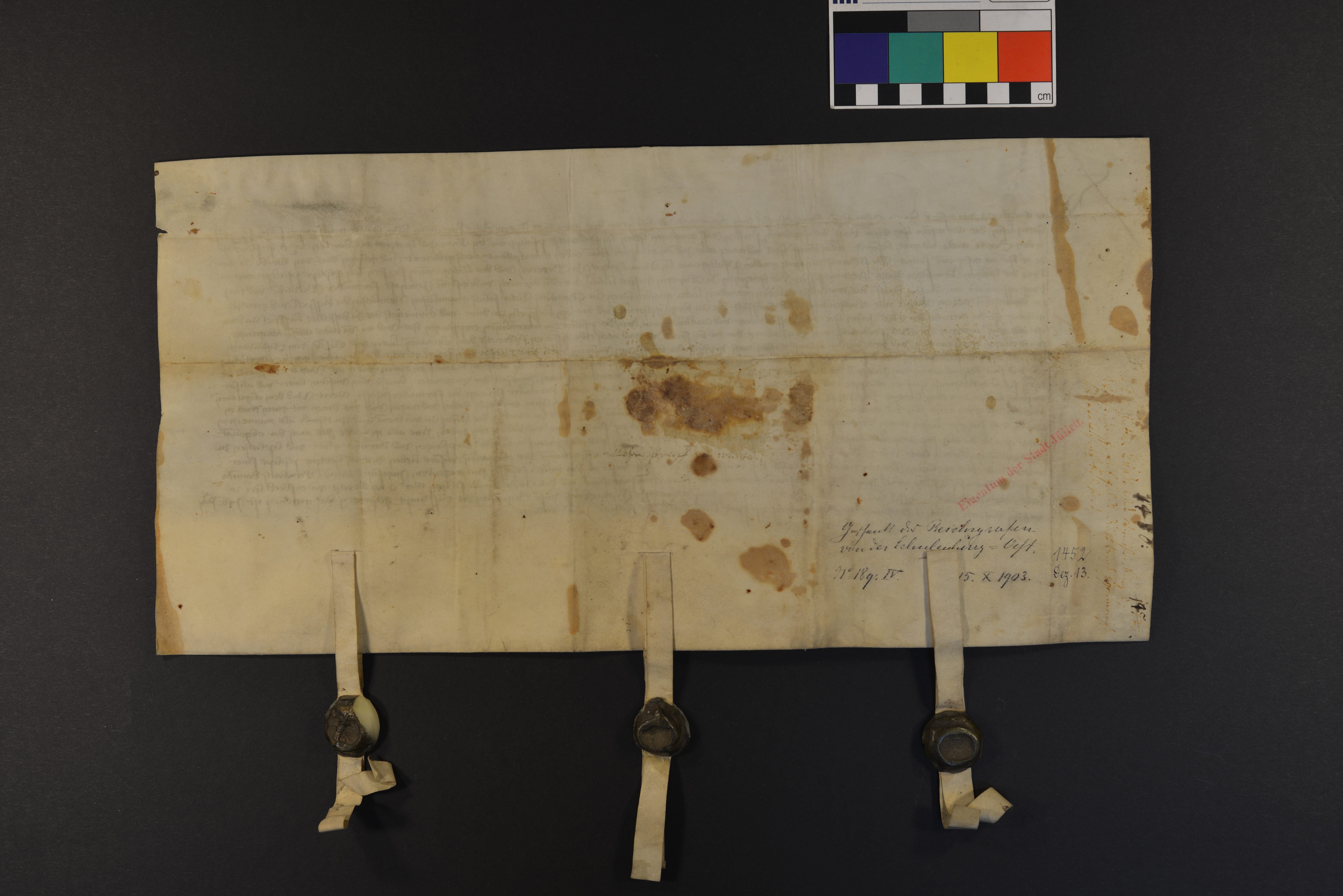 | Höhe: 23 cm, Breite: 35,5 cm, Ausfertigung, Pergament Manuskript, recto und verso beschriftet, 22 Zeilen |
