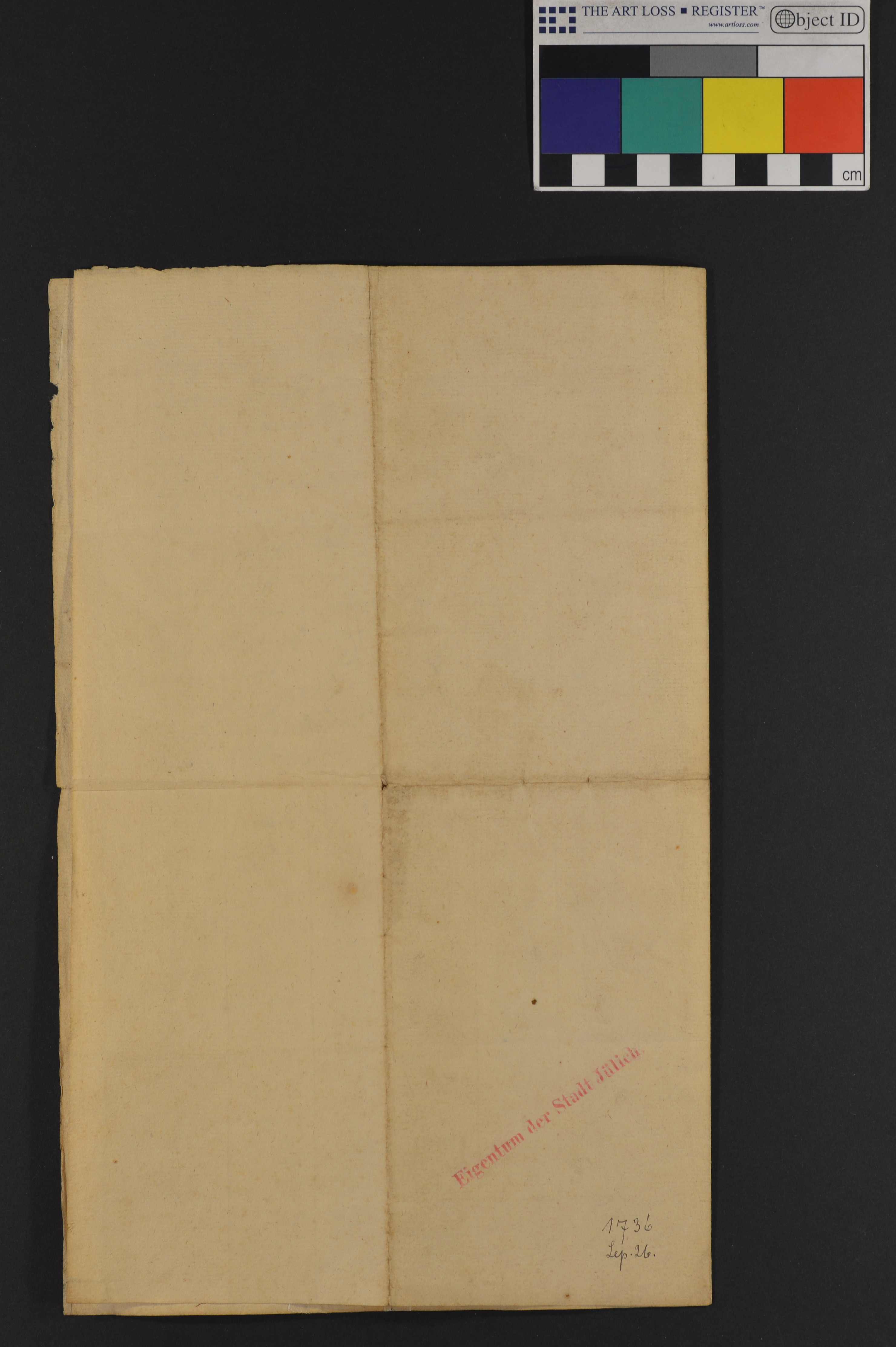 | Höhe: 31 cm, Breite: 39 cm, Ausfertigung, Papier mit Wasserzeichen, Manuskript, recto (30 Zeilen) und verso (14 Zeilen) beschriftet |