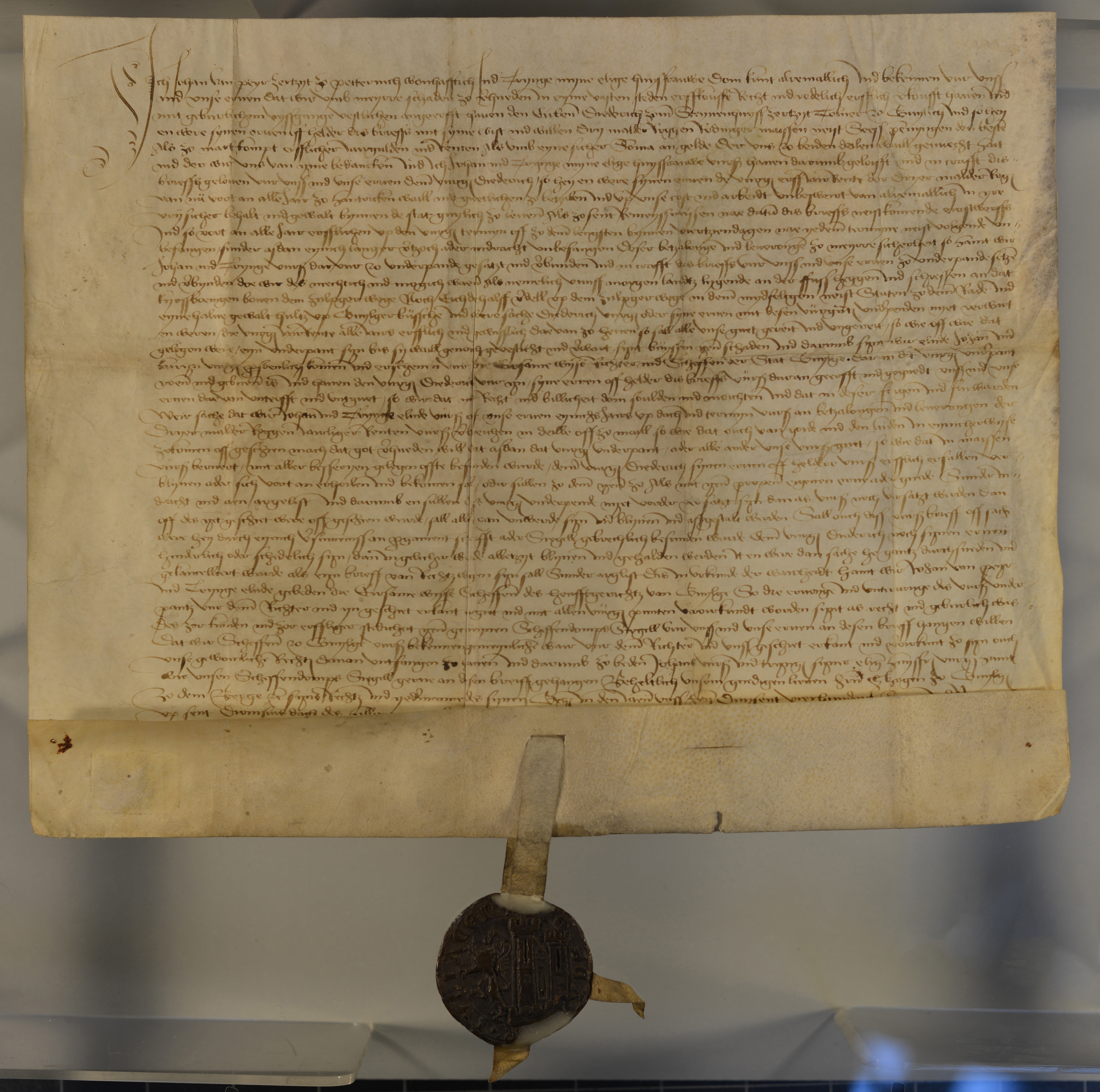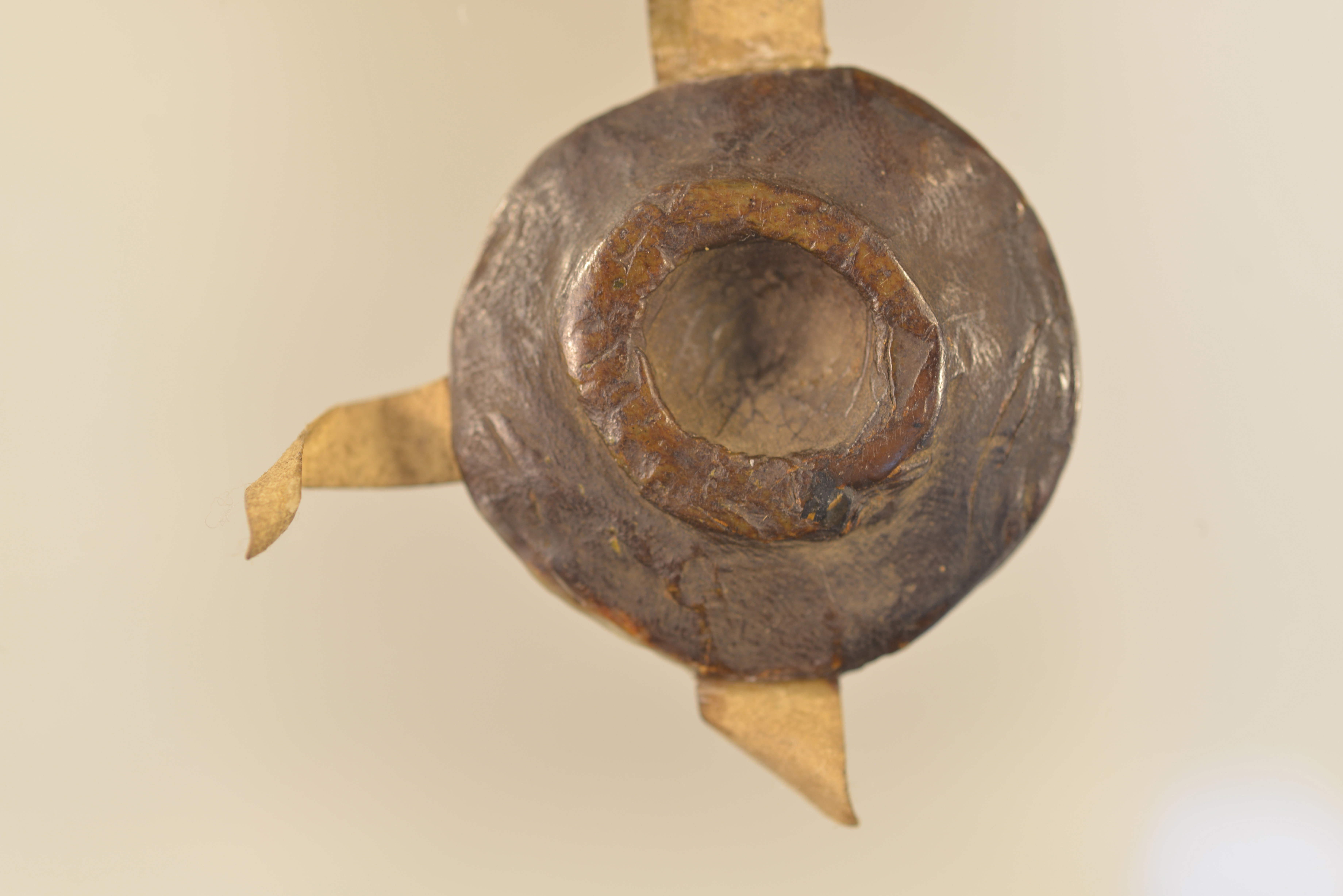 | Schöffen von Jülich, Schwarzes Rundsiegel an Siegelpressel, Plica, gebrochen, Fragment erhalten, restauriert, Siegelschnitt für ein weiteres Siegel vorhanden |