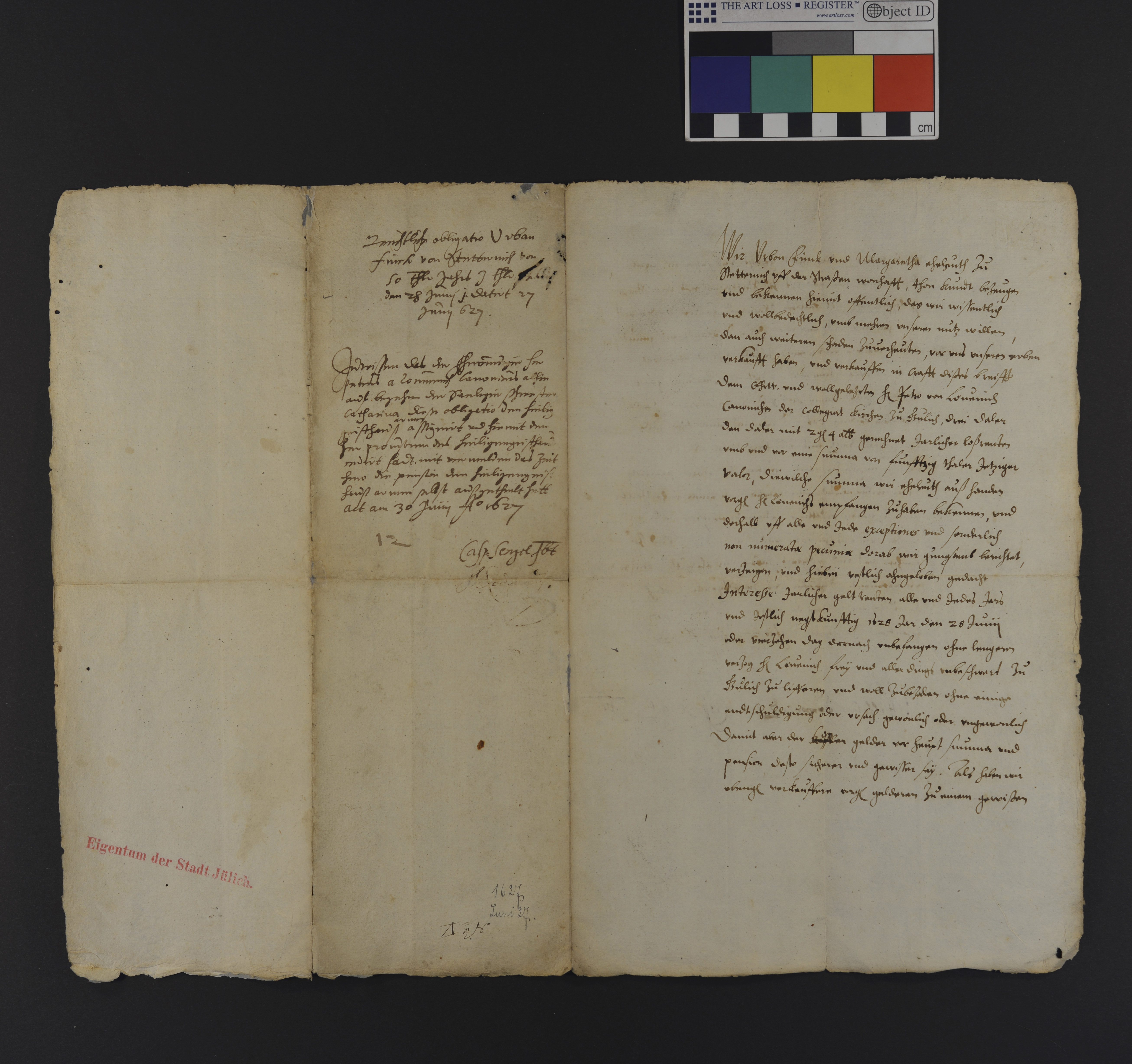 Die Eheleute Urban und Margaretha Funk, wohnhaft zu Stetternich "vff der Strassen", verkaufen für eine Summe von 50 Talern Peter von Louenich (Lövenich (Erkelenz)), Canonicus der Kollegiatkirche zu Gulich (Jülich) eine Jahresrente von 5 Taler, den Taler zu 2 Gulden 4 Albus gerechnet gegen Rückkaufsrecht und setzen zum Pfand ihr Haus und Hof zu Stetternich "vff der Strasse gelegen, ein seidt beneben Weinandt Kalkop, anderseidt die gemeine gass". NB. Auf der Rückseite bezeugt Caspar Sengel, dass Peter von Louenich die gen. Schuldurkunde (Obligation) dem h. Geisthause am 30. Juni 1627 auf "begehr der Seeligen Schwester Catharina" abgetreten (cediert) hat. |