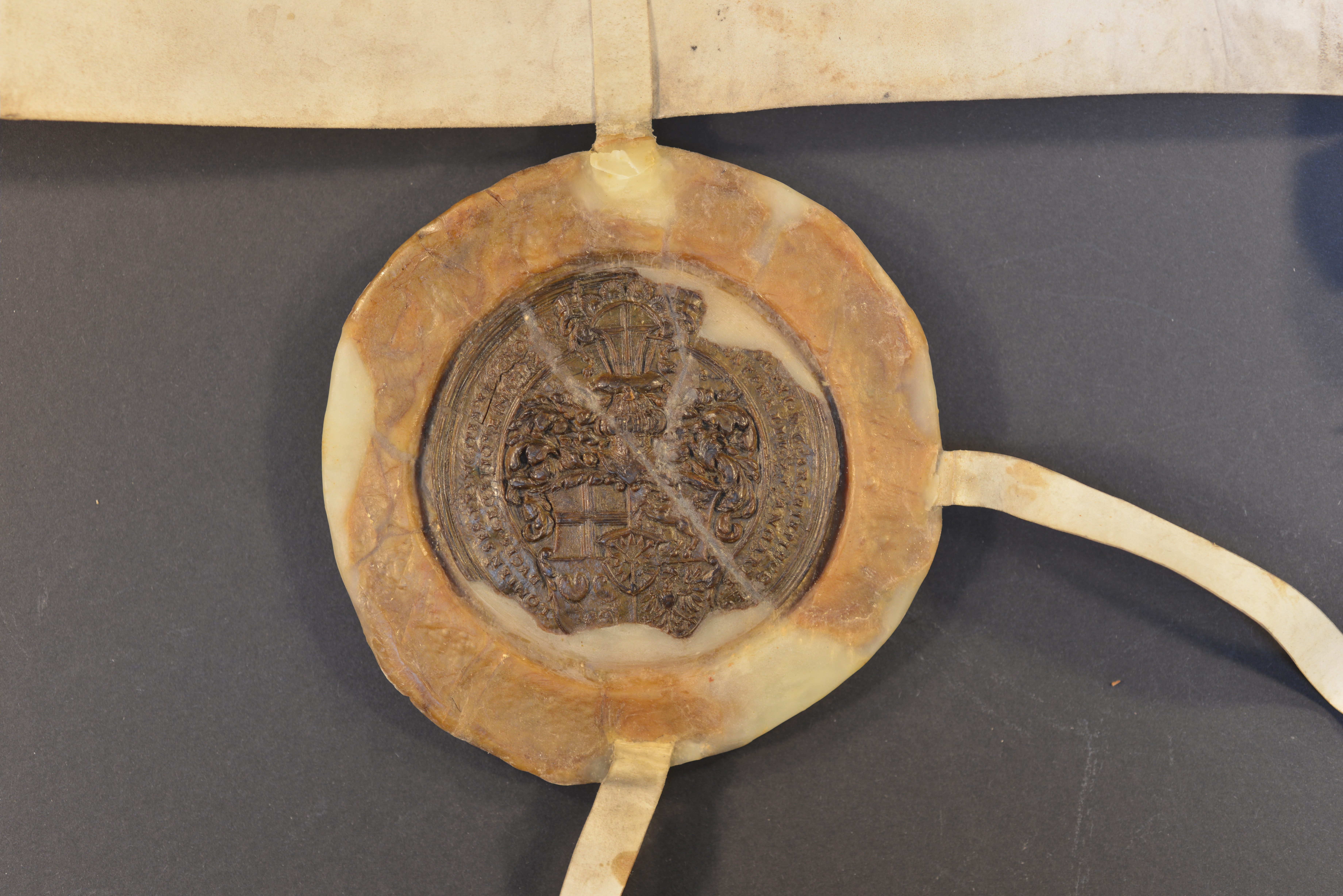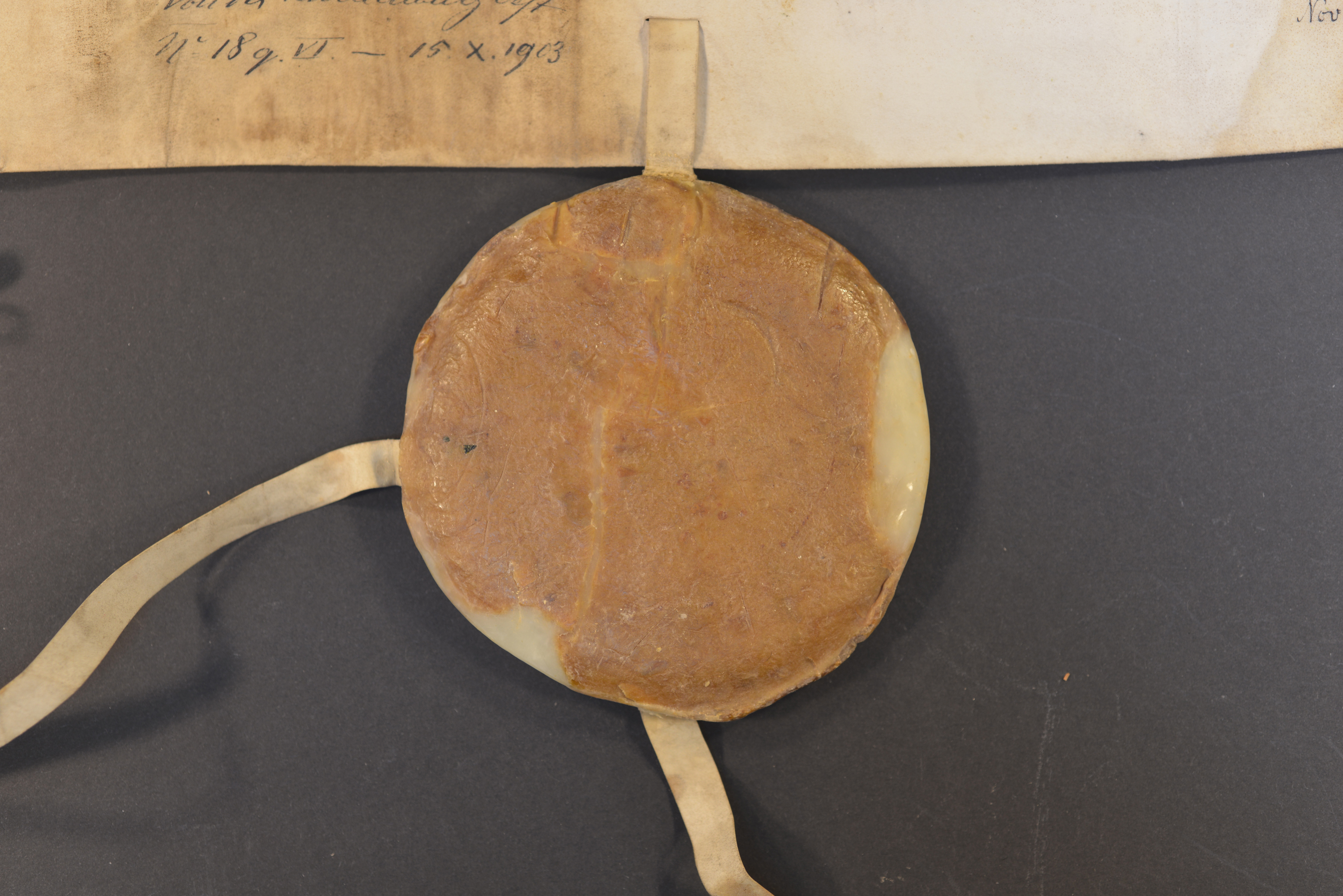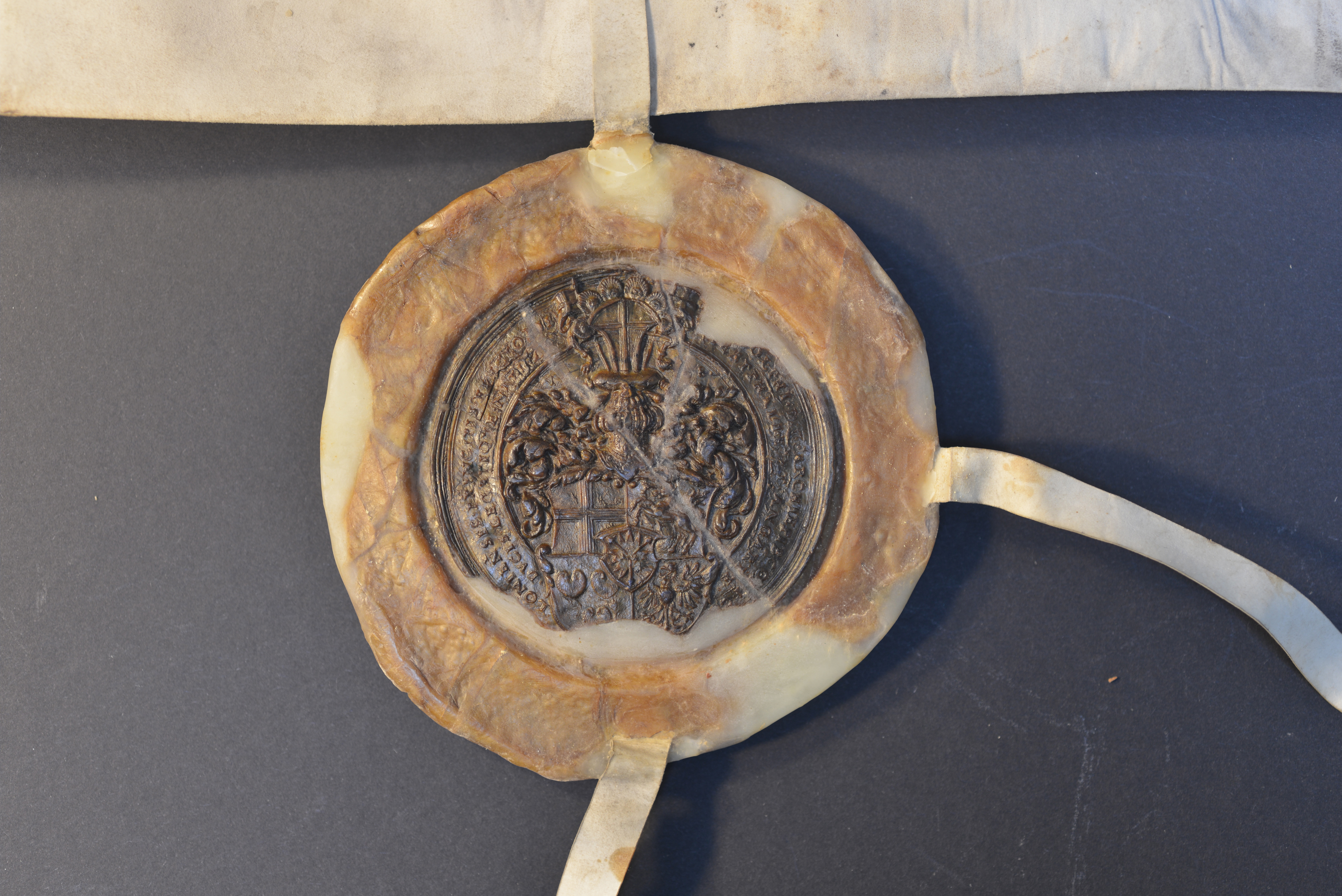 Erzbischof Adolf III. von Köln, Gelbes Rundsiegel in Wachsschale an Siegelpressel, Plica, Durchmesser Siegel: 7 cm, Durchmesser Wachsschale: 10,5 cm, Siegelschnitt und Pressel für das Siegel von Dhaem Spies von Büllesheim, Gut erhaltenes Erzbischofssiegel, zweites Siegel fehlt Dhaem Spies von Büllesheim |