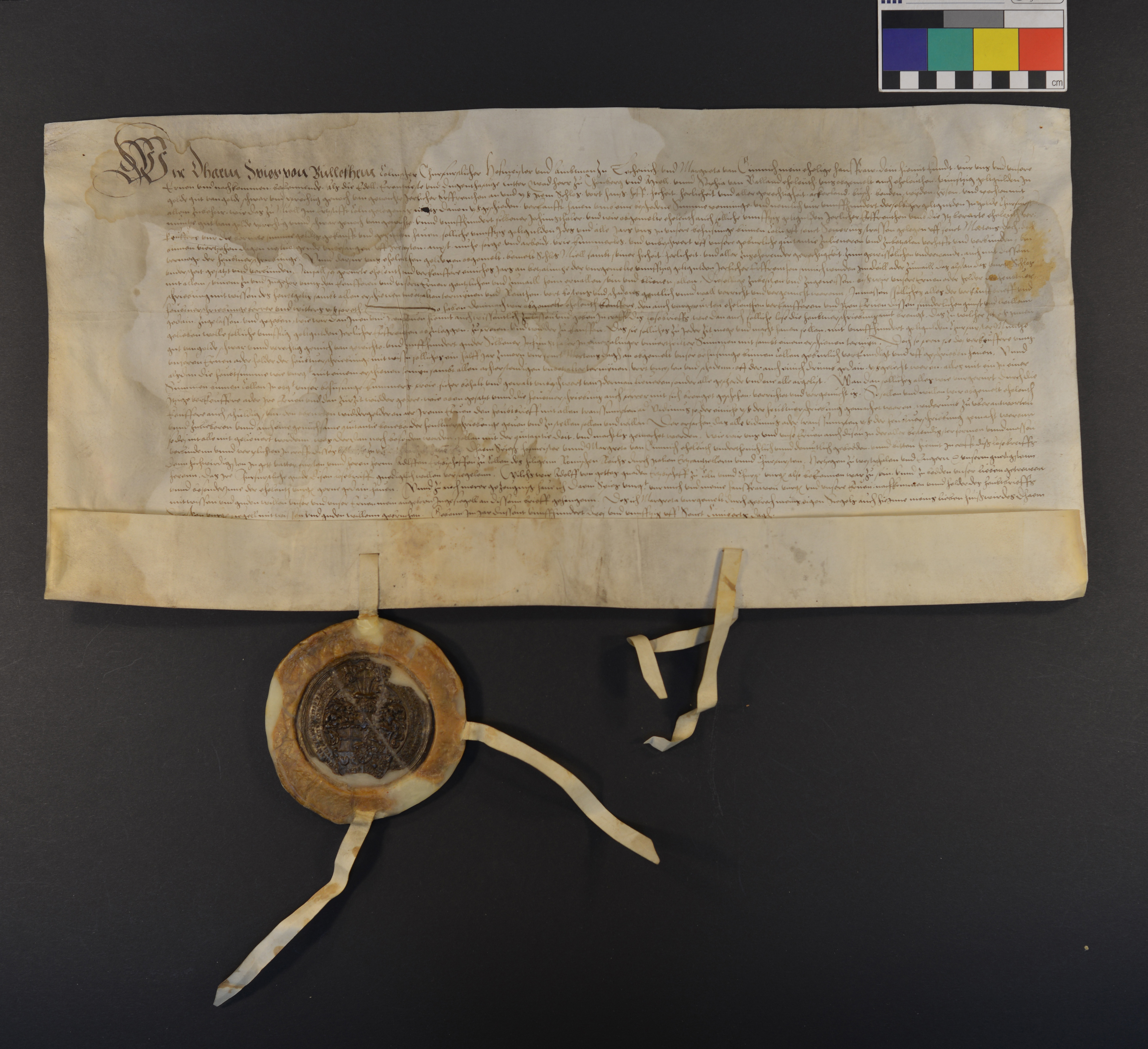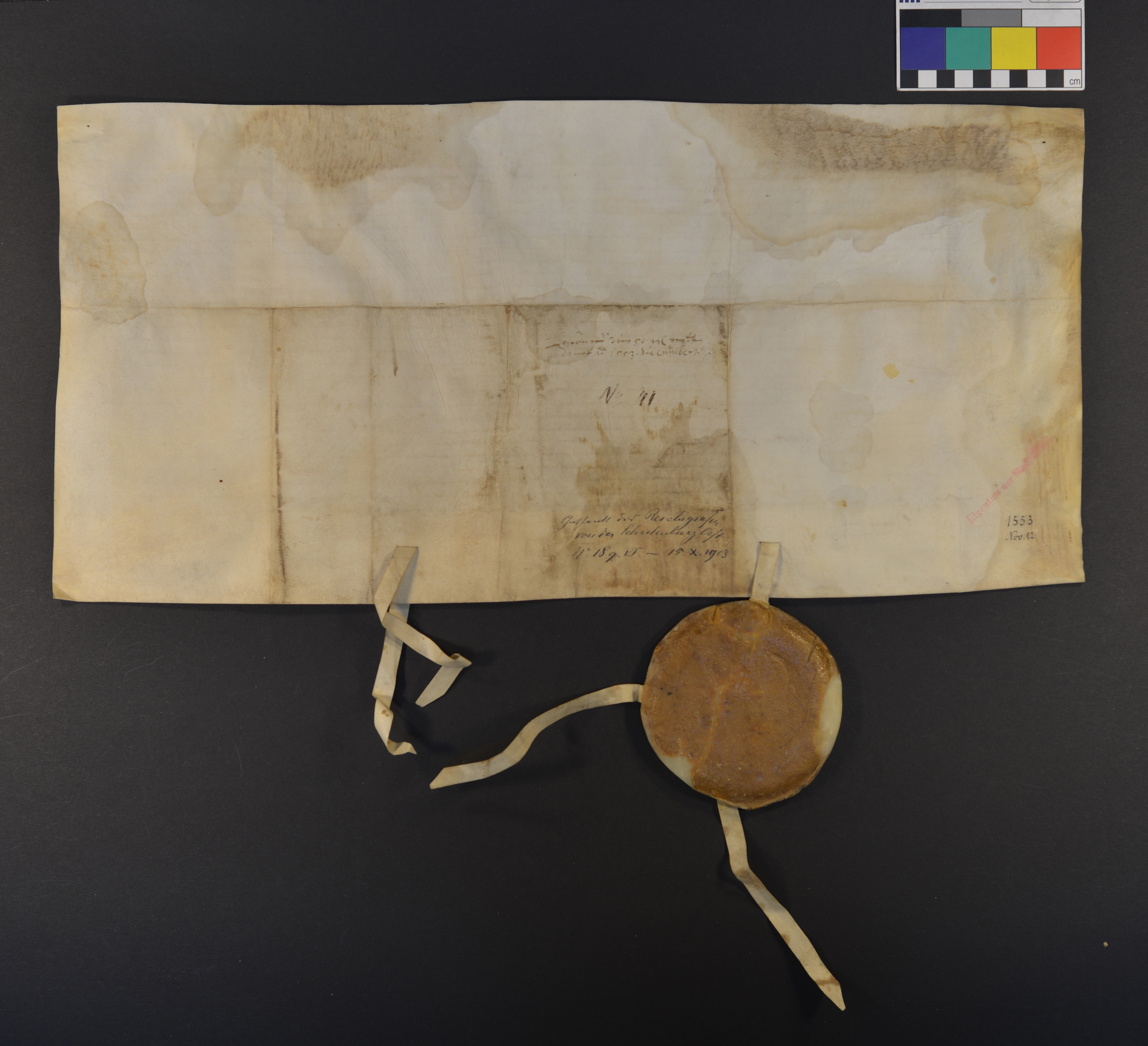 | Höhe: 26 cm, Breite: 56 cm, Ausfertigung, Pergament, Manuskript, recto und verso beschriftet, 28 Zeilen |