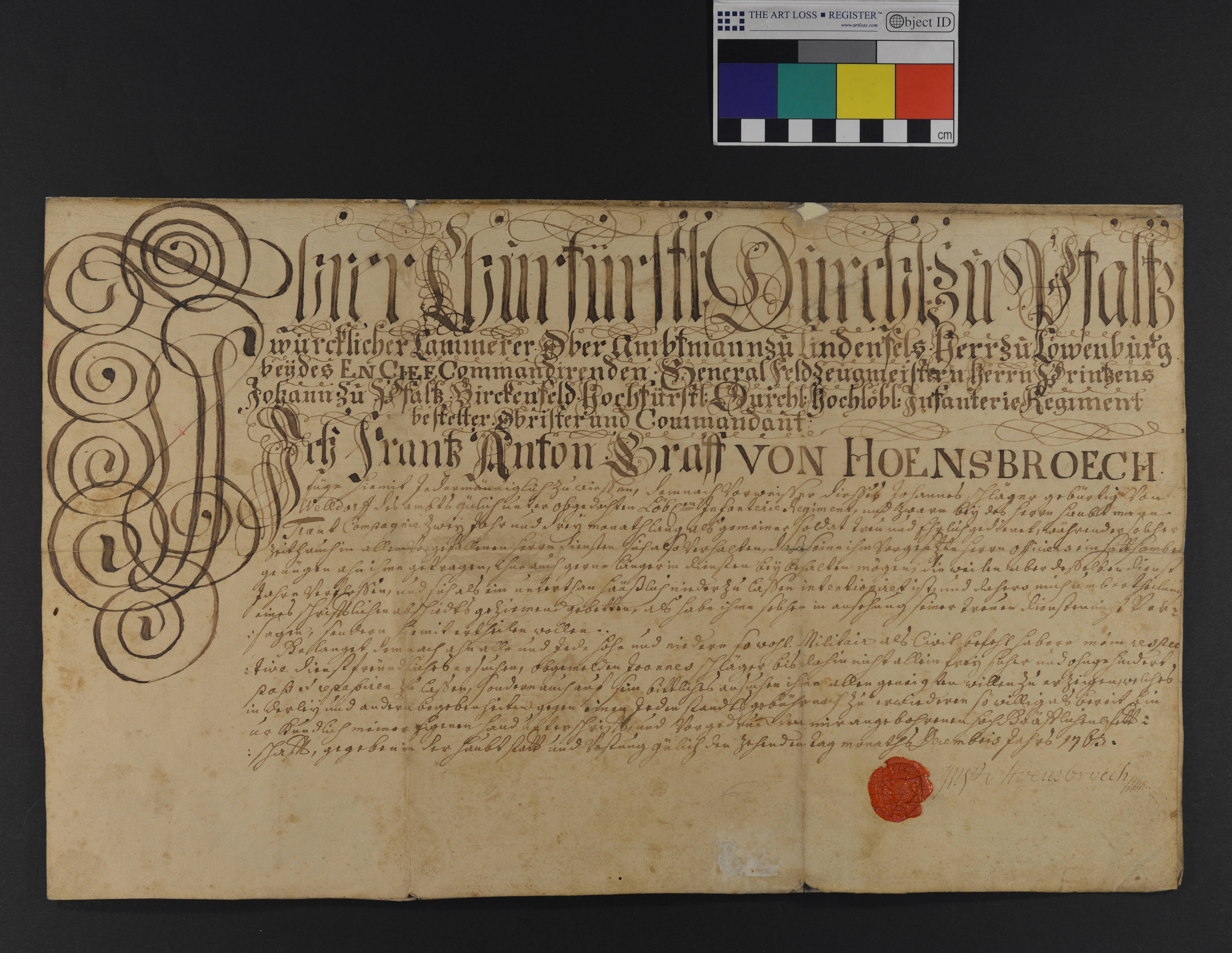 | Frantz Anton, Graf von Hoensbroech (Hoensbroek), Kurpfälz. Kämmerer, Oberamtmann zu Lindenfals, Herr zu Löwenburg, Oberst bei dem Inf. Reg. des kommandierenden General-Feldzeugmeisters, des Prinzen Johann zu Pfalz-Birckenfeld, gewährt dem Gemeinen Johann Schläger aus Welldorf gebürtig nach 2 1/4 jähr. Dienstzeit in der Kompagnie des Hauptmanns Trant den Abschied. |