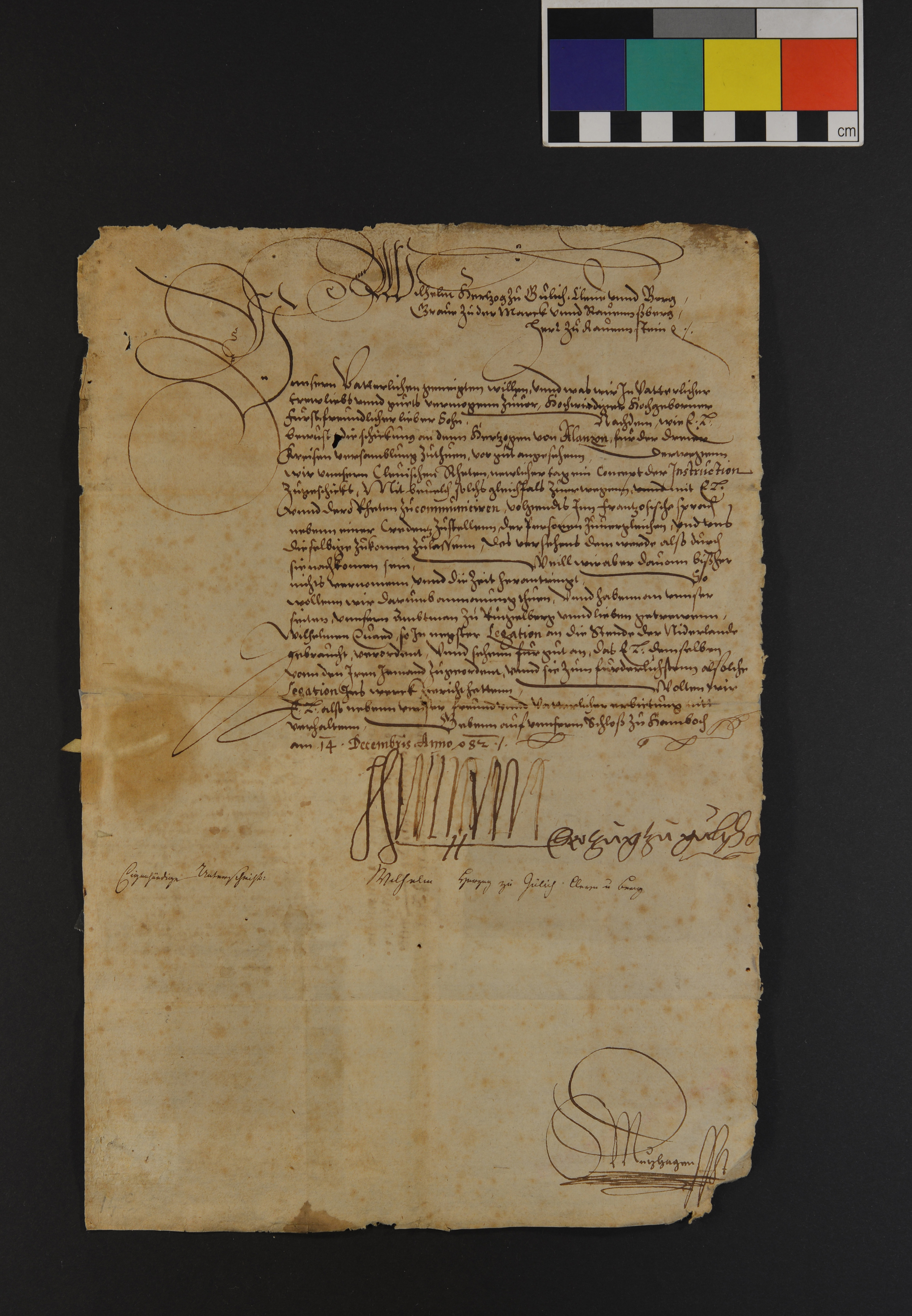| Wilhelm, Herzog zu Gulich (Jülich), Cleue (Kleve), Berg, Graf zu der Marck und Rauensberg, Herr zu Rauenstein fordert seinen Sohn Johann Wilhelm, Administrator des Stifts Münster, Herzog zu Gulich, Cleue, Berg, etc. in einem Briefe auf, dem von ihm an die Stände der Niederlande abgeordneten Wilhelm Chuand Amtmann von Ringelberg, auch seinerseits eine Persönlichkeit hinzuzufügen. |
